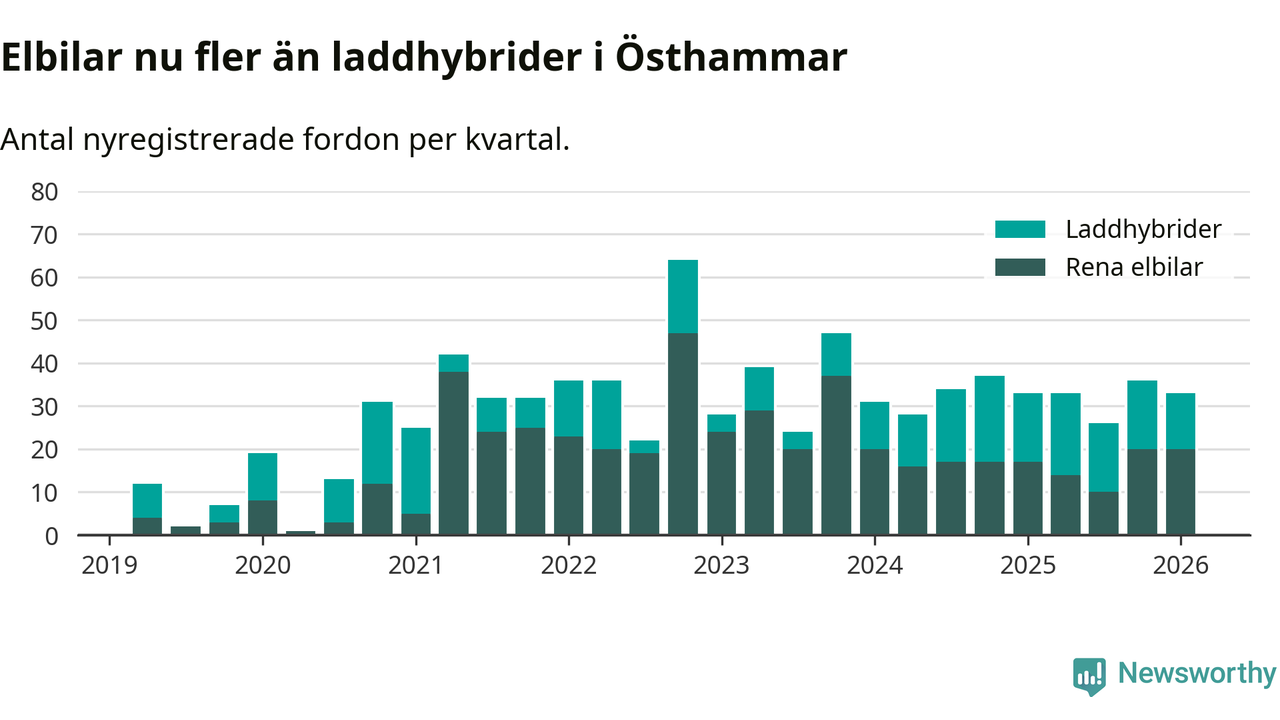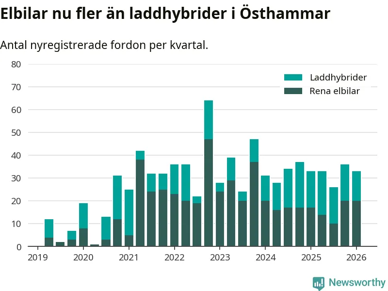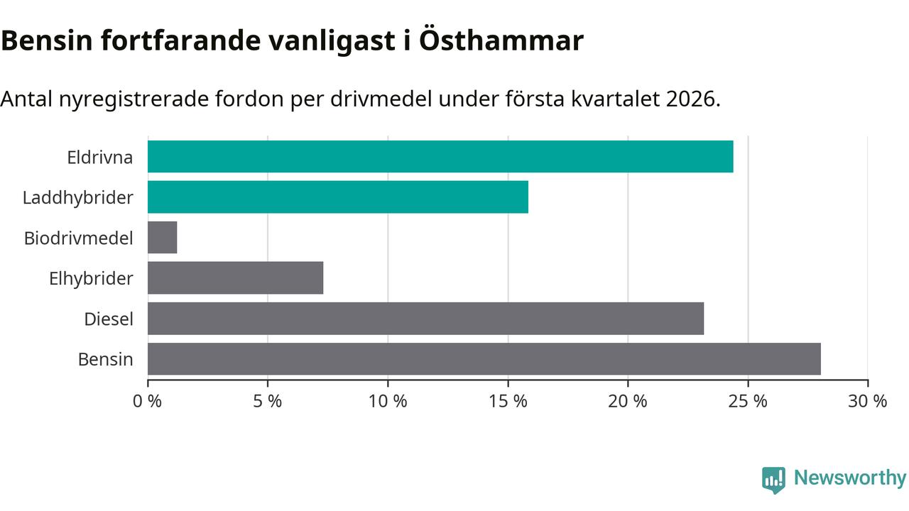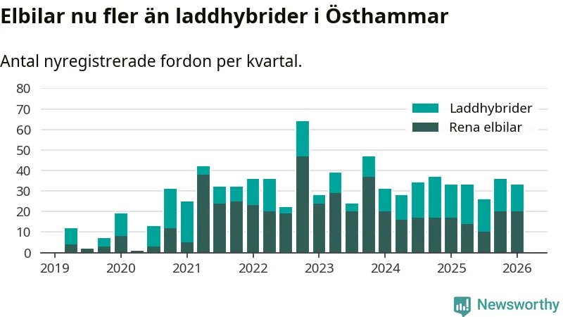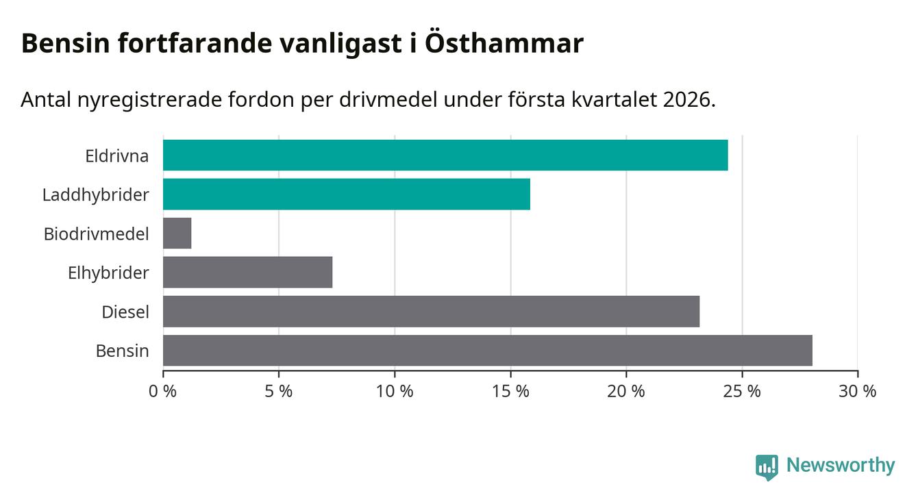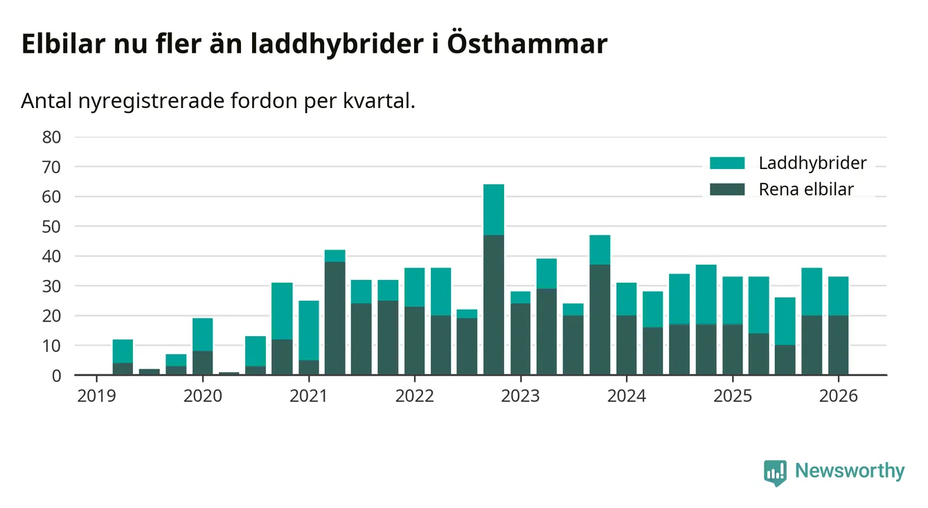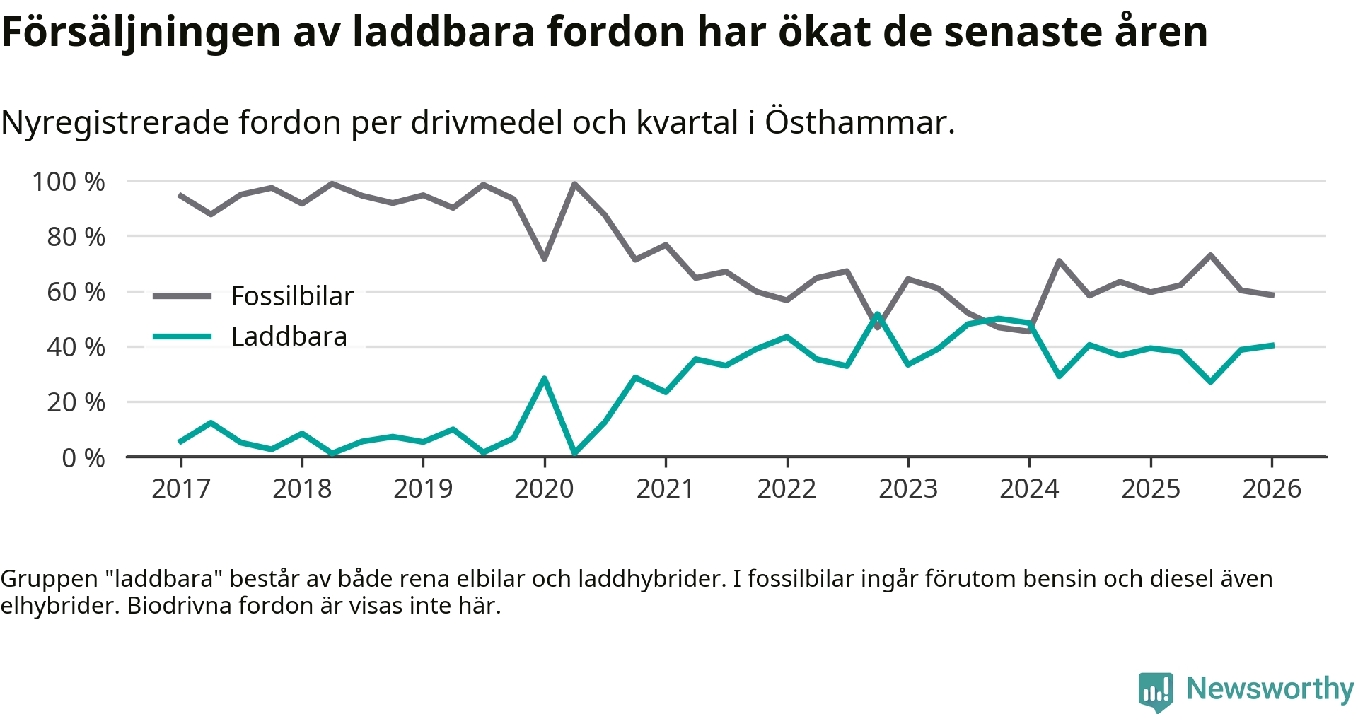 Under första kvartalet 2026 var 40 procent av alla nyregistrerade personbilar i Östhammar laddbara (sammanlagt registrerades 82 nya bilar). Merparten av de laddbara bilarna var rena elbilar (24 procent av alla).