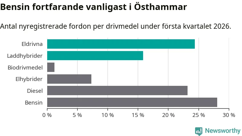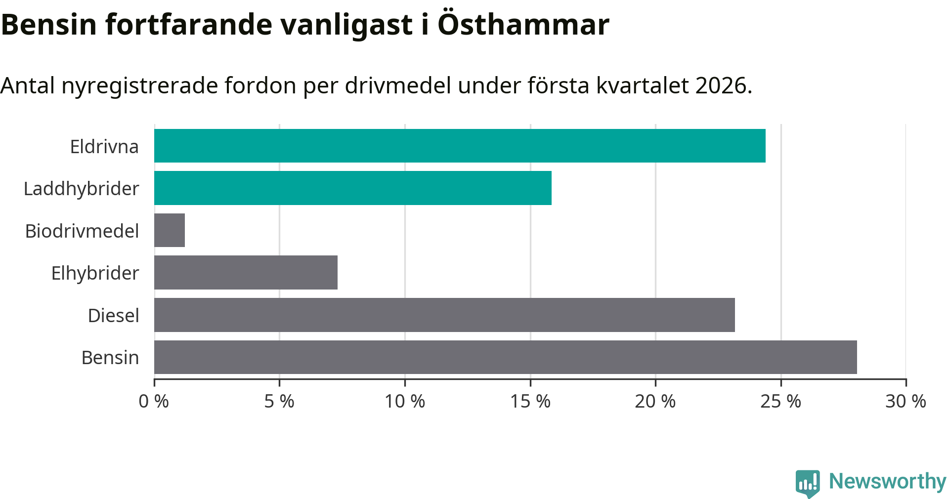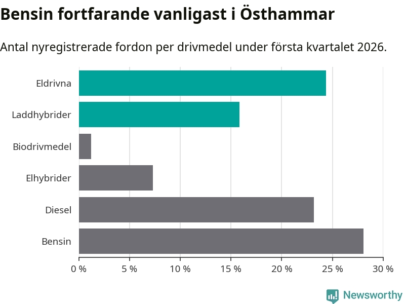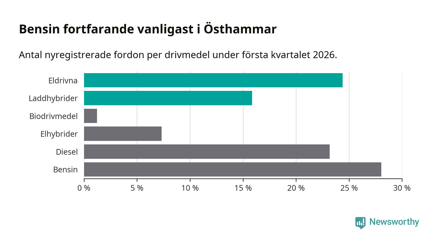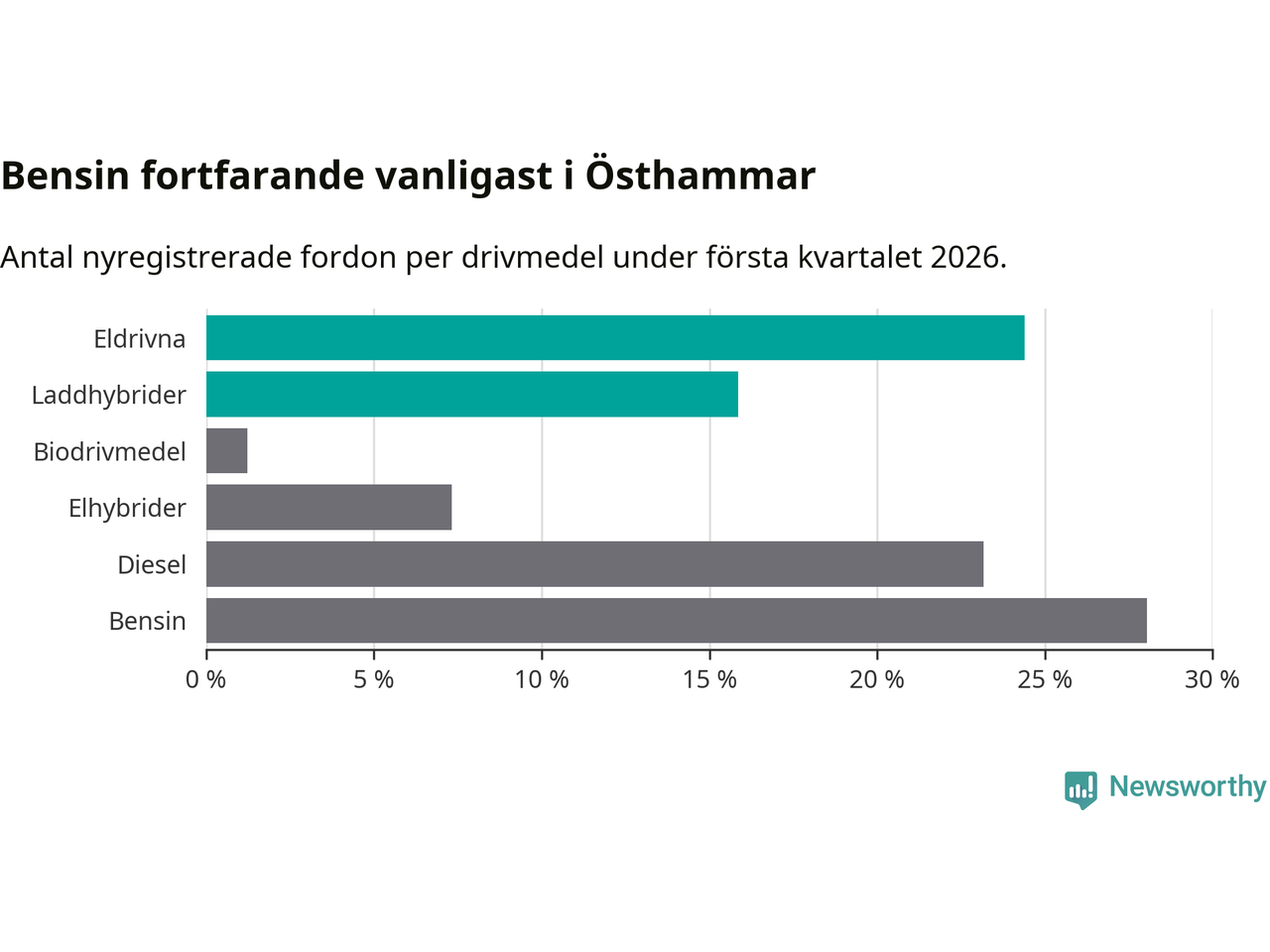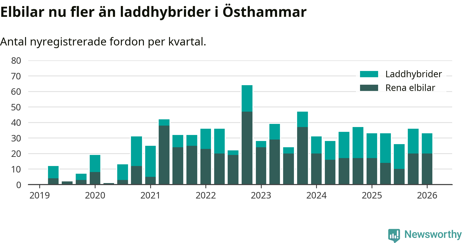 Under första kvartalet 2026 var 40 procent av alla nyregistrerade personbilar i Östhammar laddbara (sammanlagt registrerades 82 nya bilar). Merparten av de laddbara bilarna var rena elbilar (24 procent av alla).