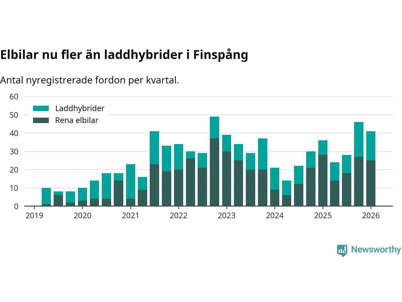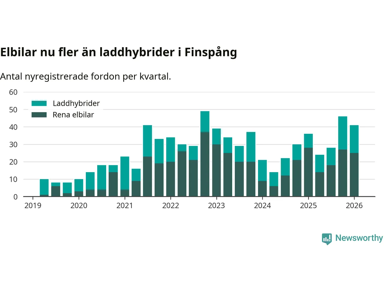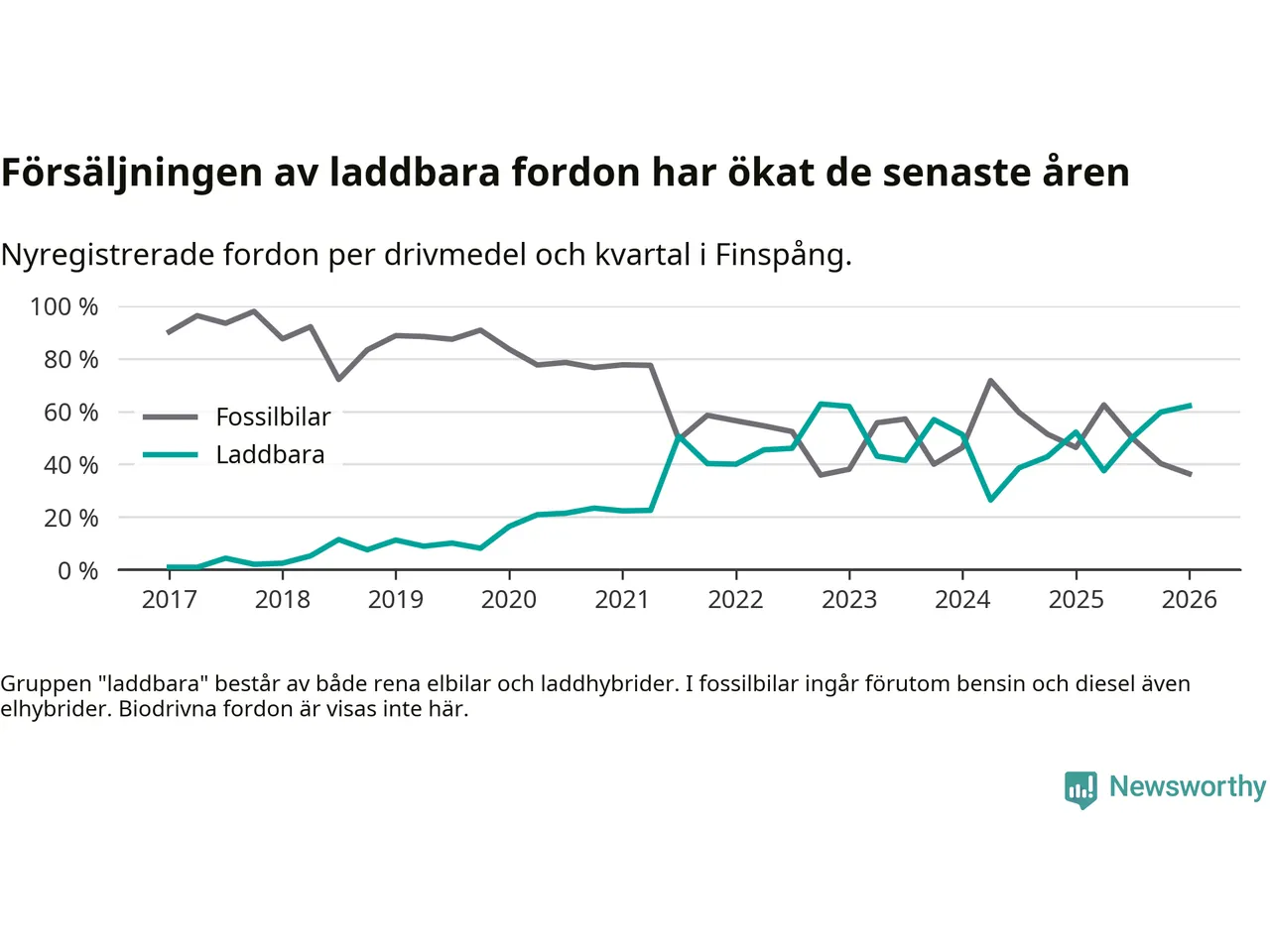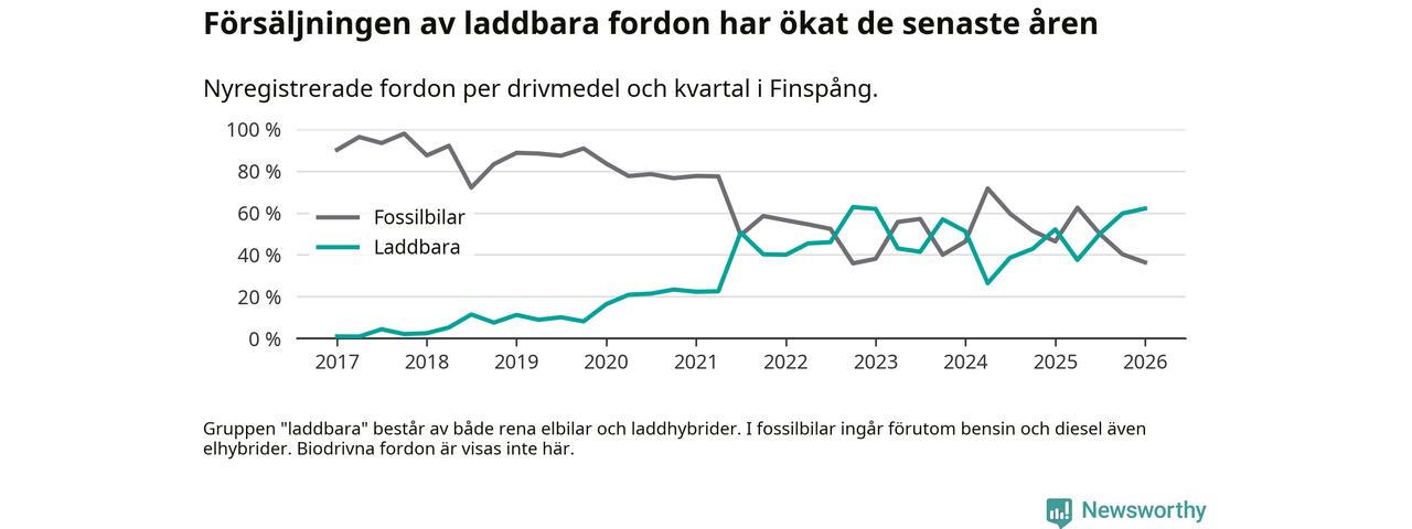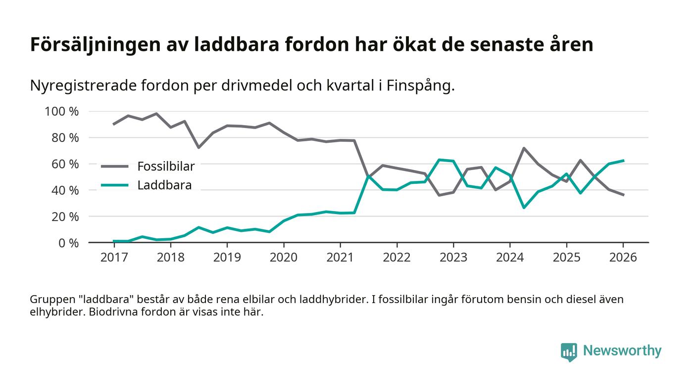 Under första kvartalet 2026 var 62 procent av alla nyregistrerade personbilar i Finspång laddbara (sammanlagt registrerades 66 nya bilar). Merparten av de laddbara bilarna var rena elbilar (38 procent av alla).