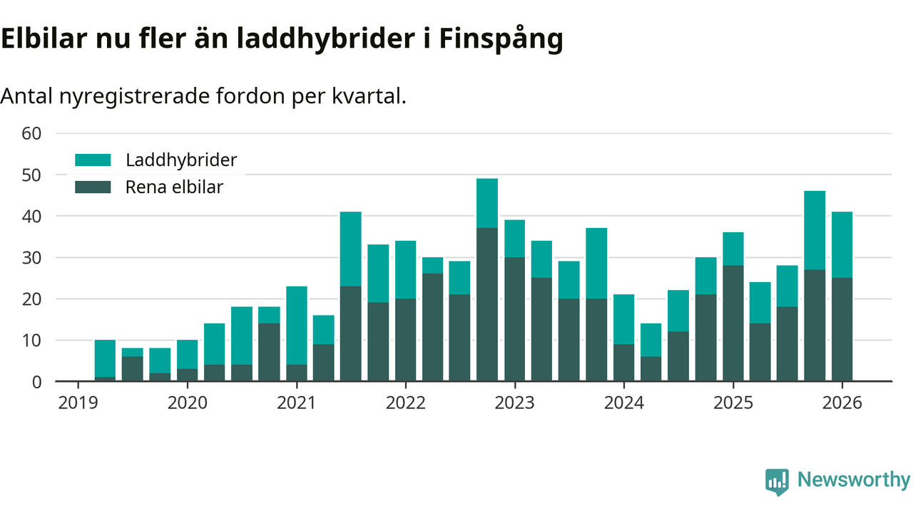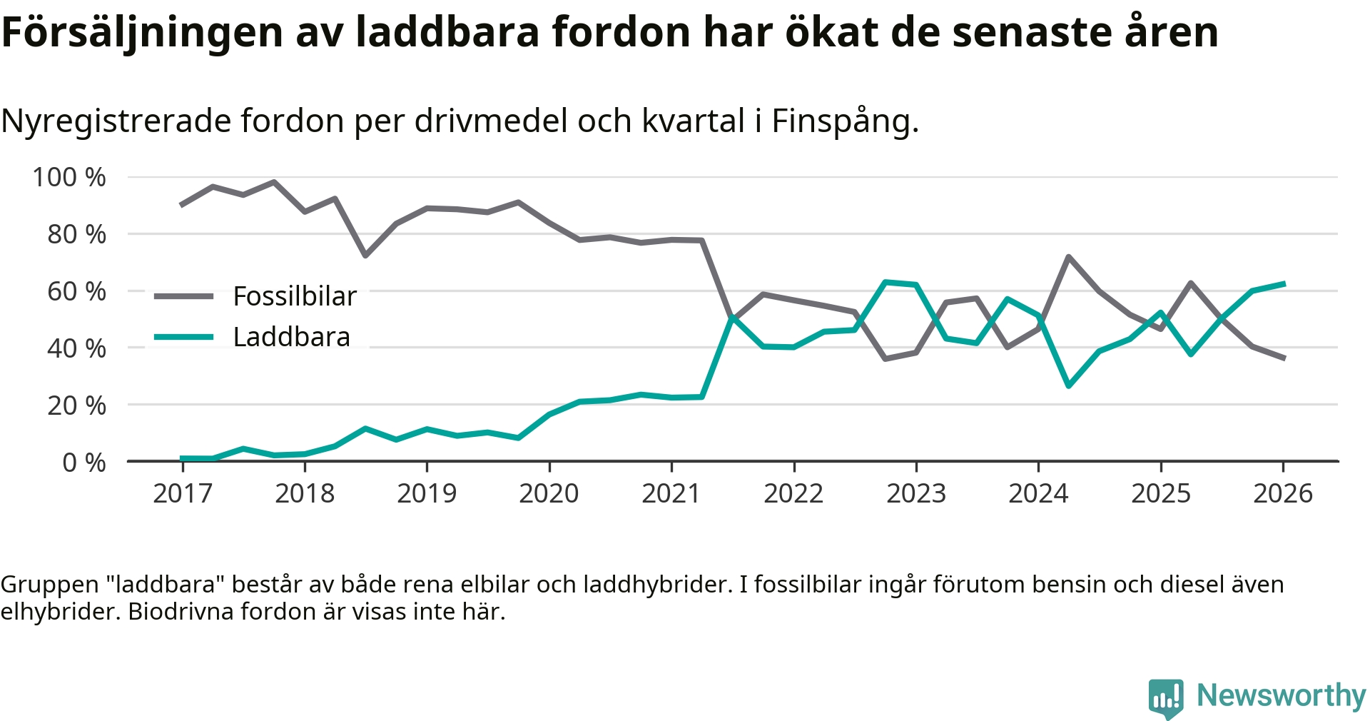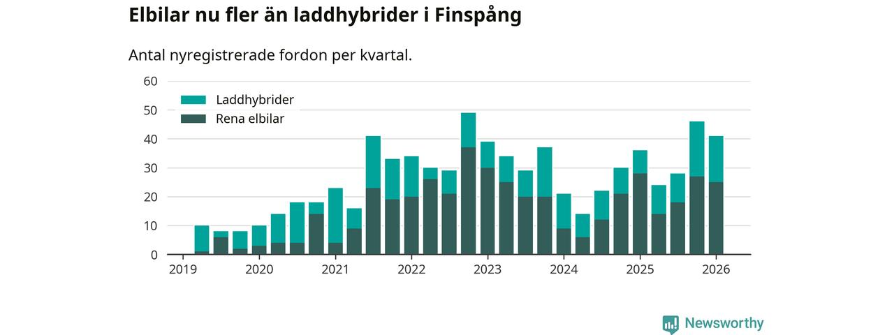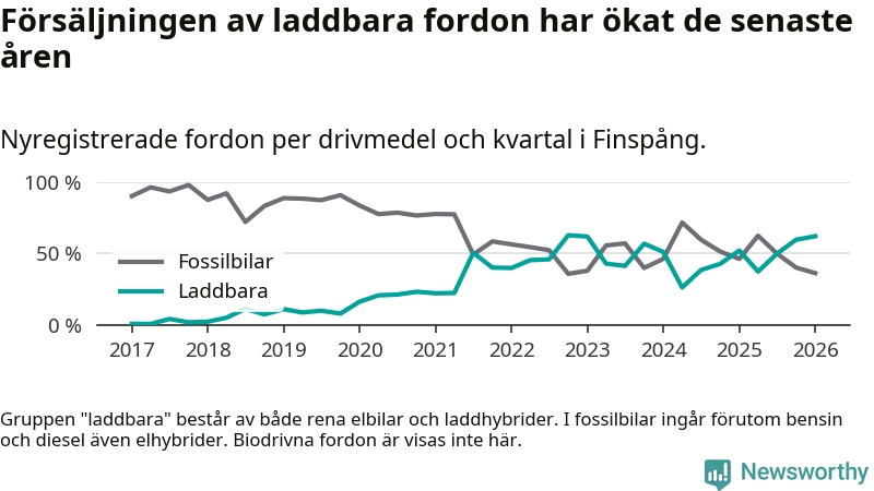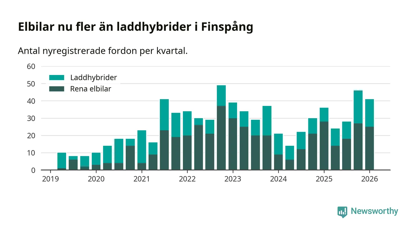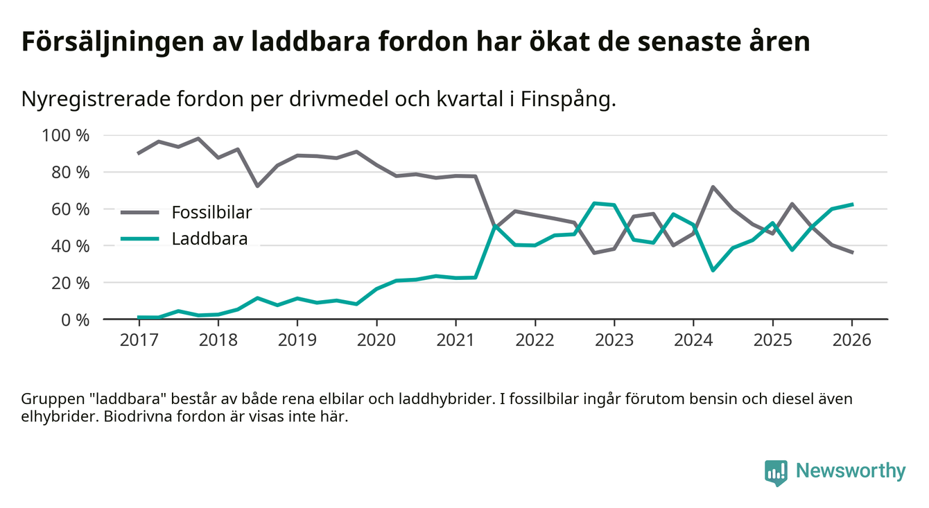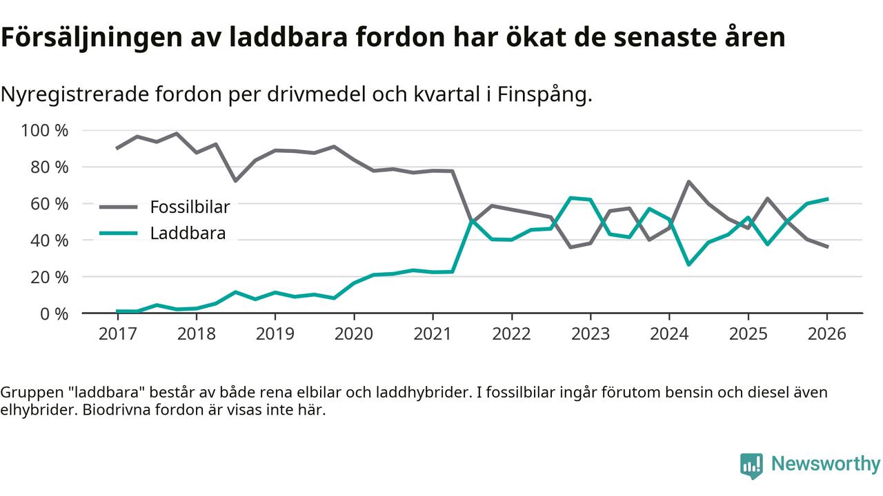 Under första kvartalet 2026 var 62 procent av alla nyregistrerade personbilar i Finspång laddbara (sammanlagt registrerades 66 nya bilar). Merparten av de laddbara bilarna var rena elbilar (38 procent av alla).