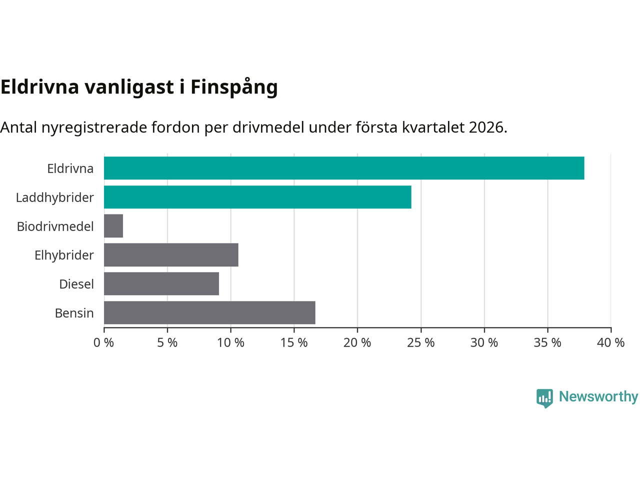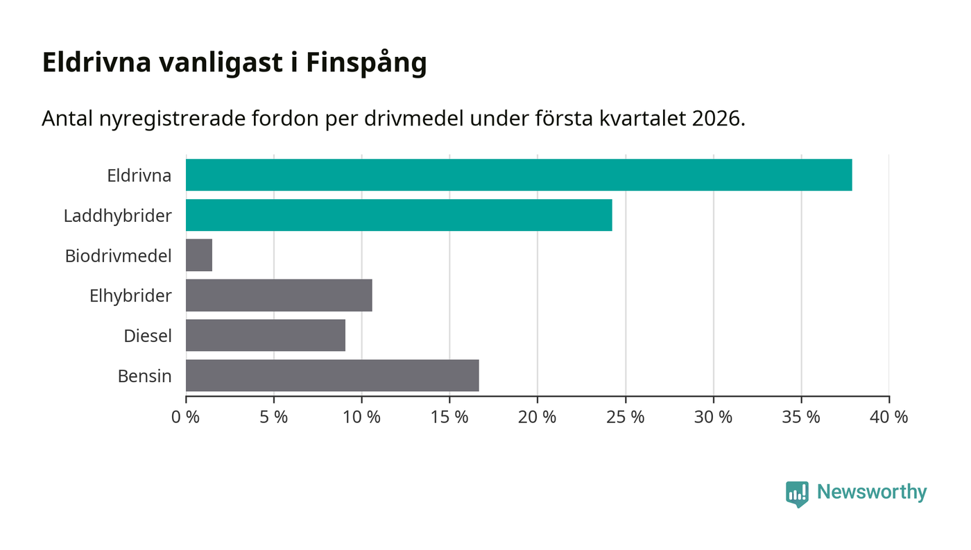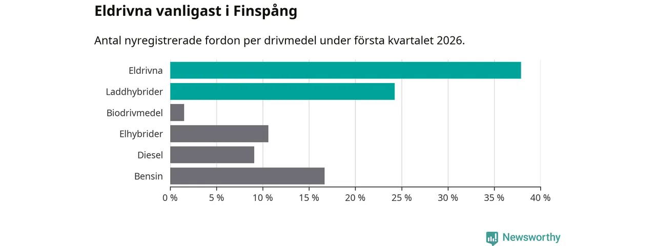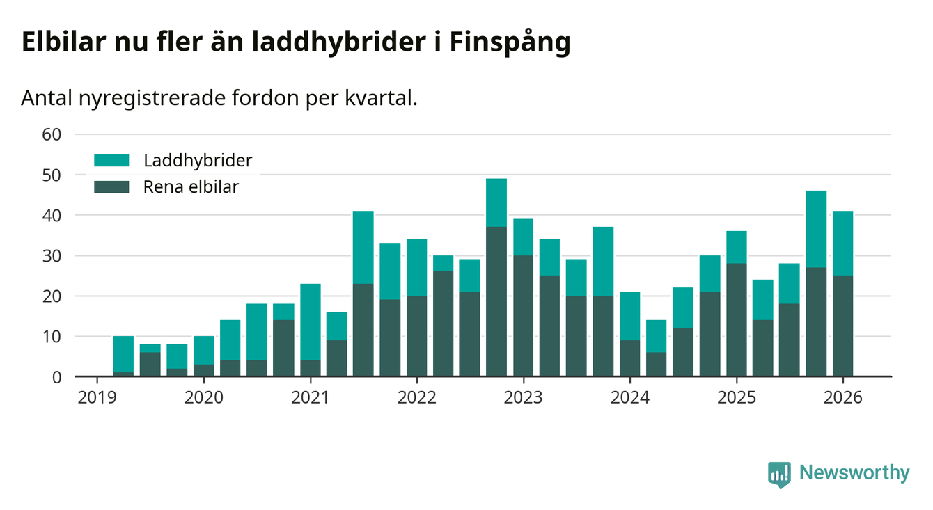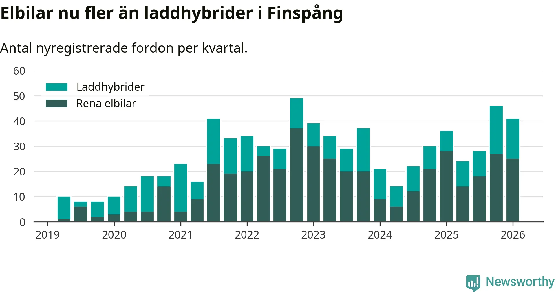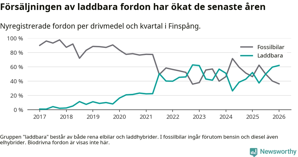 Under första kvartalet 2026 var 62 procent av alla nyregistrerade personbilar i Finspång laddbara (sammanlagt registrerades 66 nya bilar). Merparten av de laddbara bilarna var rena elbilar (38 procent av alla).
