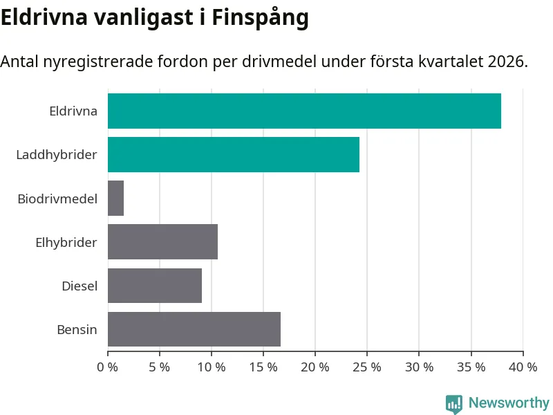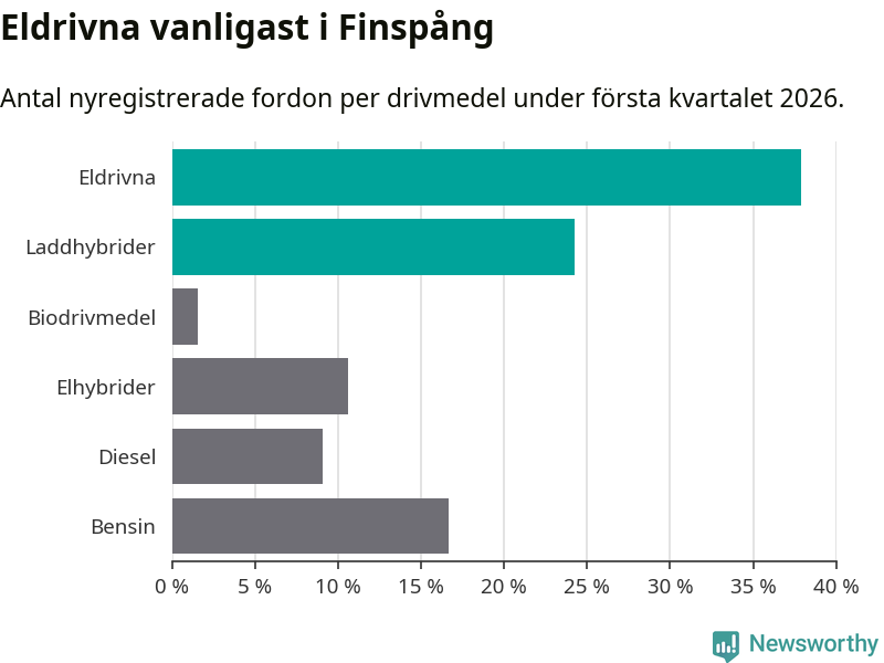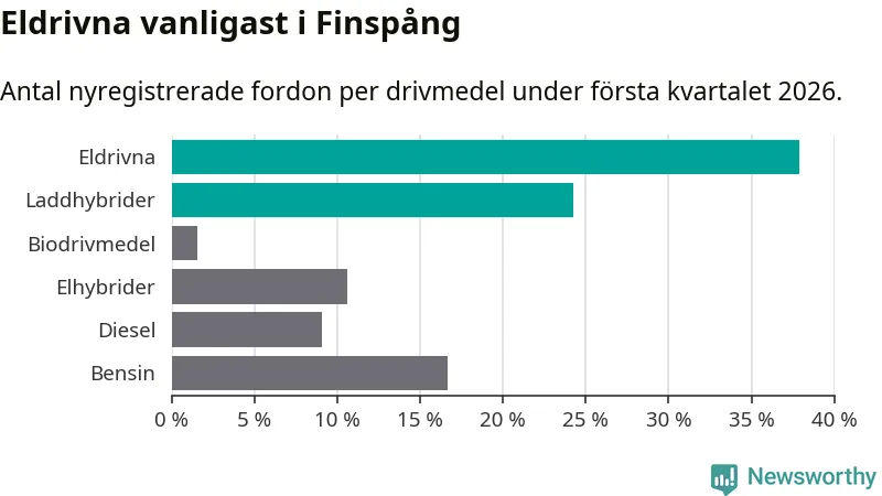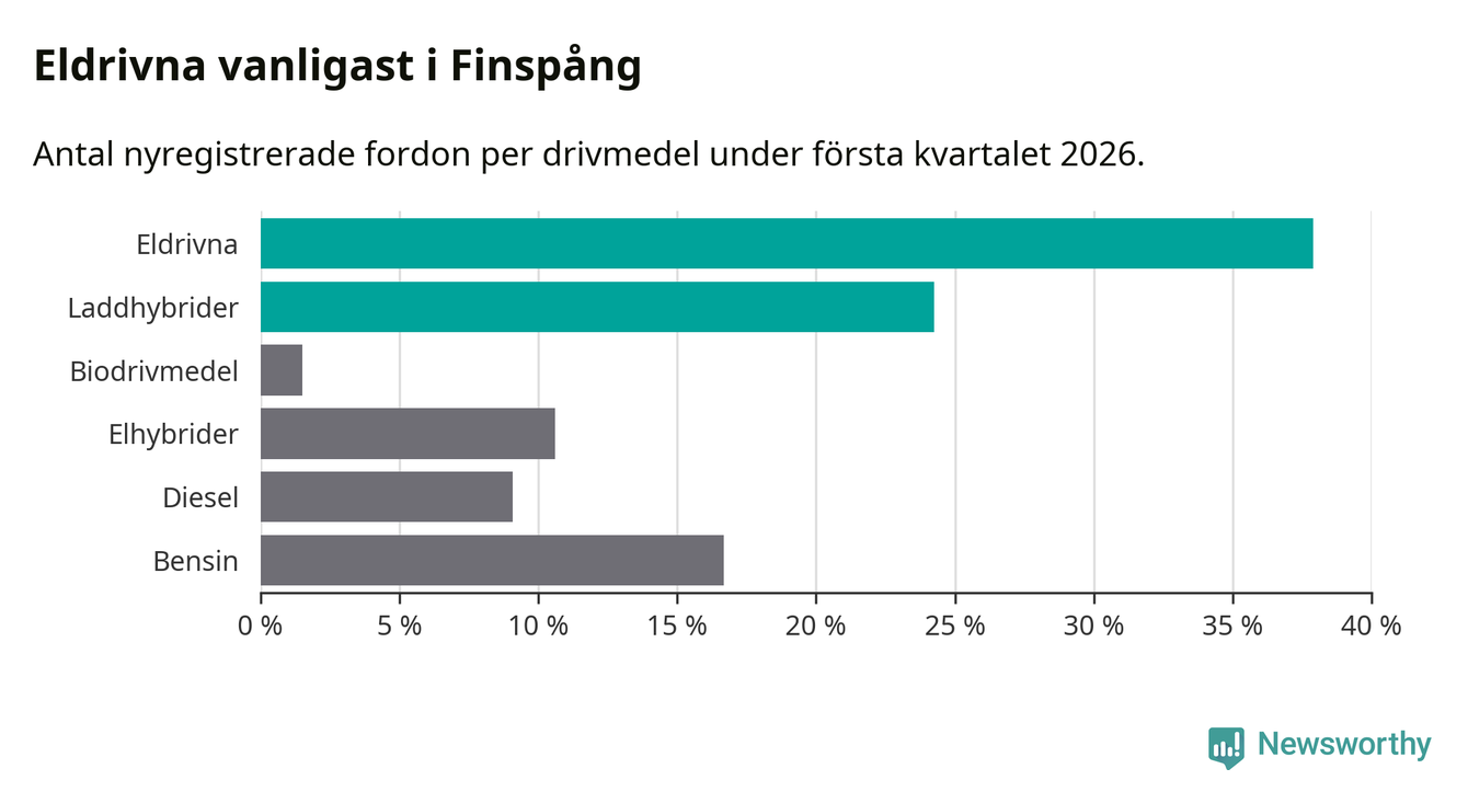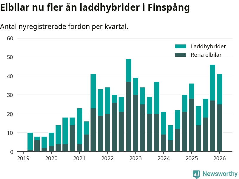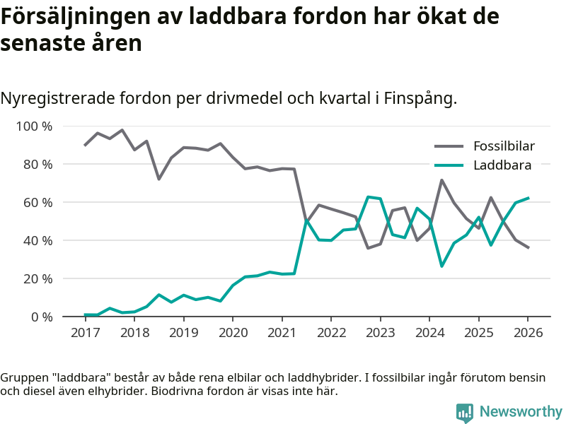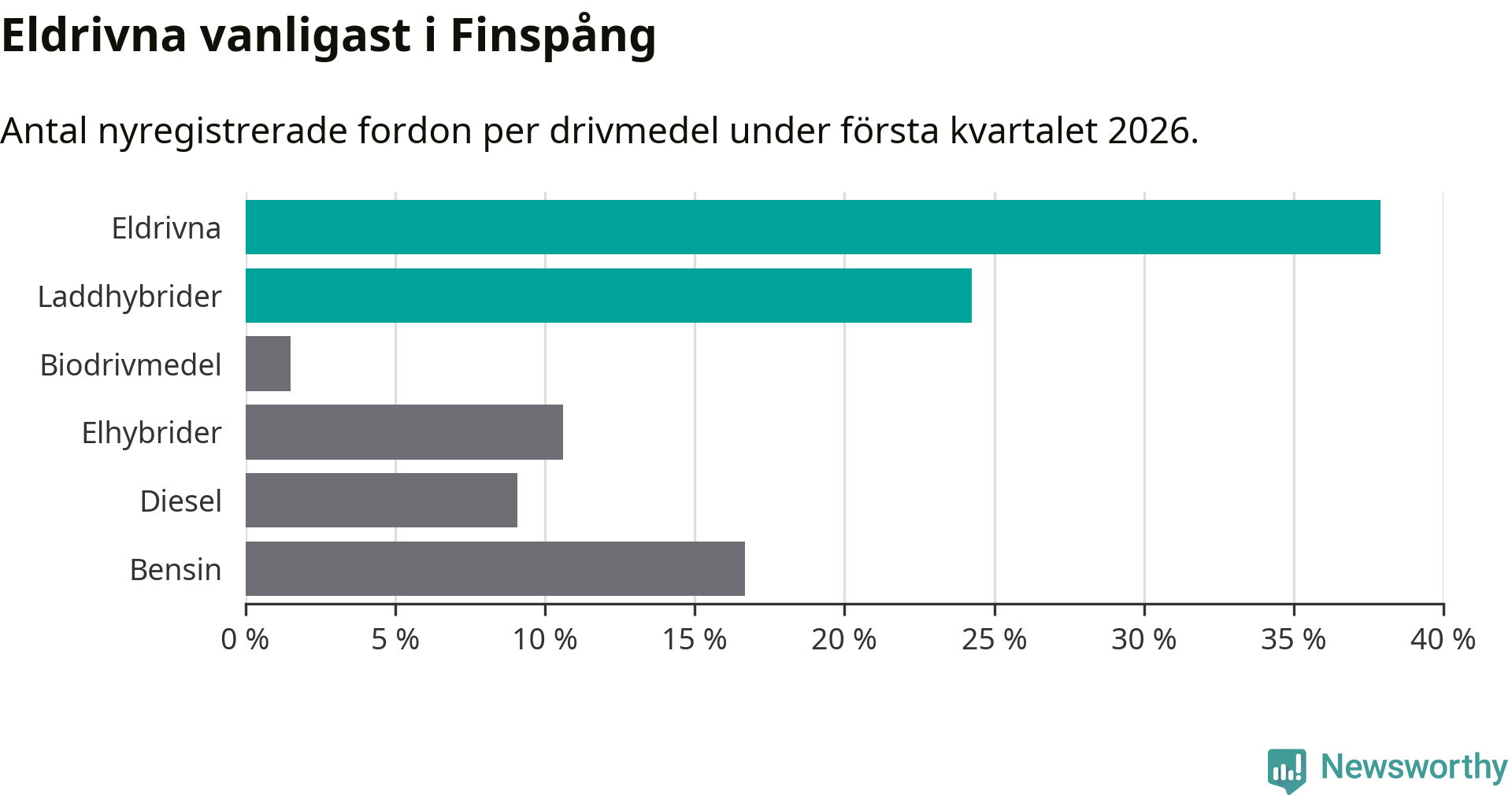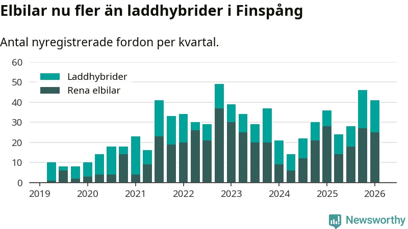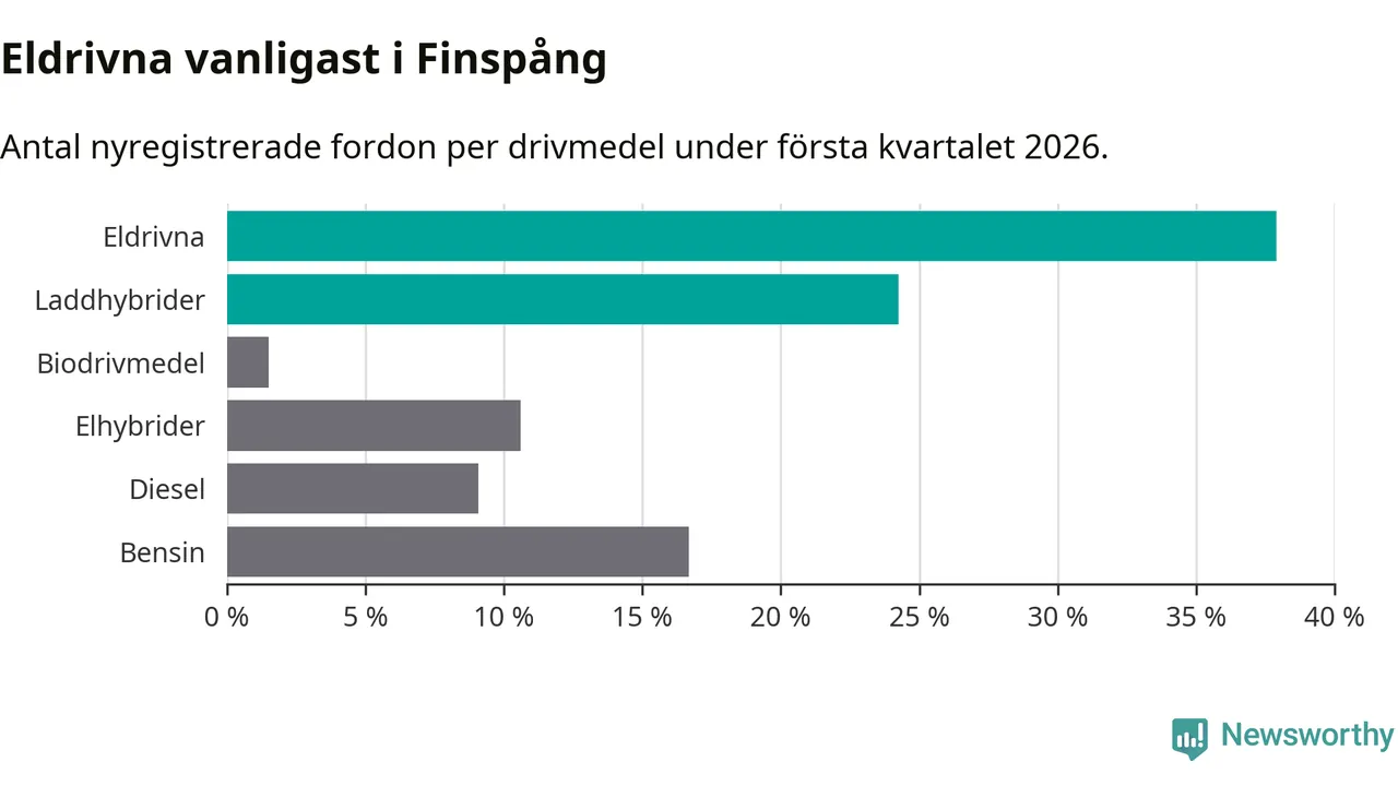 Under första kvartalet 2026 var 62 procent av alla nyregistrerade personbilar i Finspång laddbara (sammanlagt registrerades 66 nya bilar). Merparten av de laddbara bilarna var rena elbilar (38 procent av alla).