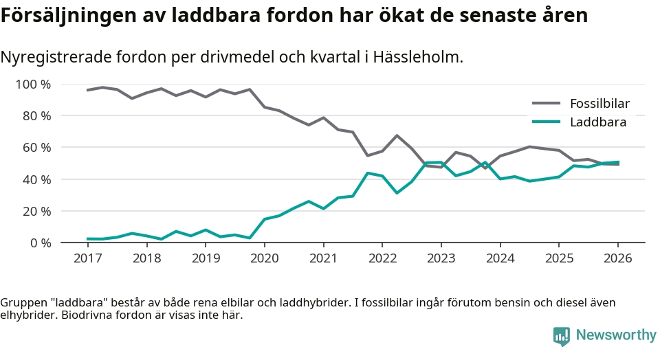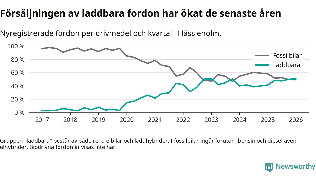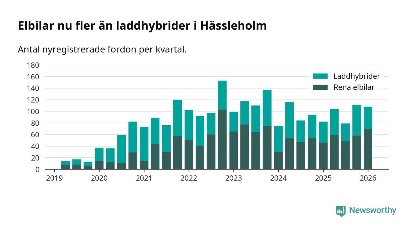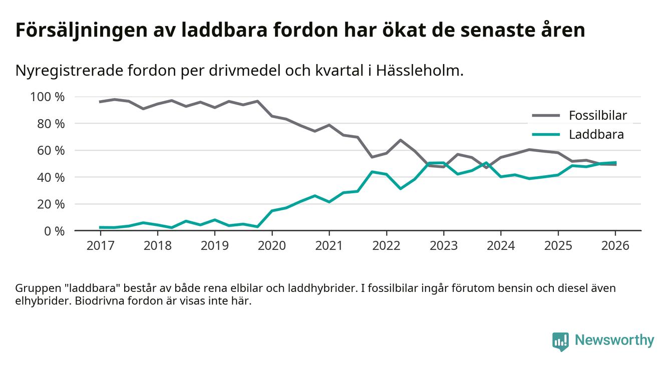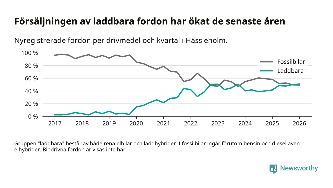 Under första kvartalet 2026 var 51 procent av alla nyregistrerade personbilar i Hässleholm laddbara (sammanlagt registrerades 213 nya bilar). Merparten av de laddbara bilarna var rena elbilar (32 procent av alla).