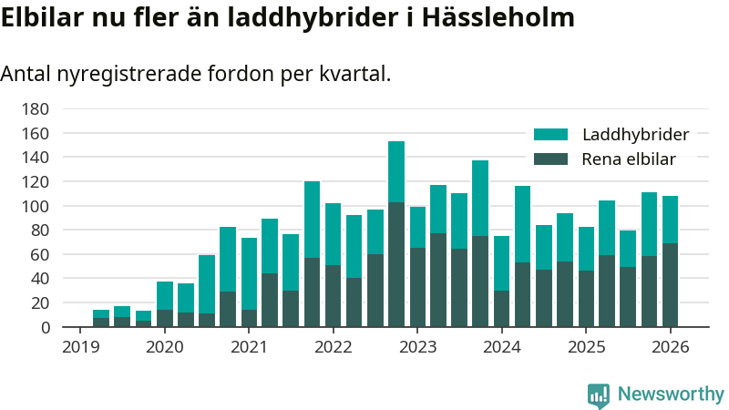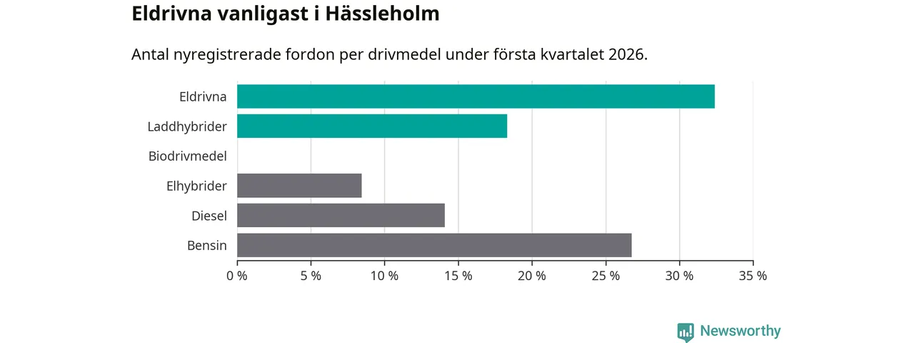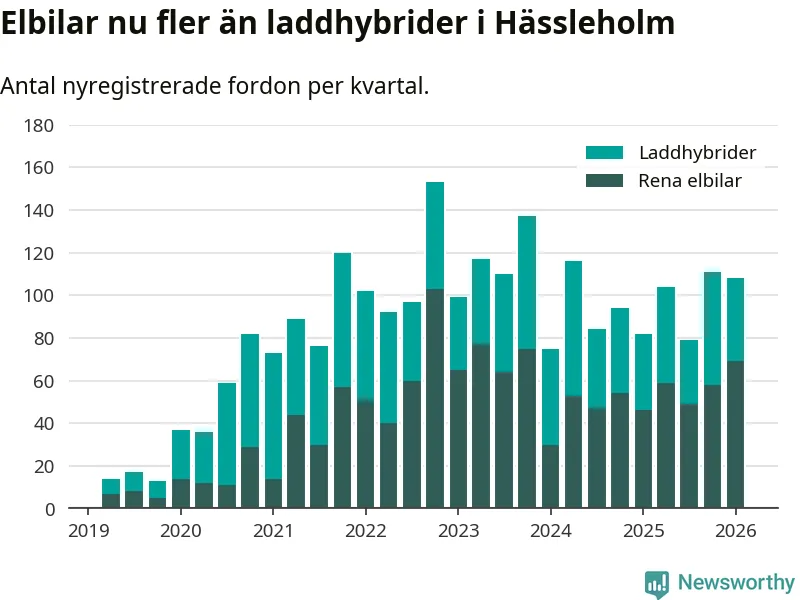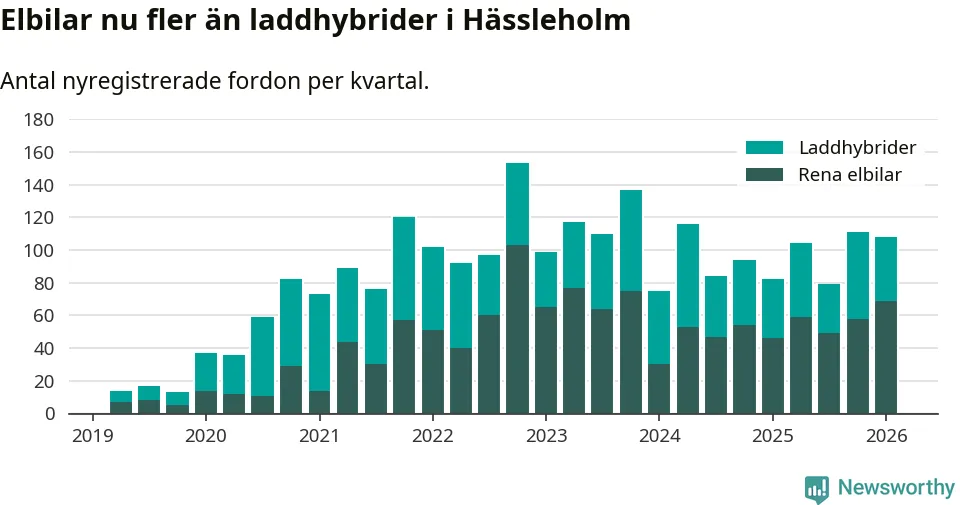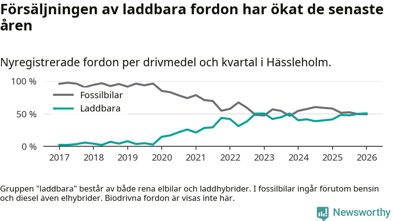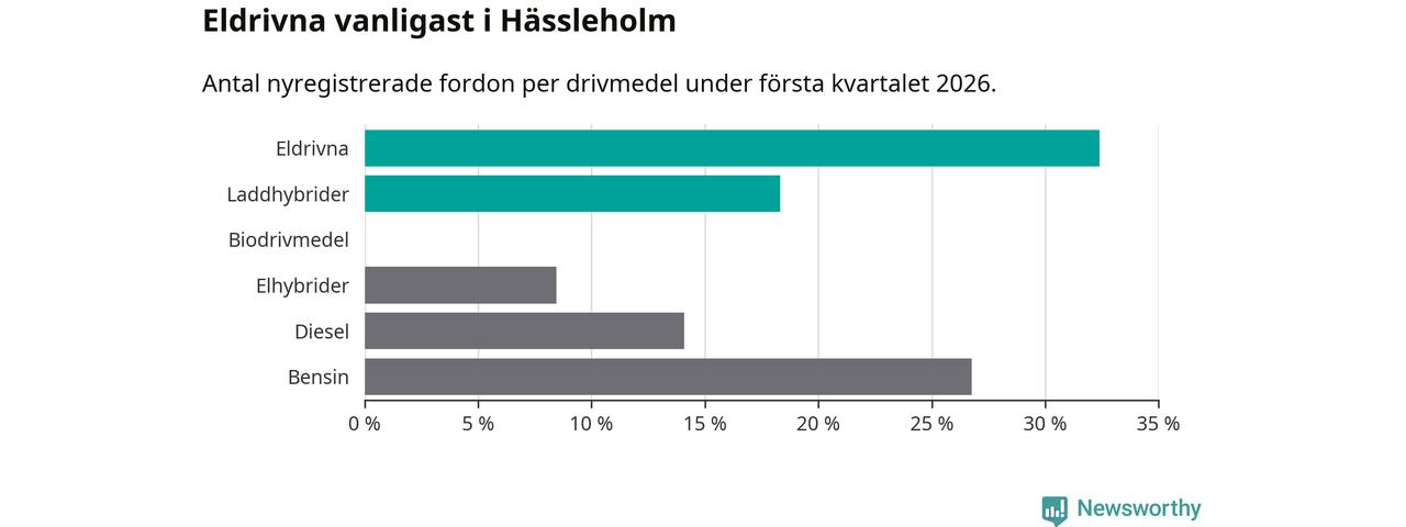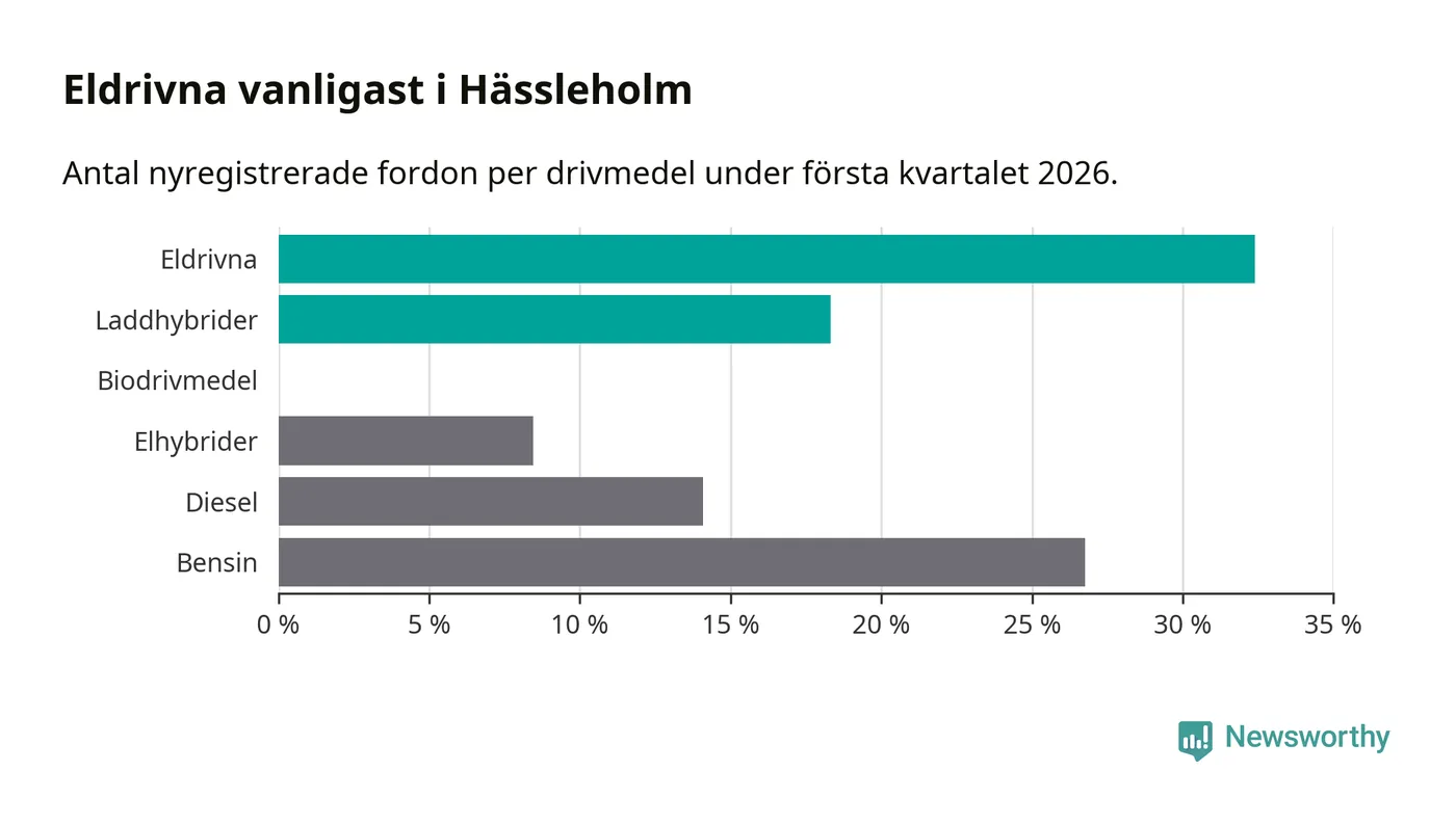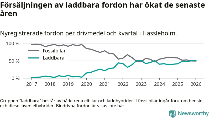 Under första kvartalet 2026 var 51 procent av alla nyregistrerade personbilar i Hässleholm laddbara (sammanlagt registrerades 213 nya bilar). Merparten av de laddbara bilarna var rena elbilar (32 procent av alla).