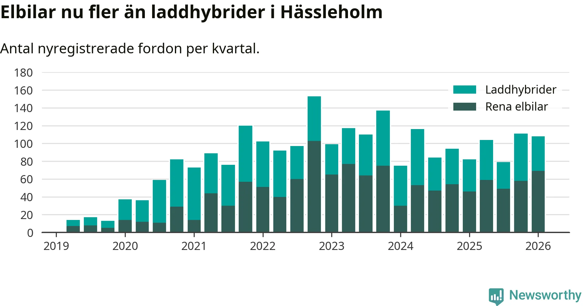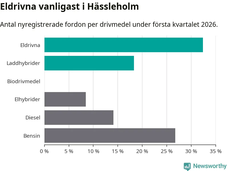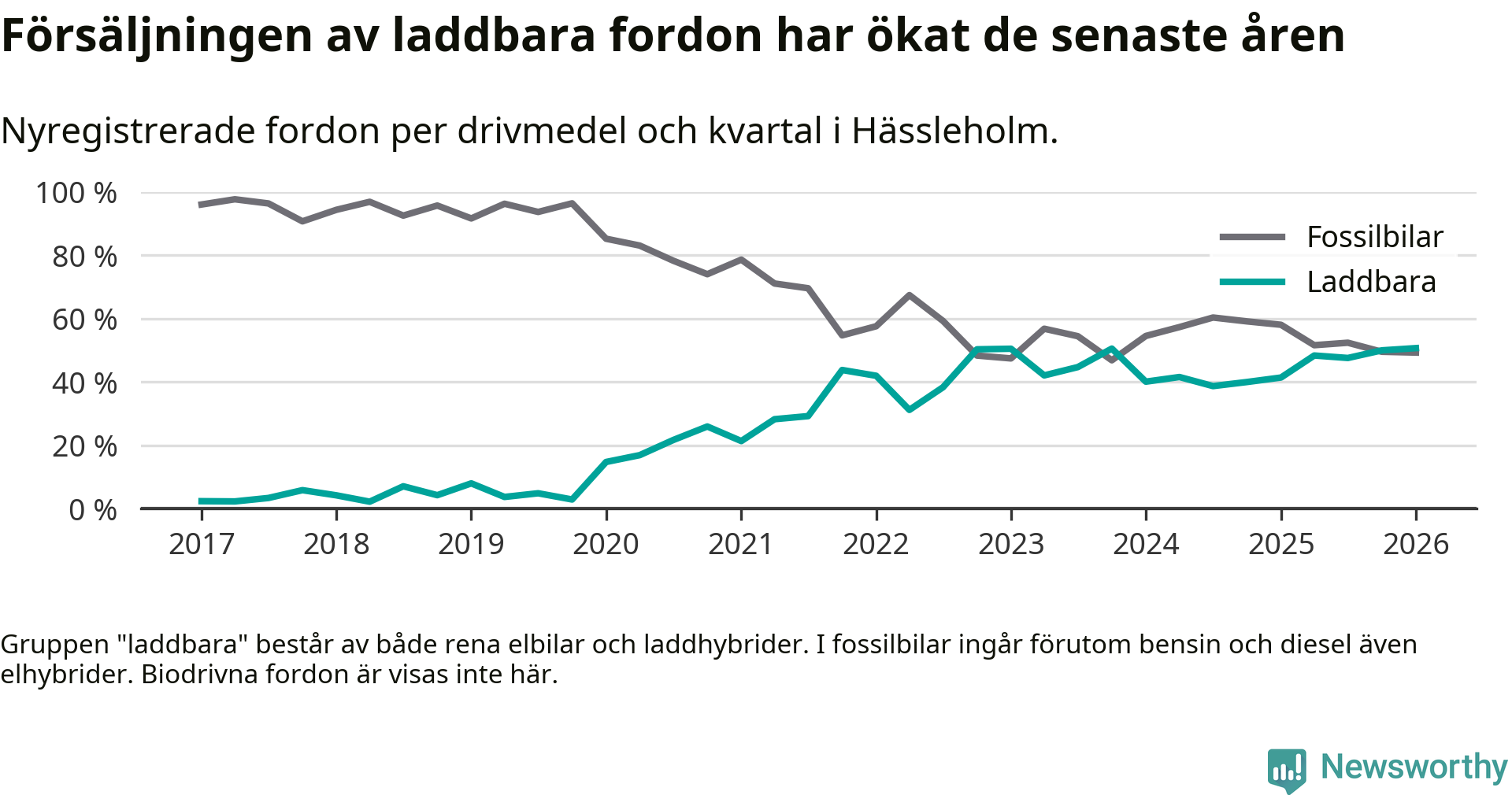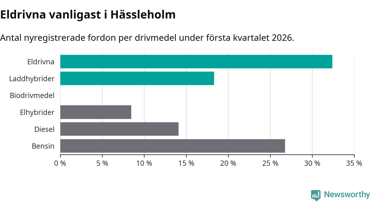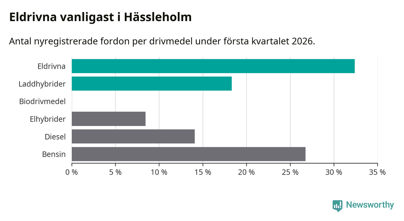 Under första kvartalet 2026 var 51 procent av alla nyregistrerade personbilar i Hässleholm laddbara (sammanlagt registrerades 213 nya bilar). Merparten av de laddbara bilarna var rena elbilar (32 procent av alla).