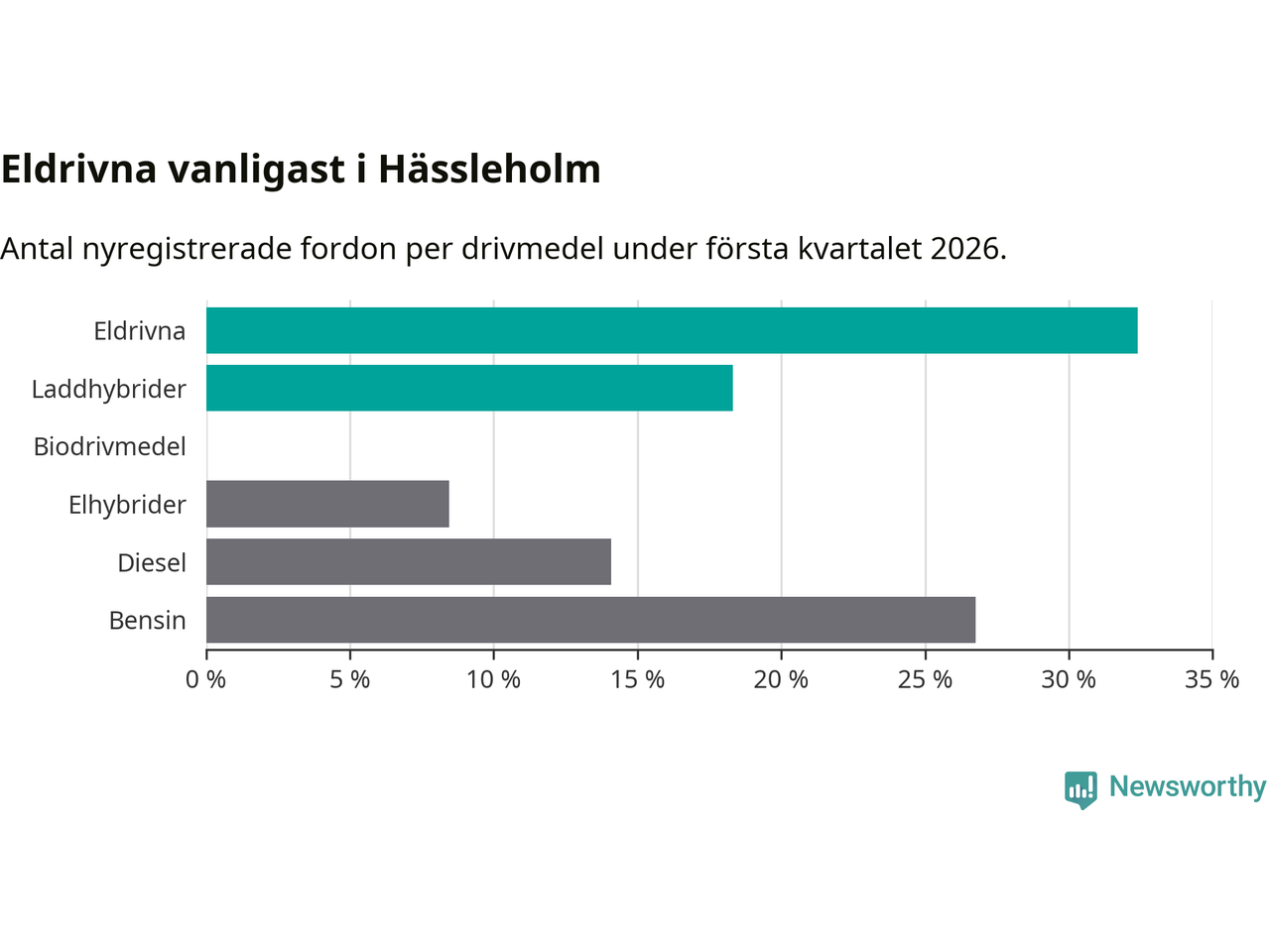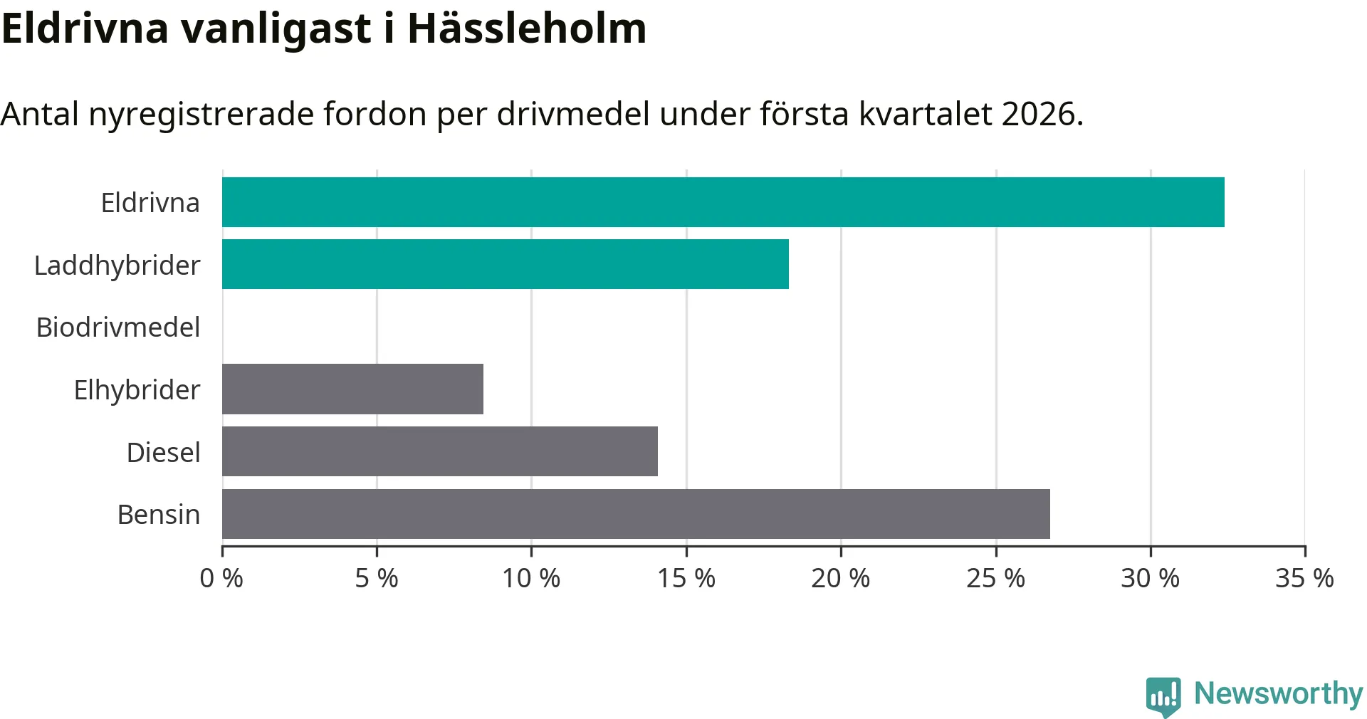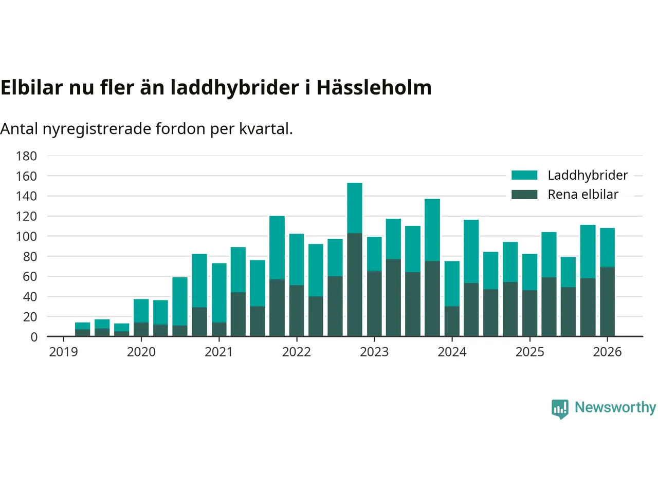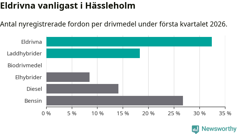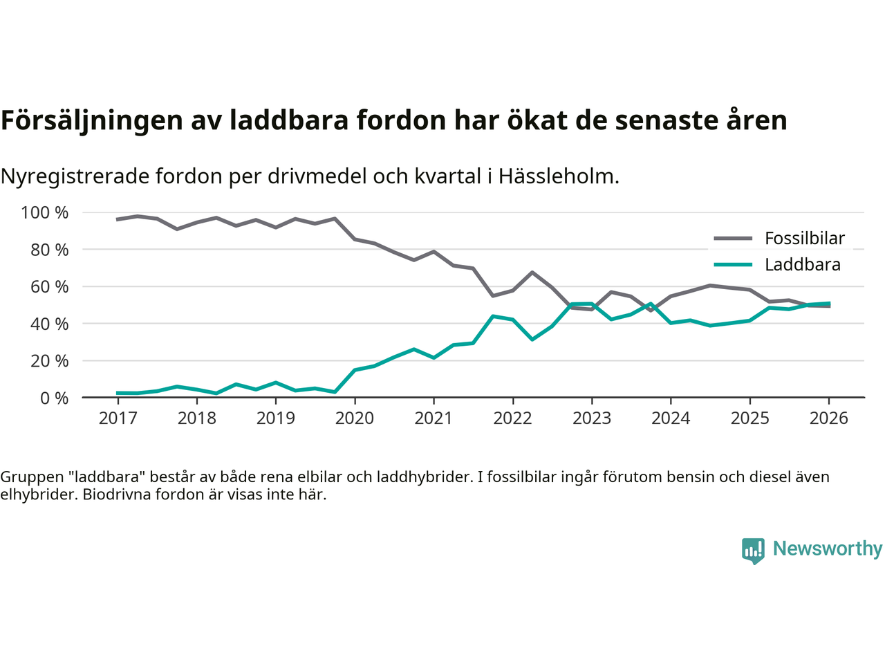 Under första kvartalet 2026 var 51 procent av alla nyregistrerade personbilar i Hässleholm laddbara (sammanlagt registrerades 213 nya bilar). Merparten av de laddbara bilarna var rena elbilar (32 procent av alla).