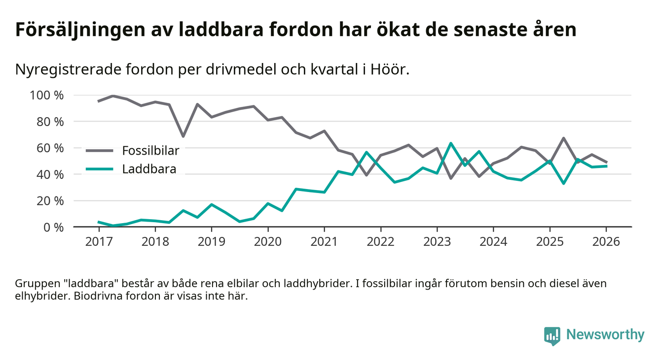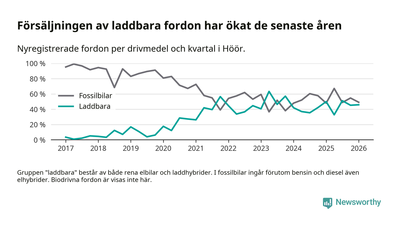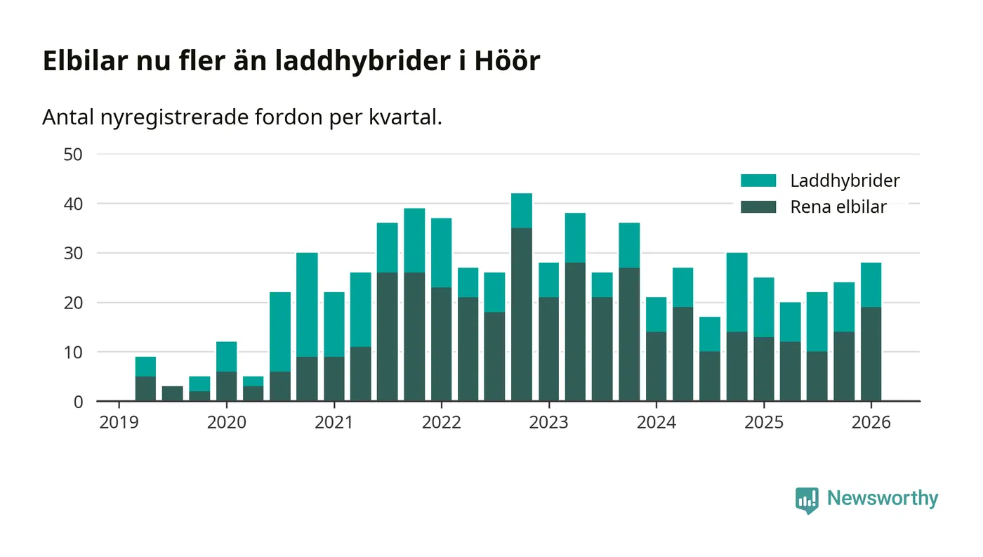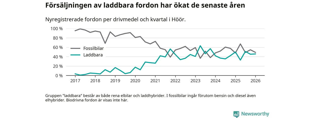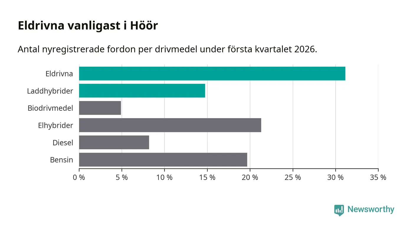 Under första kvartalet 2026 var 46 procent av alla nyregistrerade personbilar i Höör laddbara (sammanlagt registrerades 61 nya bilar). Merparten av de laddbara bilarna var rena elbilar (31 procent av alla).