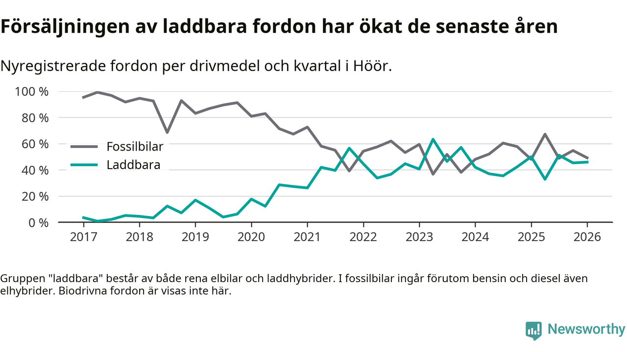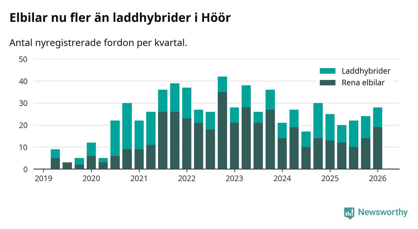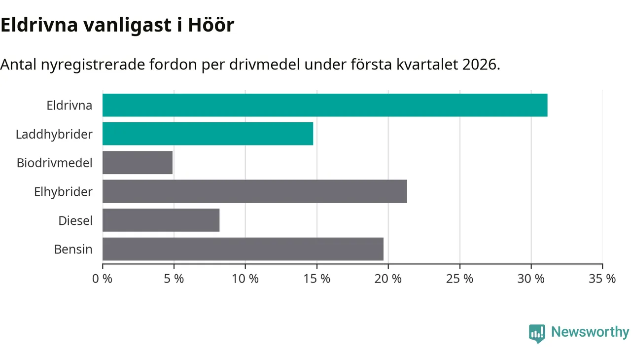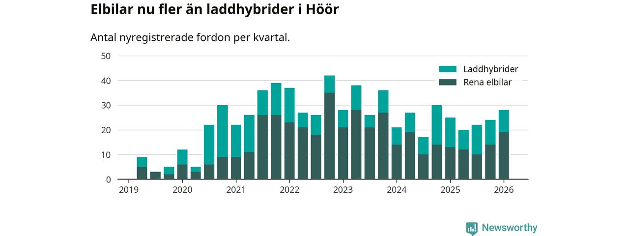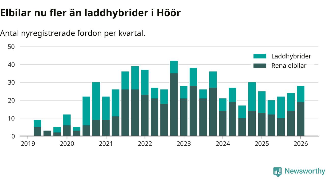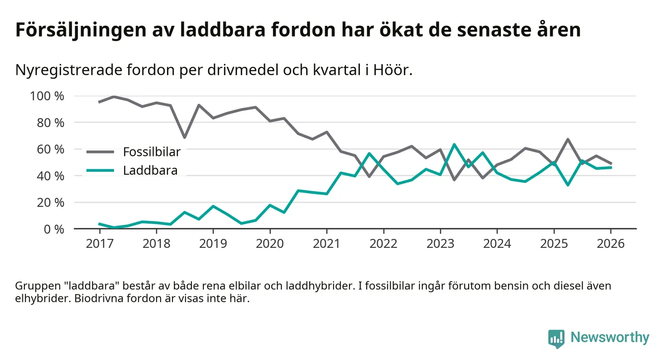 Under första kvartalet 2026 var 46 procent av alla nyregistrerade personbilar i Höör laddbara (sammanlagt registrerades 61 nya bilar). Merparten av de laddbara bilarna var rena elbilar (31 procent av alla).