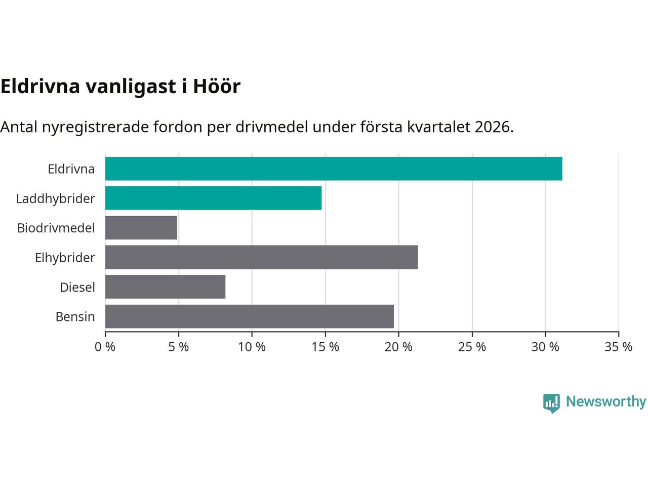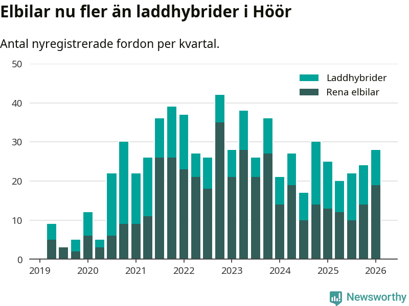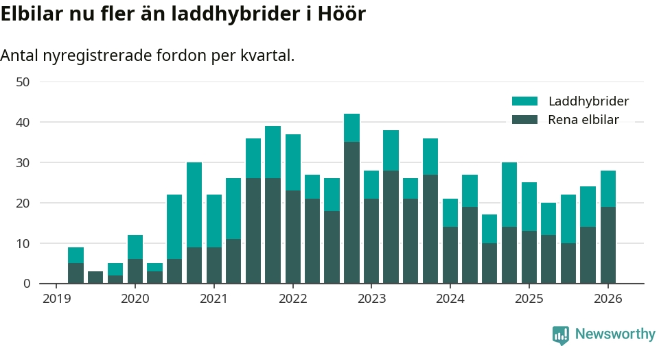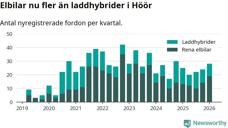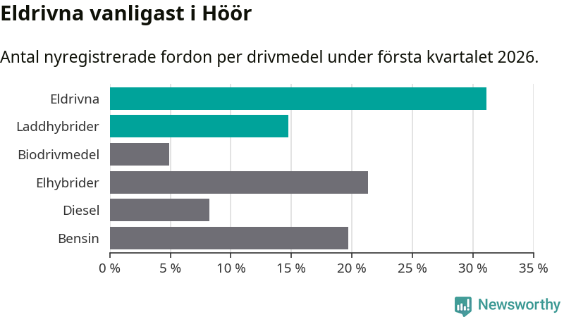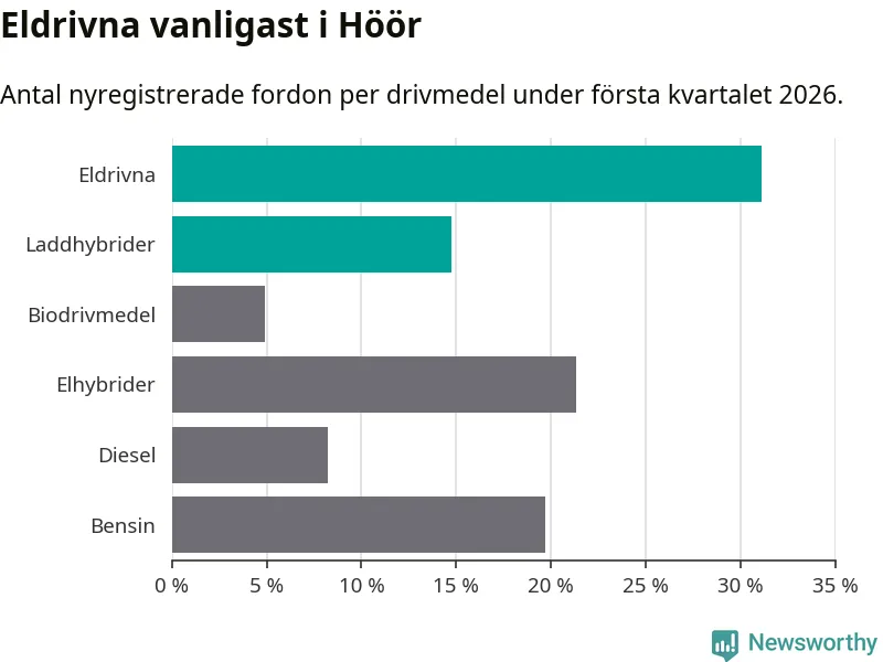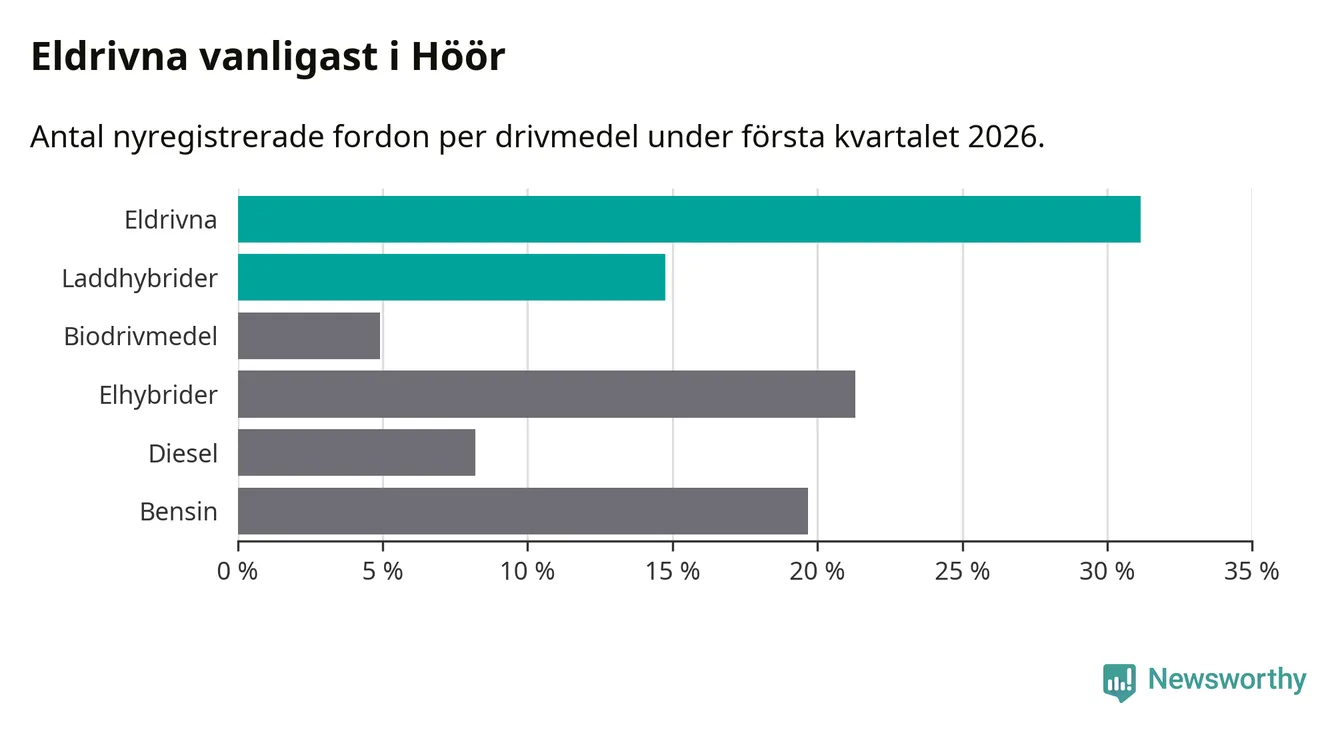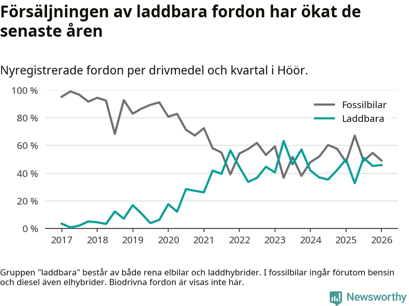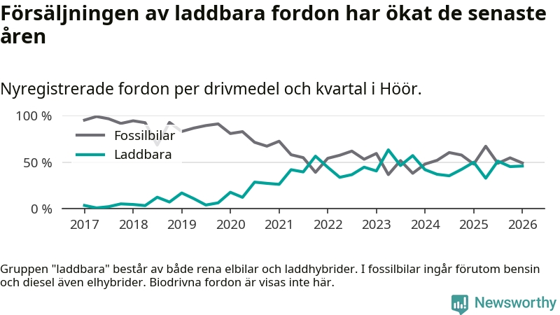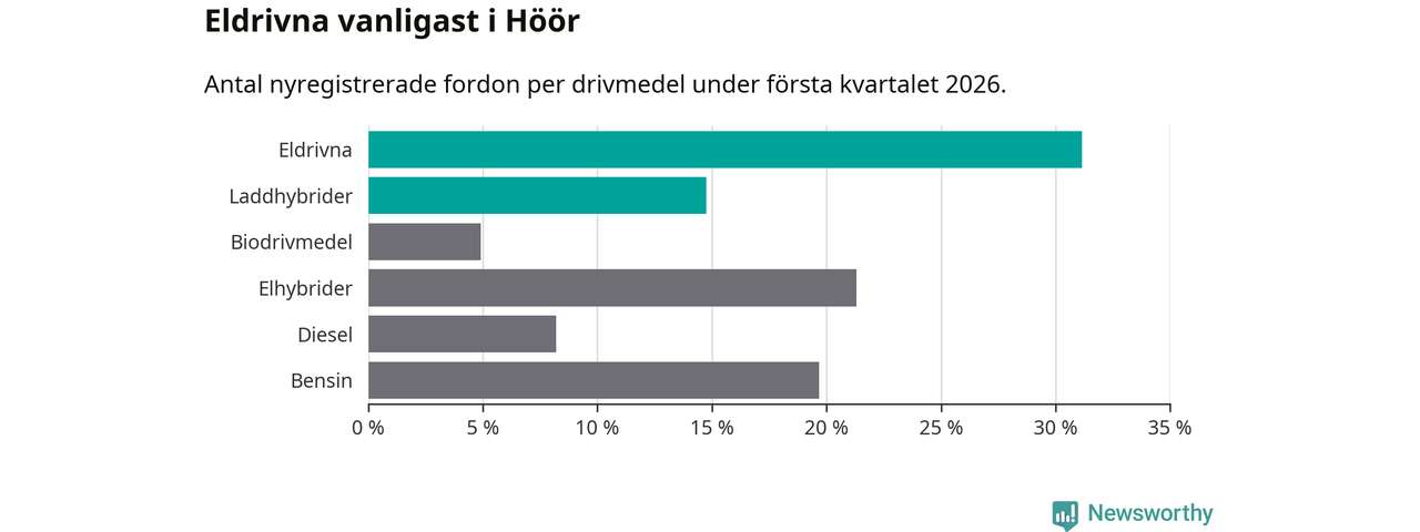 Under första kvartalet 2026 var 46 procent av alla nyregistrerade personbilar i Höör laddbara (sammanlagt registrerades 61 nya bilar). Merparten av de laddbara bilarna var rena elbilar (31 procent av alla).
