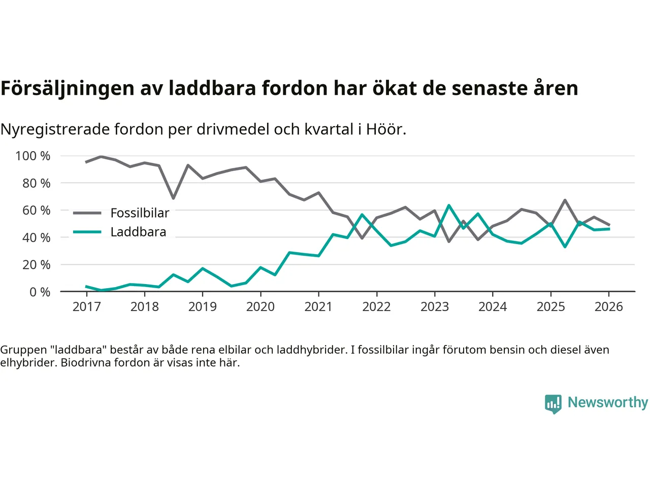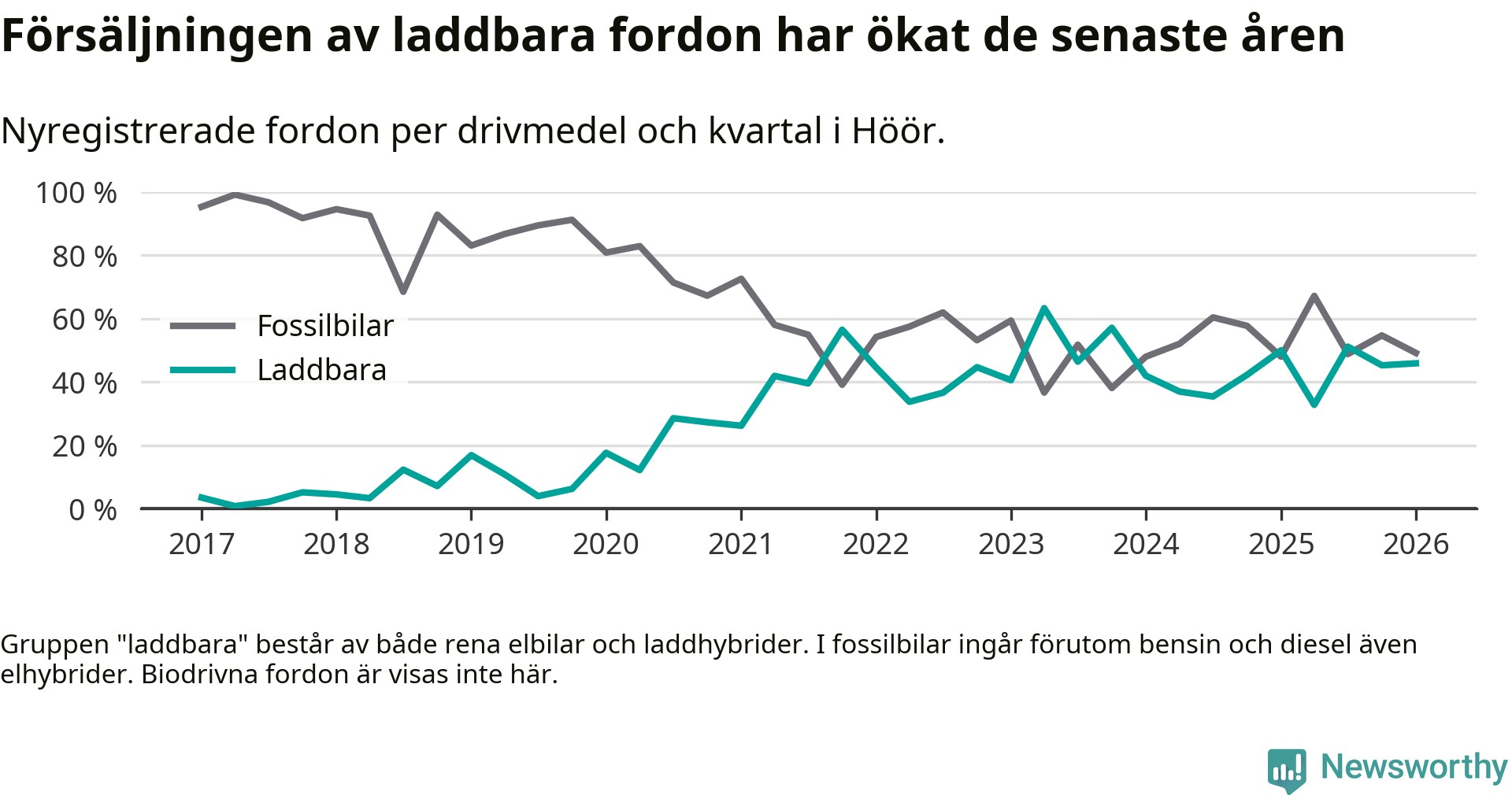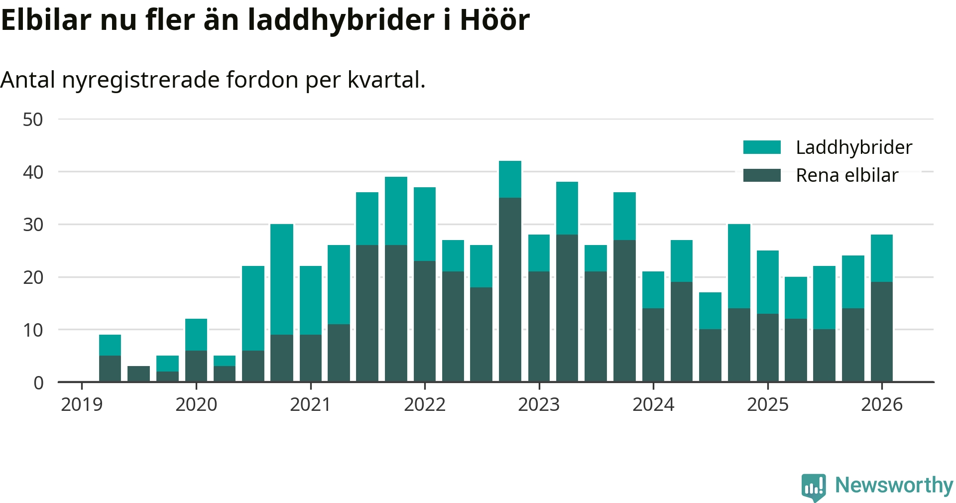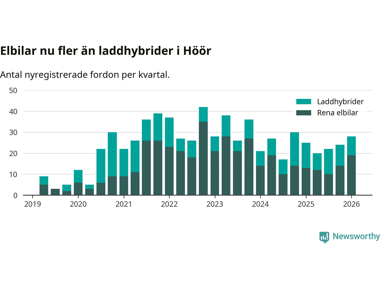 Under första kvartalet 2026 var 46 procent av alla nyregistrerade personbilar i Höör laddbara (sammanlagt registrerades 61 nya bilar). Merparten av de laddbara bilarna var rena elbilar (31 procent av alla).