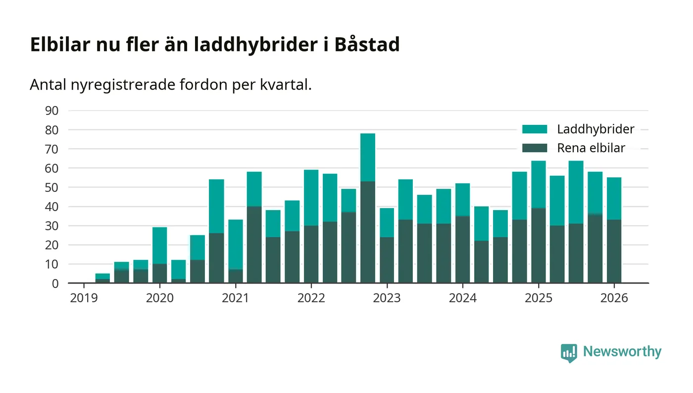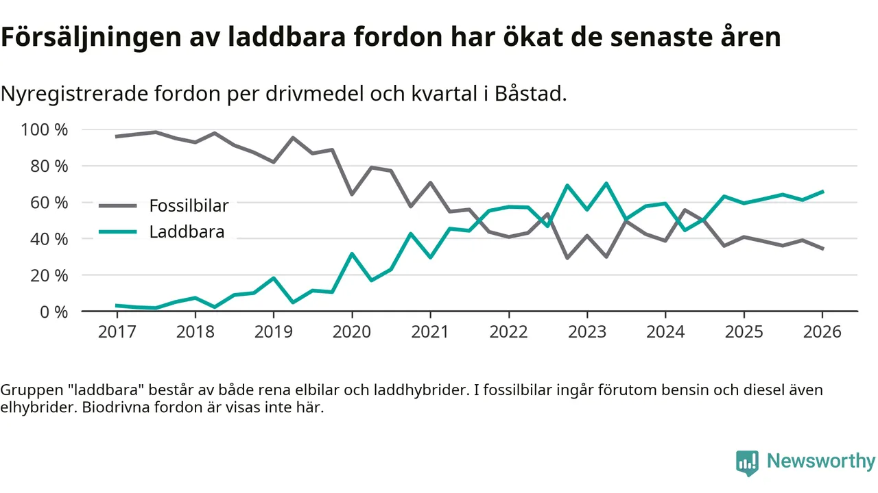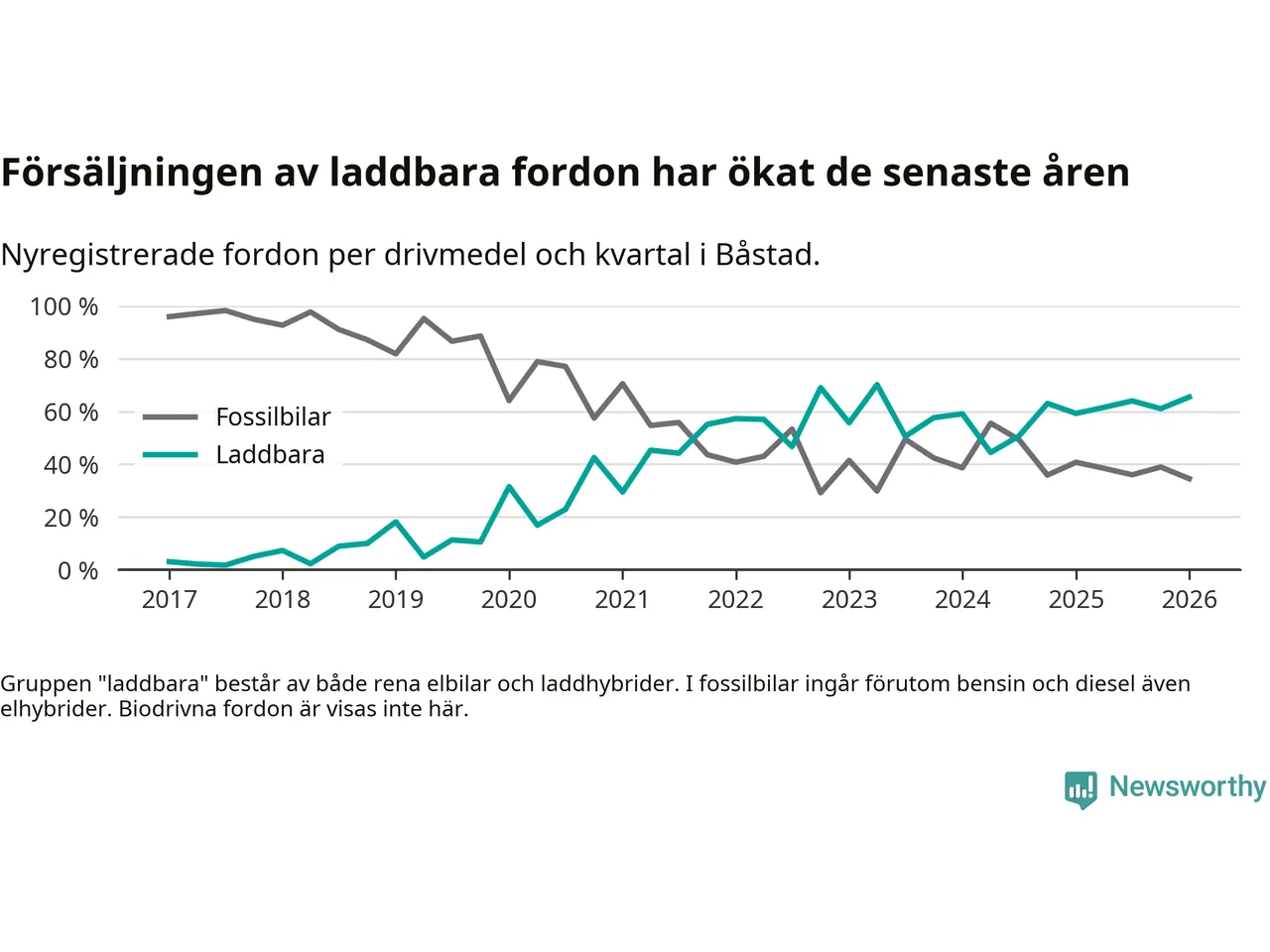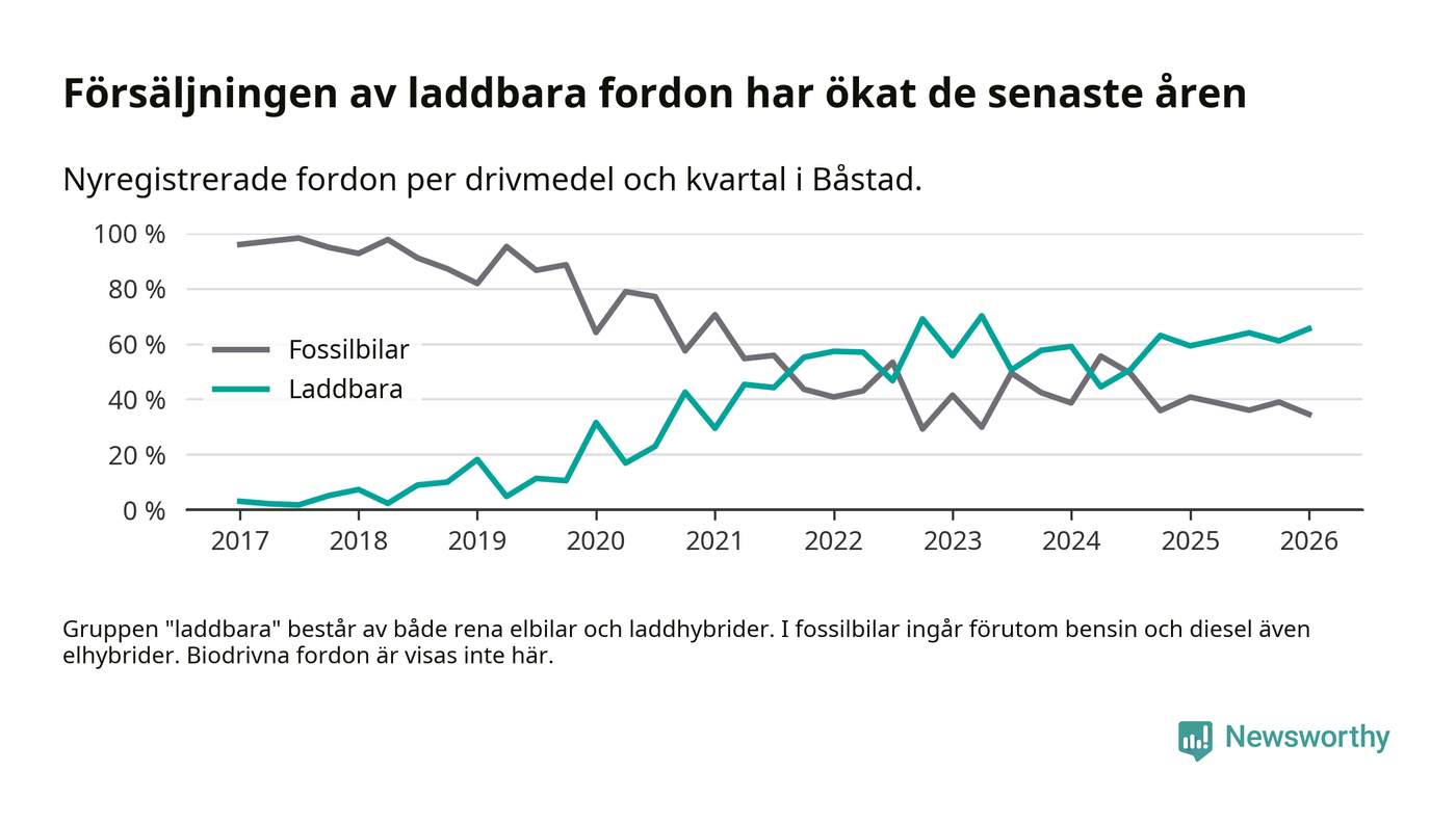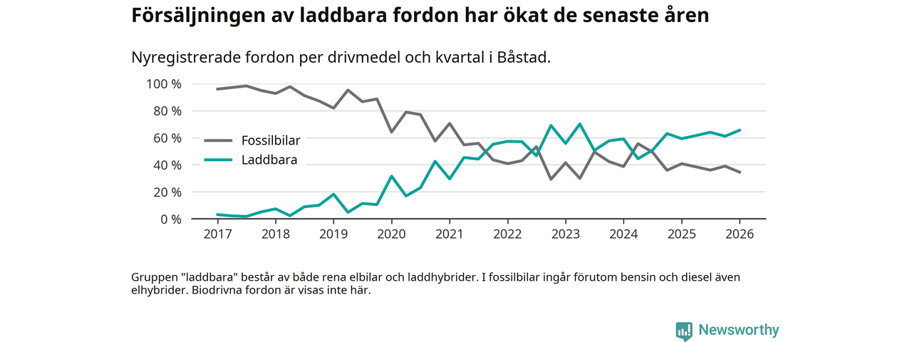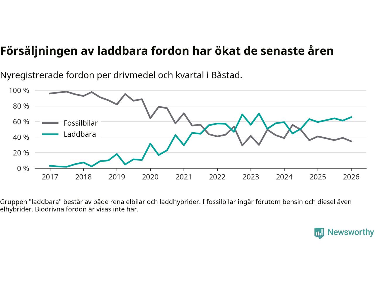 Under första kvartalet 2026 var 65 procent av alla nyregistrerade personbilar i Båstad laddbara (sammanlagt registrerades 84 nya bilar). Merparten av de laddbara bilarna var rena elbilar (39 procent av alla).