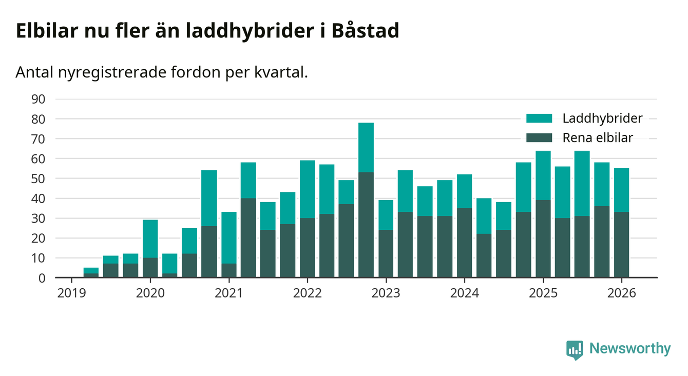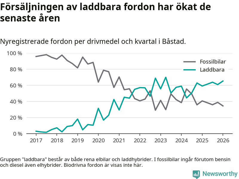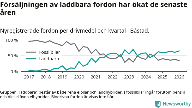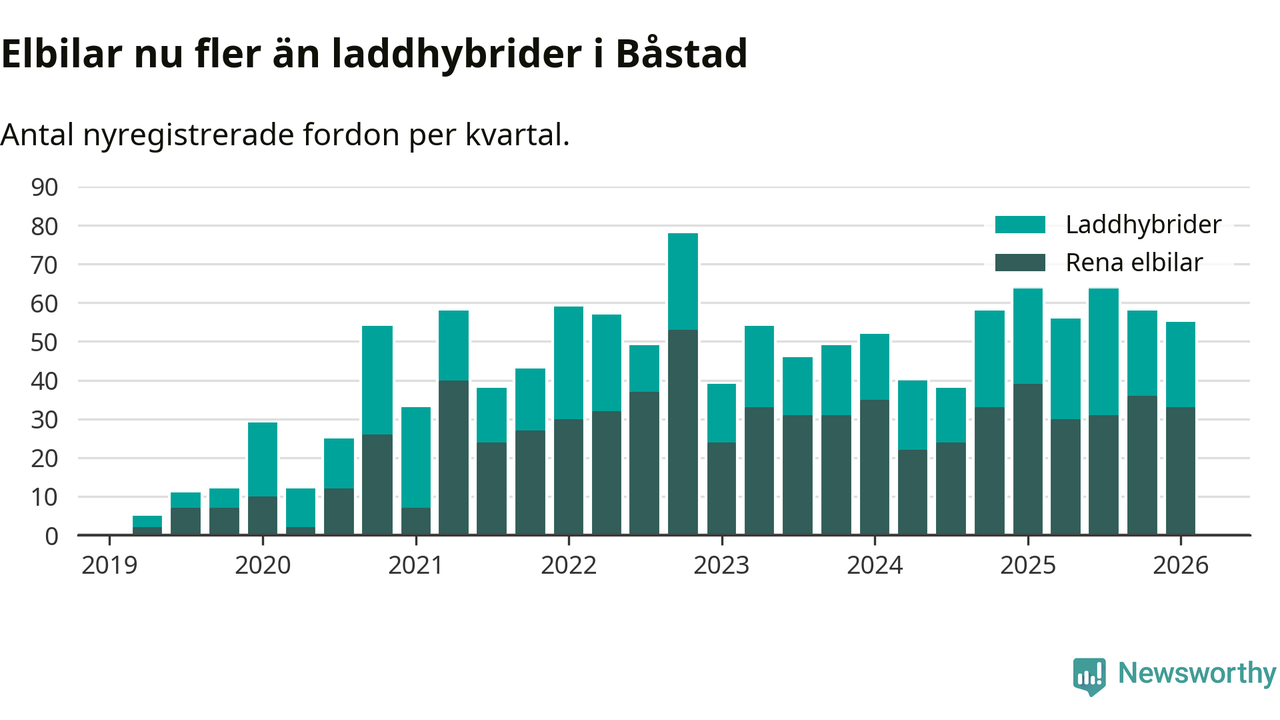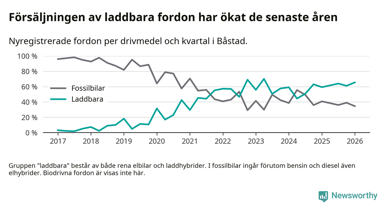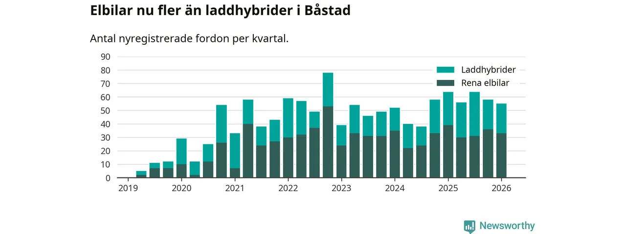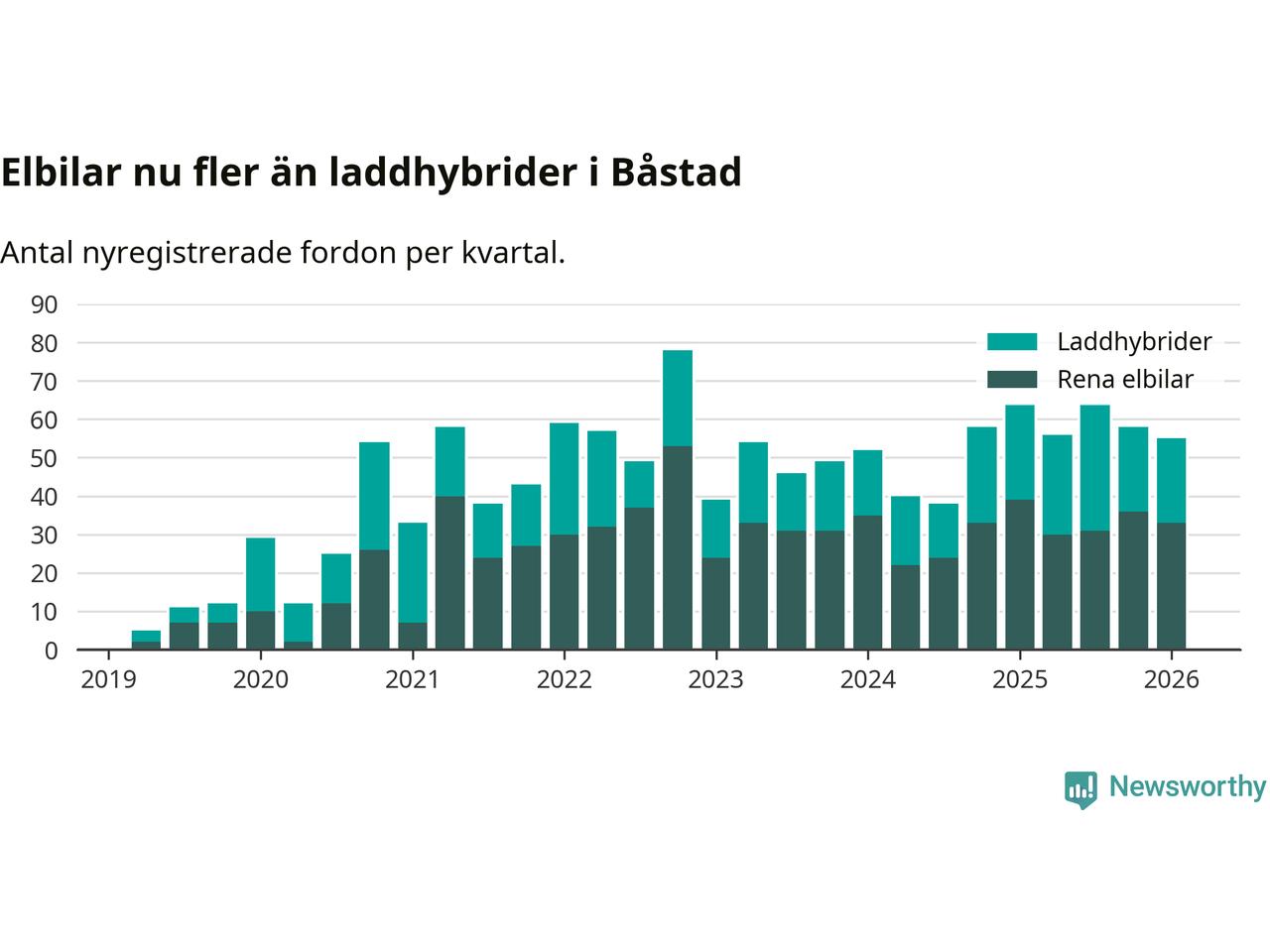 Under första kvartalet 2026 var 65 procent av alla nyregistrerade personbilar i Båstad laddbara (sammanlagt registrerades 84 nya bilar). Merparten av de laddbara bilarna var rena elbilar (39 procent av alla).