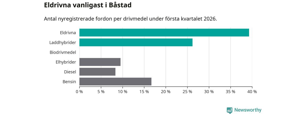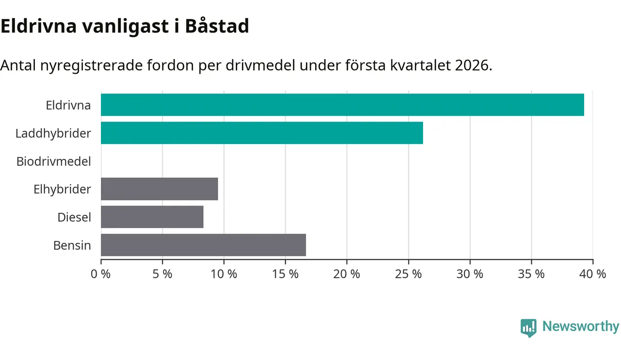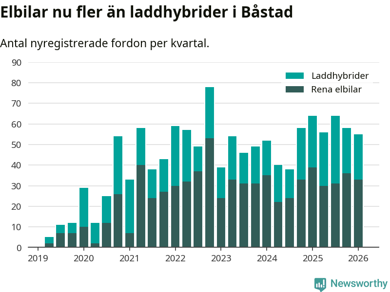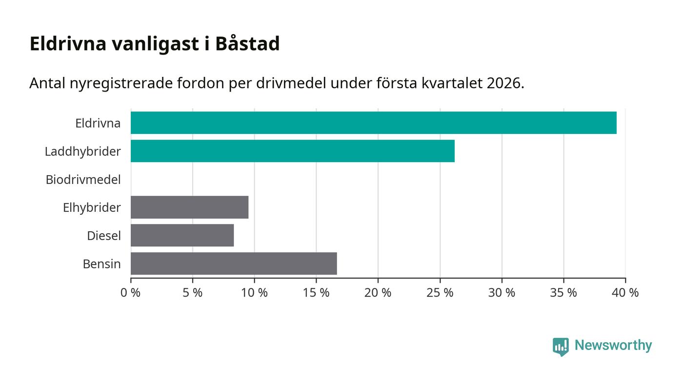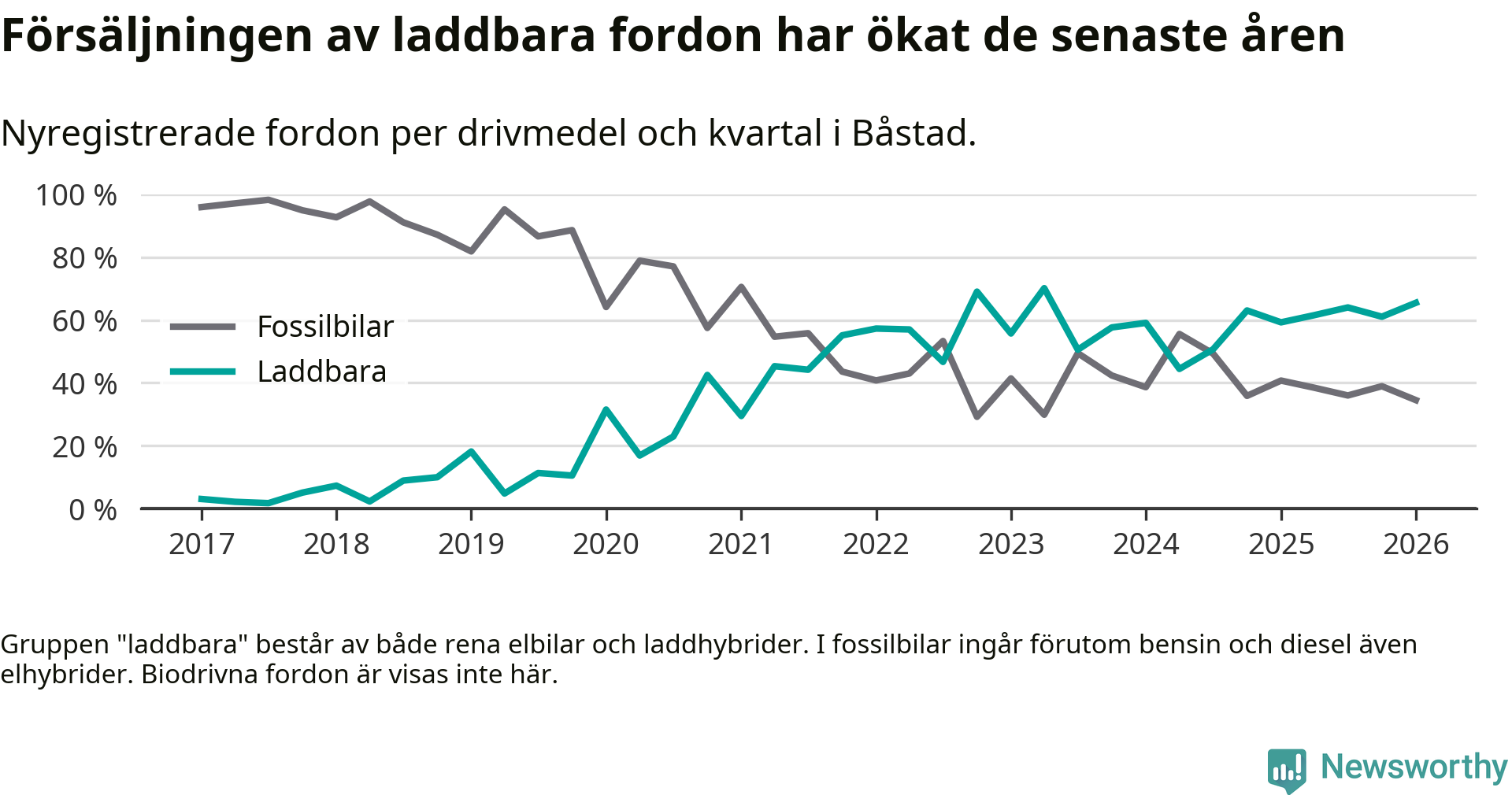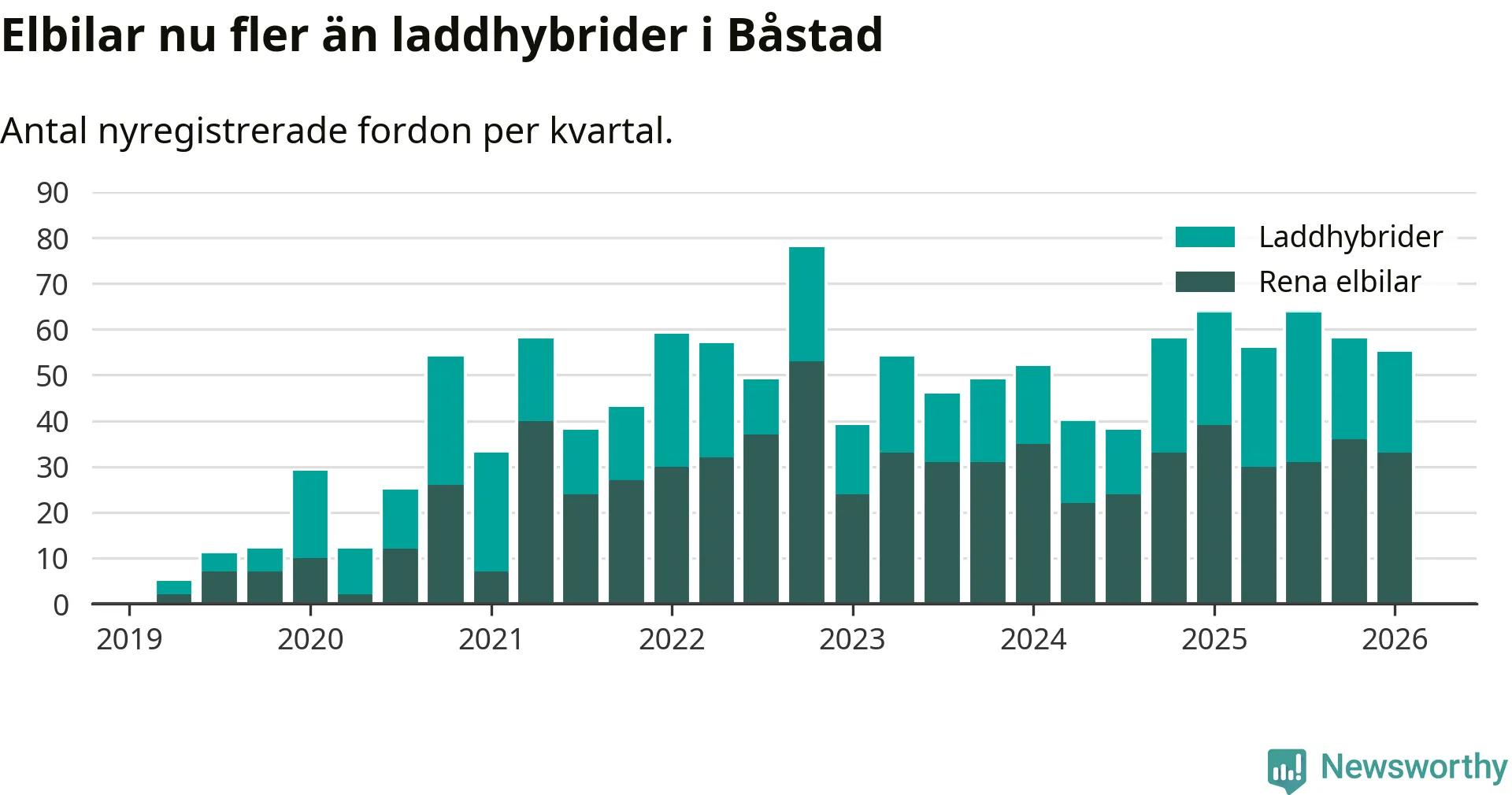 Under första kvartalet 2026 var 65 procent av alla nyregistrerade personbilar i Båstad laddbara (sammanlagt registrerades 84 nya bilar). Merparten av de laddbara bilarna var rena elbilar (39 procent av alla).