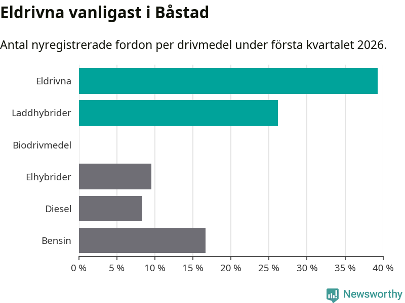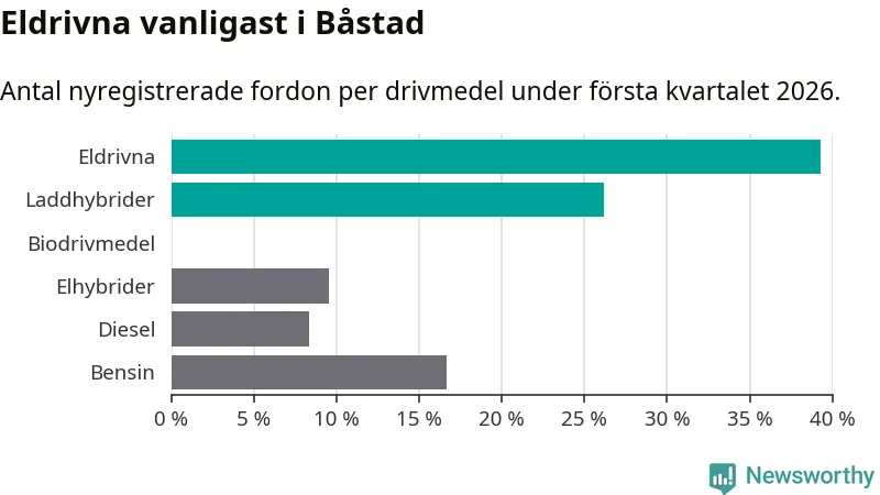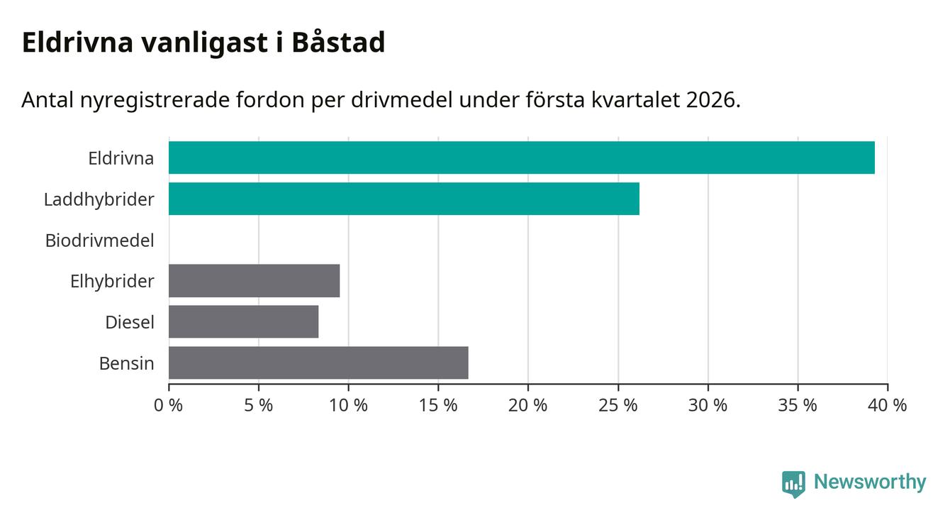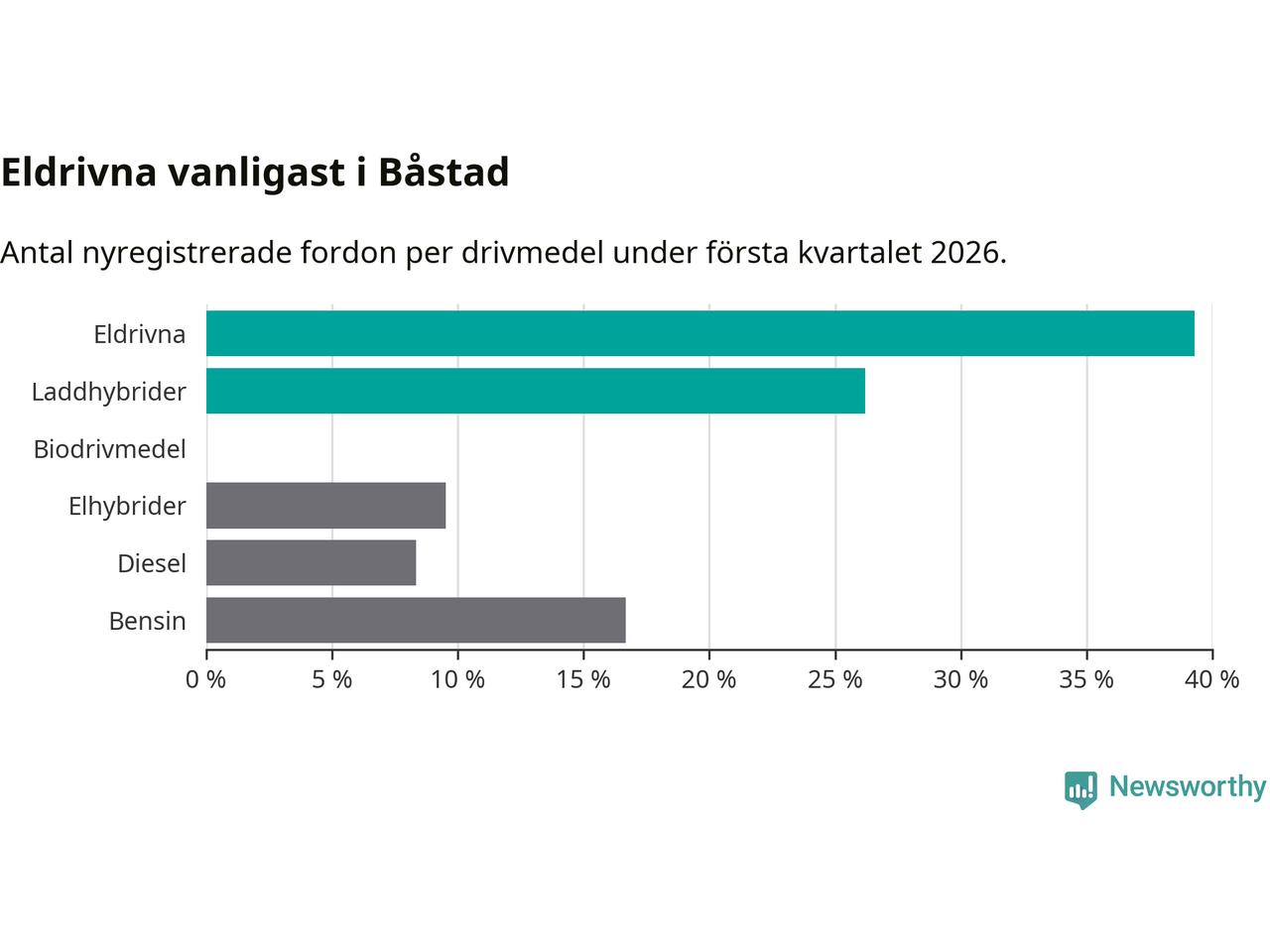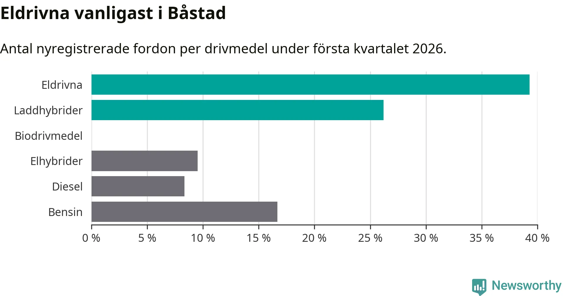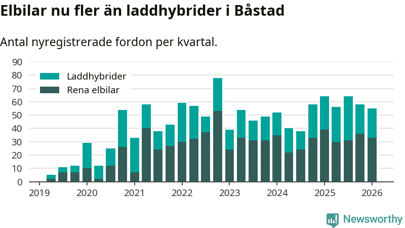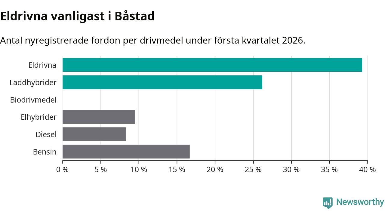 Under första kvartalet 2026 var 65 procent av alla nyregistrerade personbilar i Båstad laddbara (sammanlagt registrerades 84 nya bilar). Merparten av de laddbara bilarna var rena elbilar (39 procent av alla).
