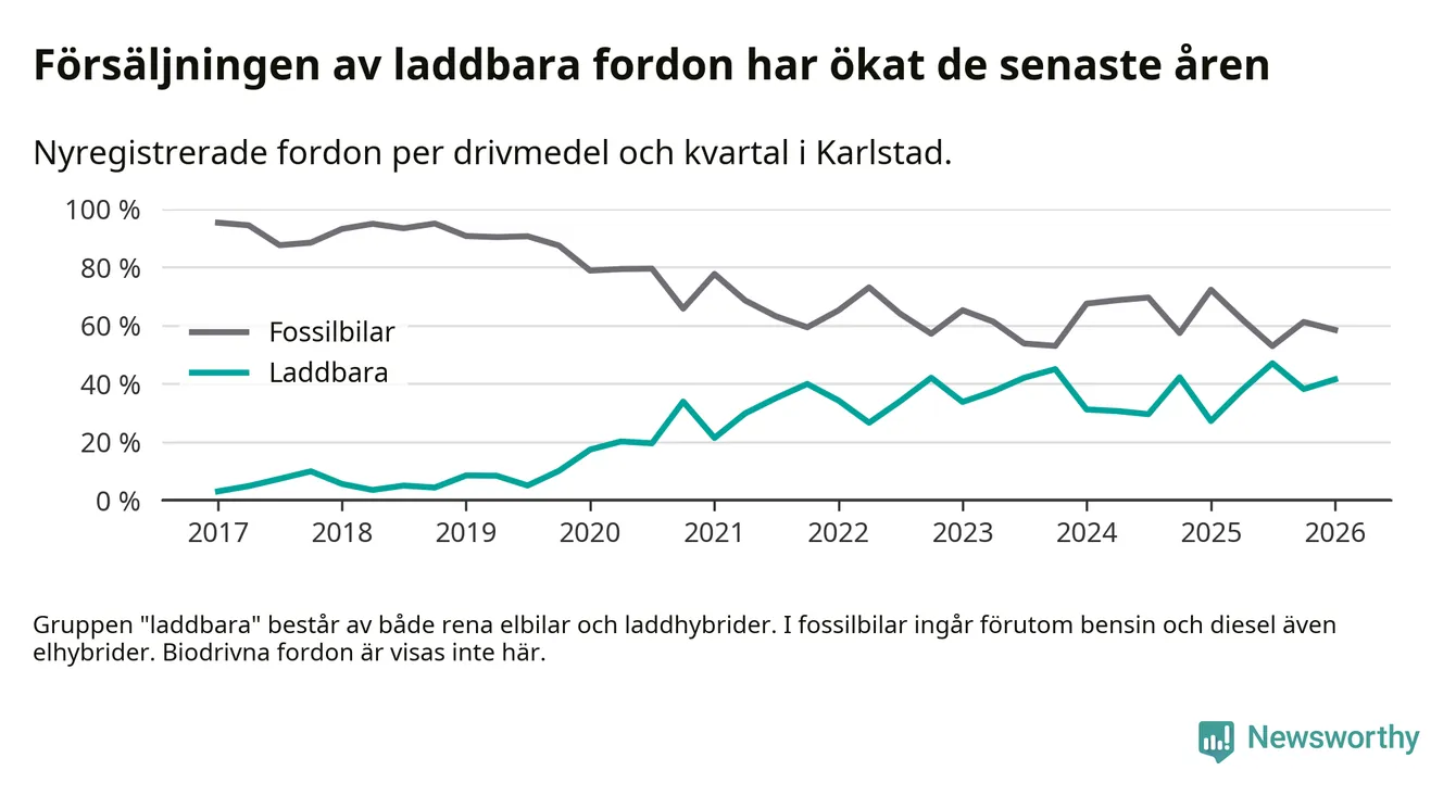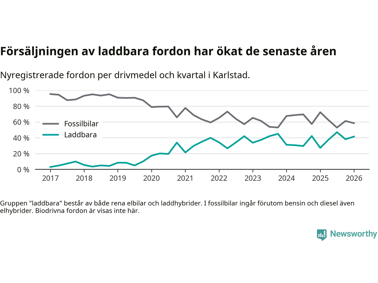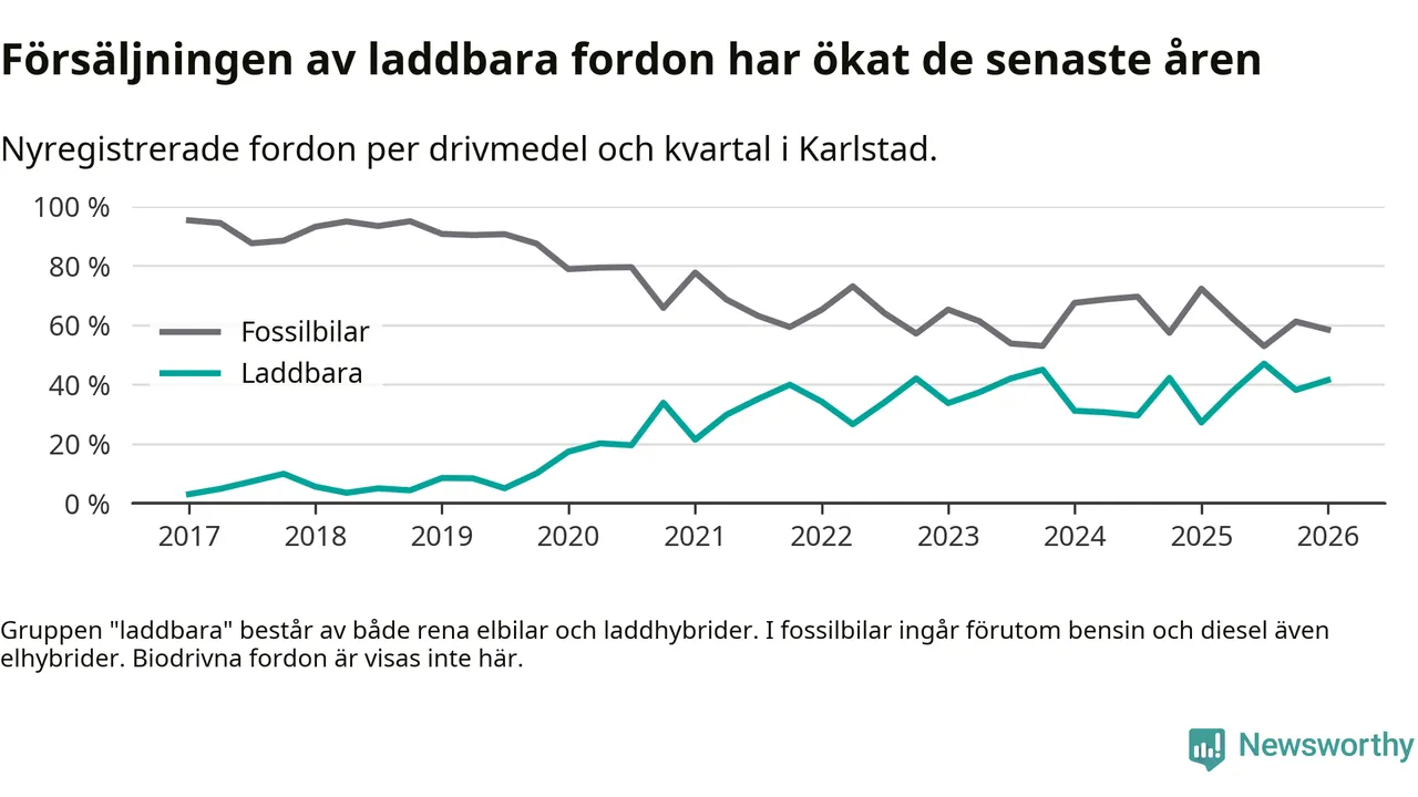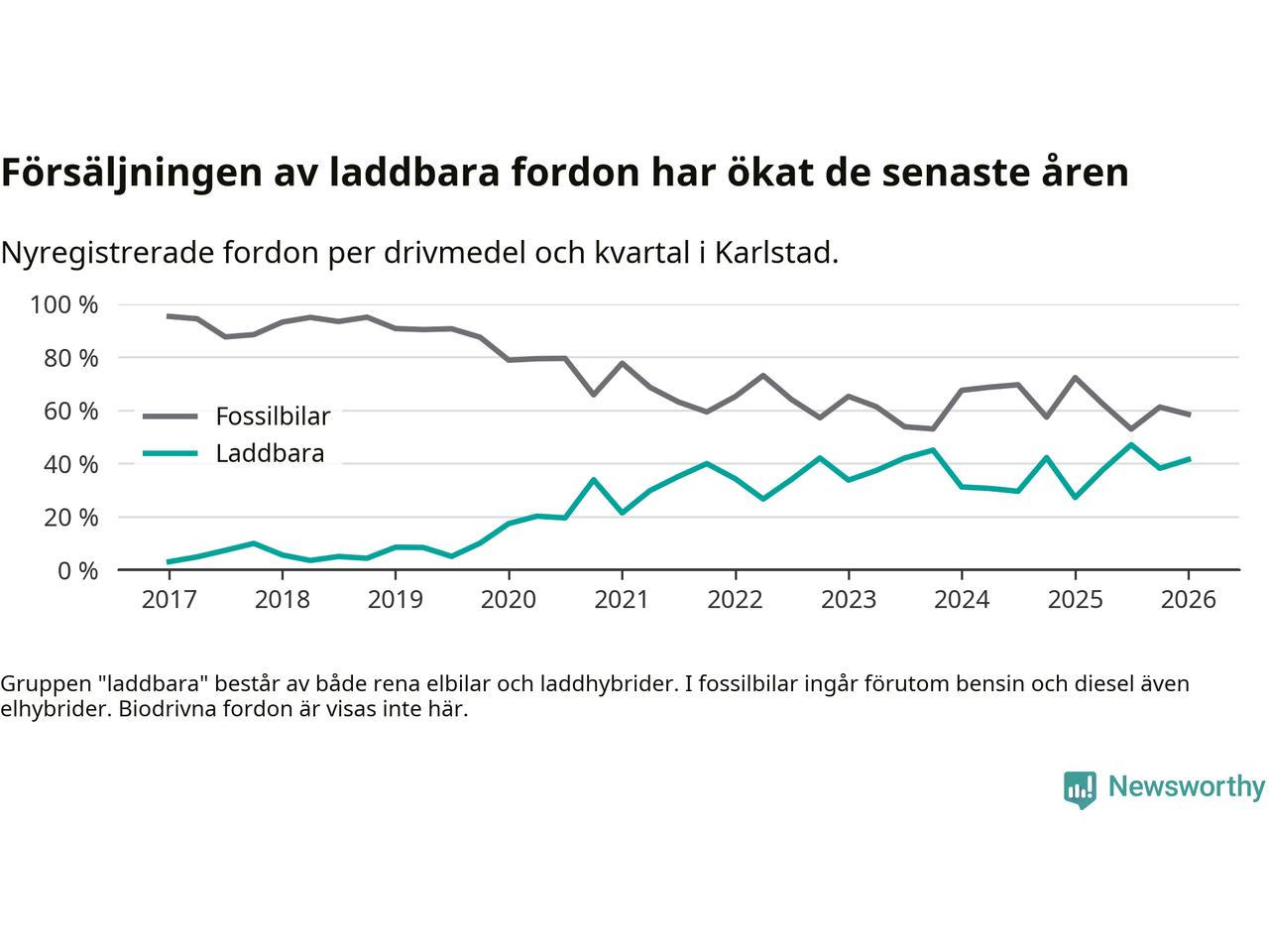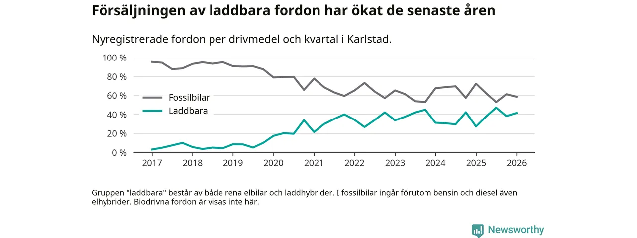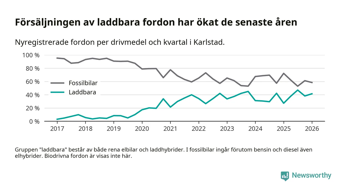 Under första kvartalet 2026 var 42 procent av alla nyregistrerade personbilar i Karlstad laddbara (sammanlagt registrerades 771 nya bilar). Merparten av de laddbara bilarna var rena elbilar (23 procent av alla).
