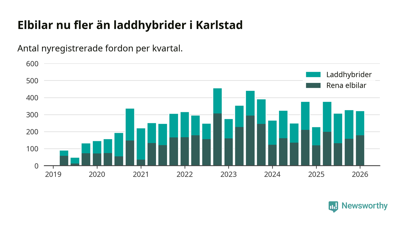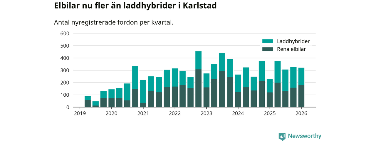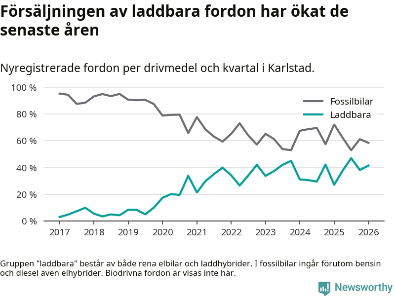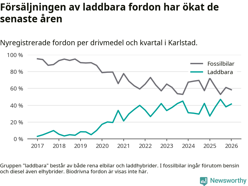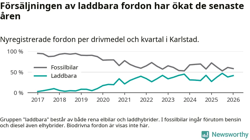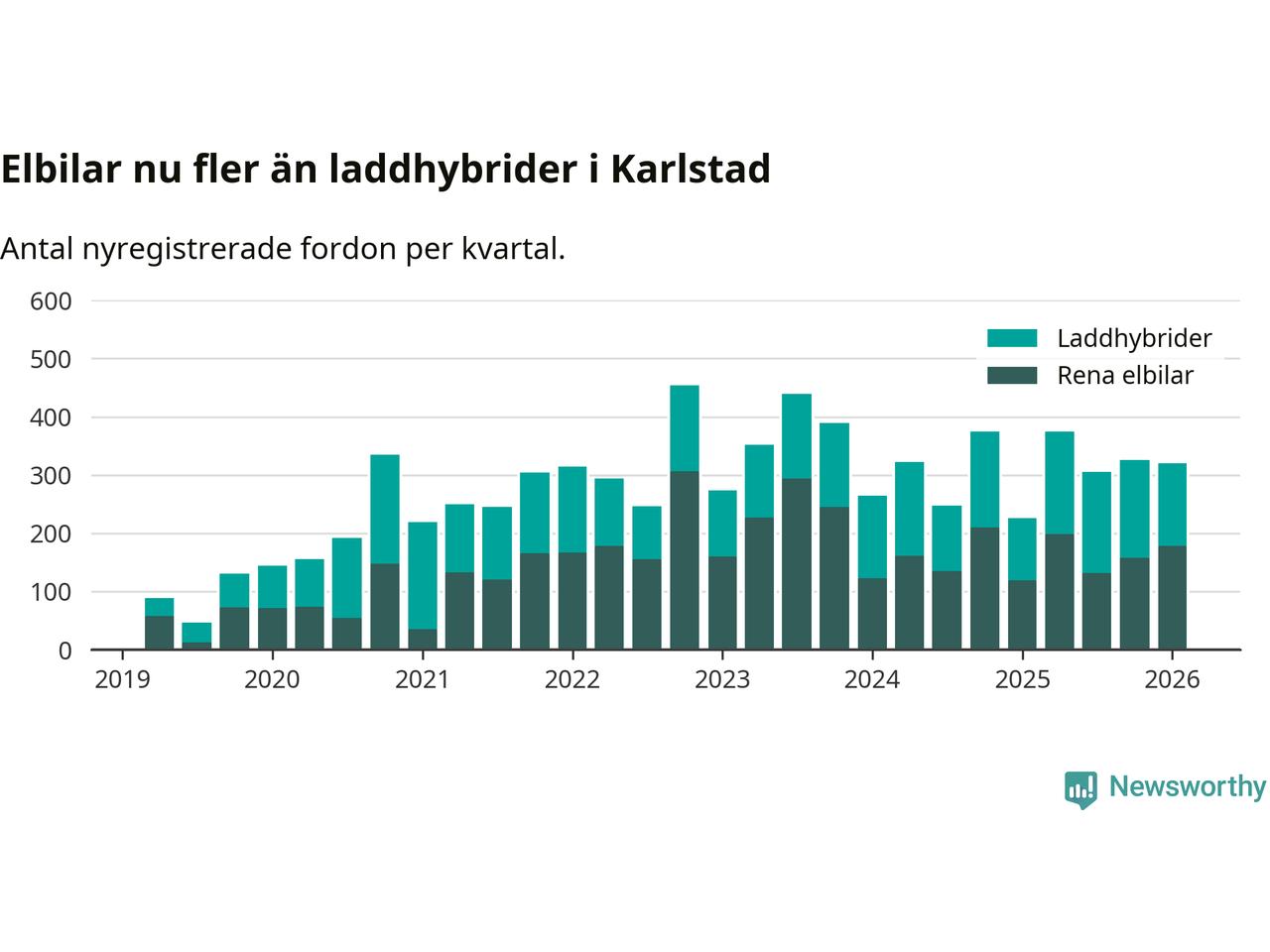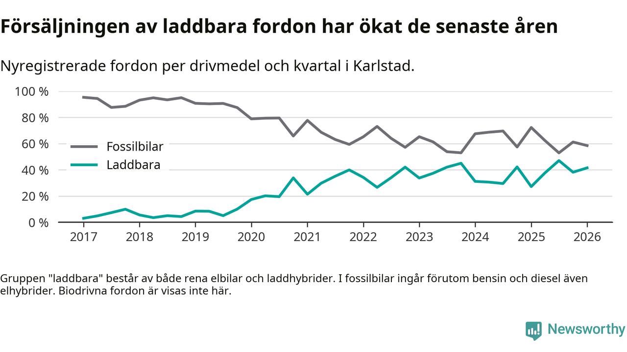 Under första kvartalet 2026 var 42 procent av alla nyregistrerade personbilar i Karlstad laddbara (sammanlagt registrerades 771 nya bilar). Merparten av de laddbara bilarna var rena elbilar (23 procent av alla).