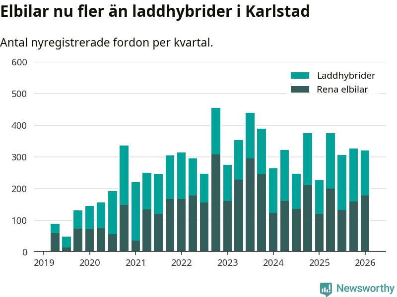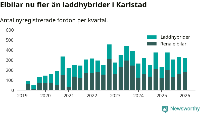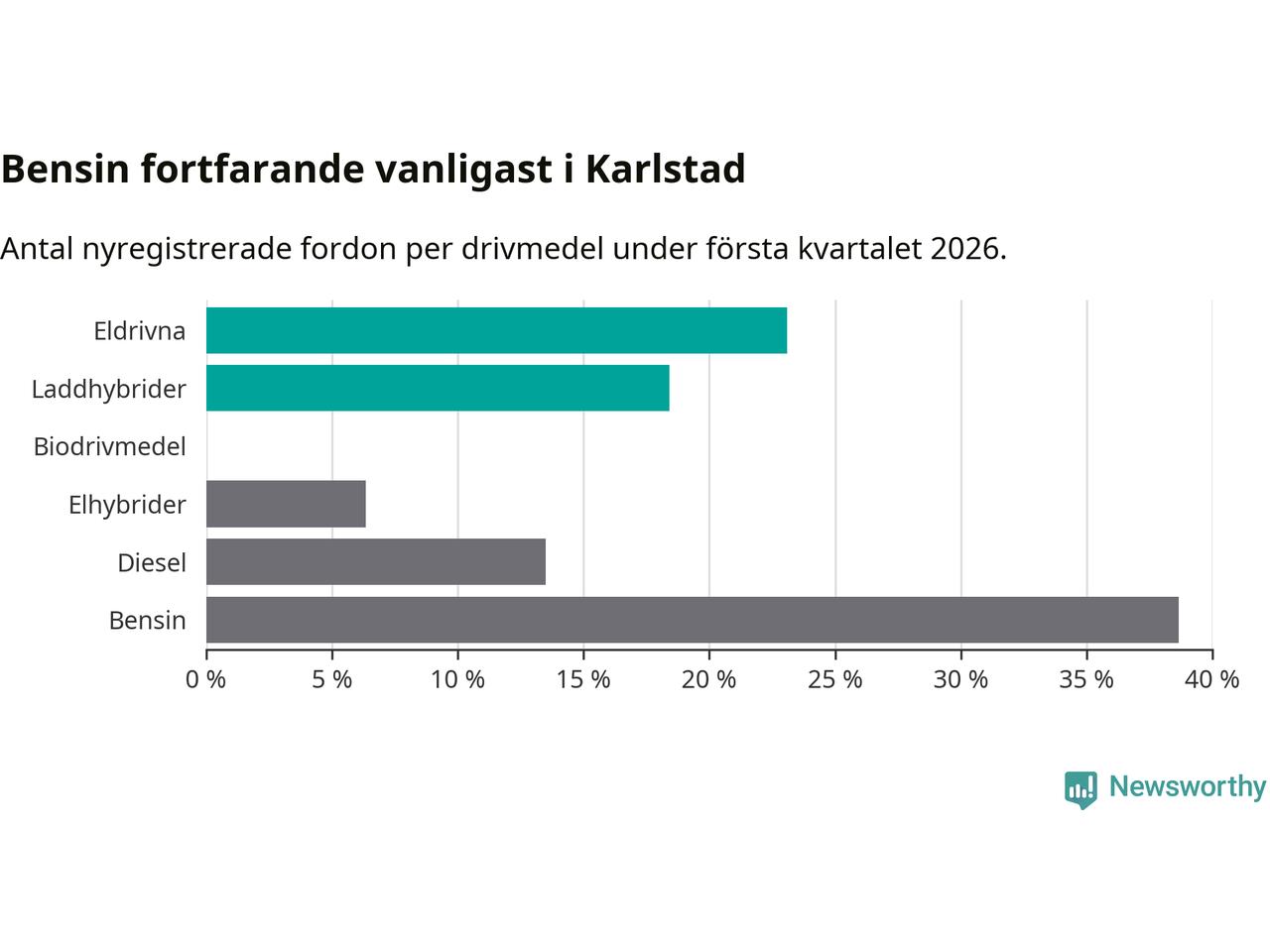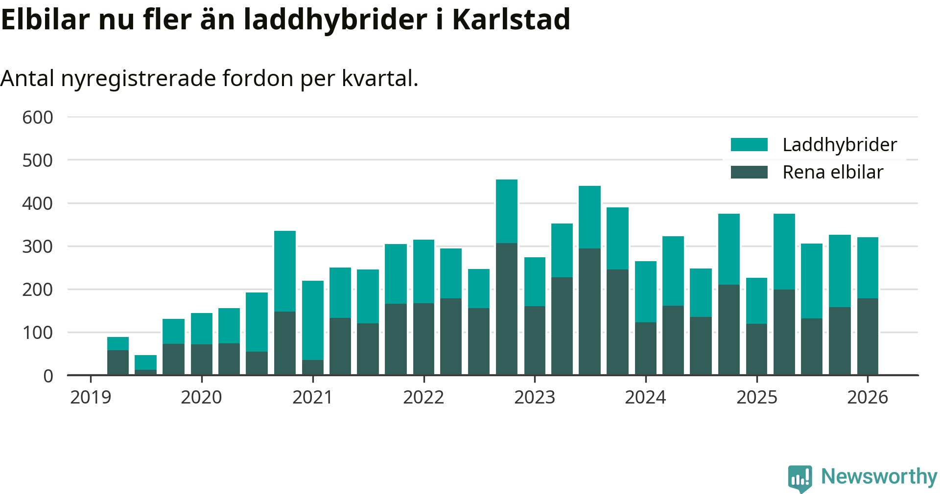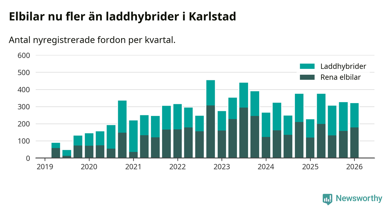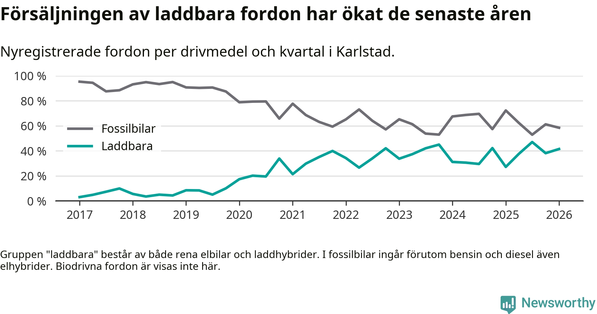 Under första kvartalet 2026 var 42 procent av alla nyregistrerade personbilar i Karlstad laddbara (sammanlagt registrerades 771 nya bilar). Merparten av de laddbara bilarna var rena elbilar (23 procent av alla).