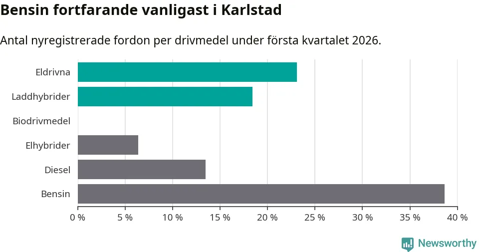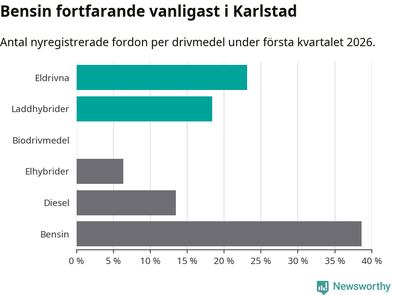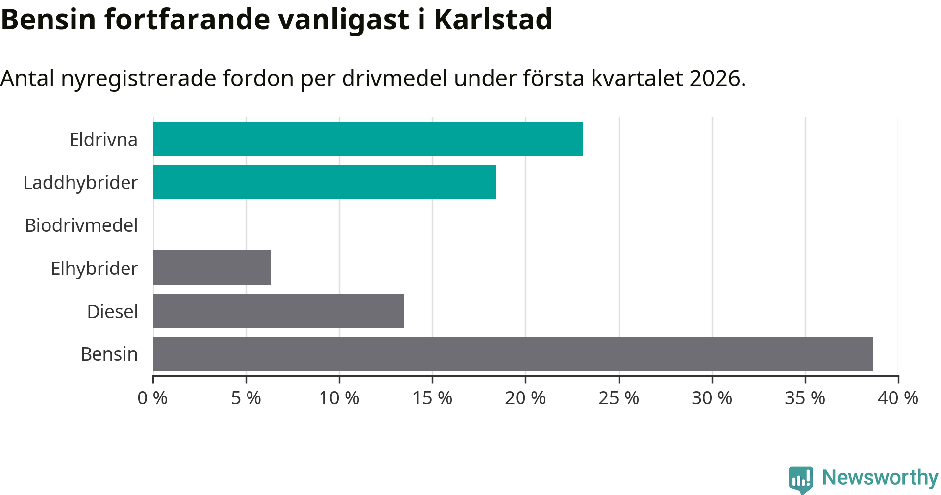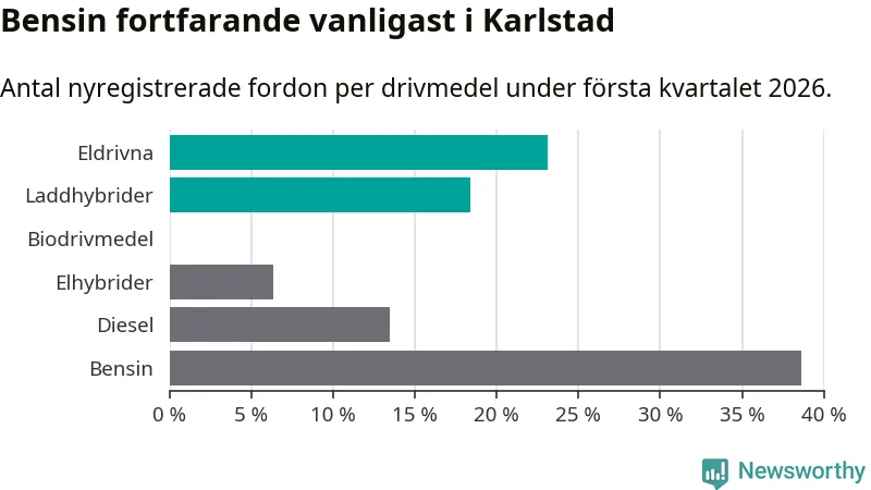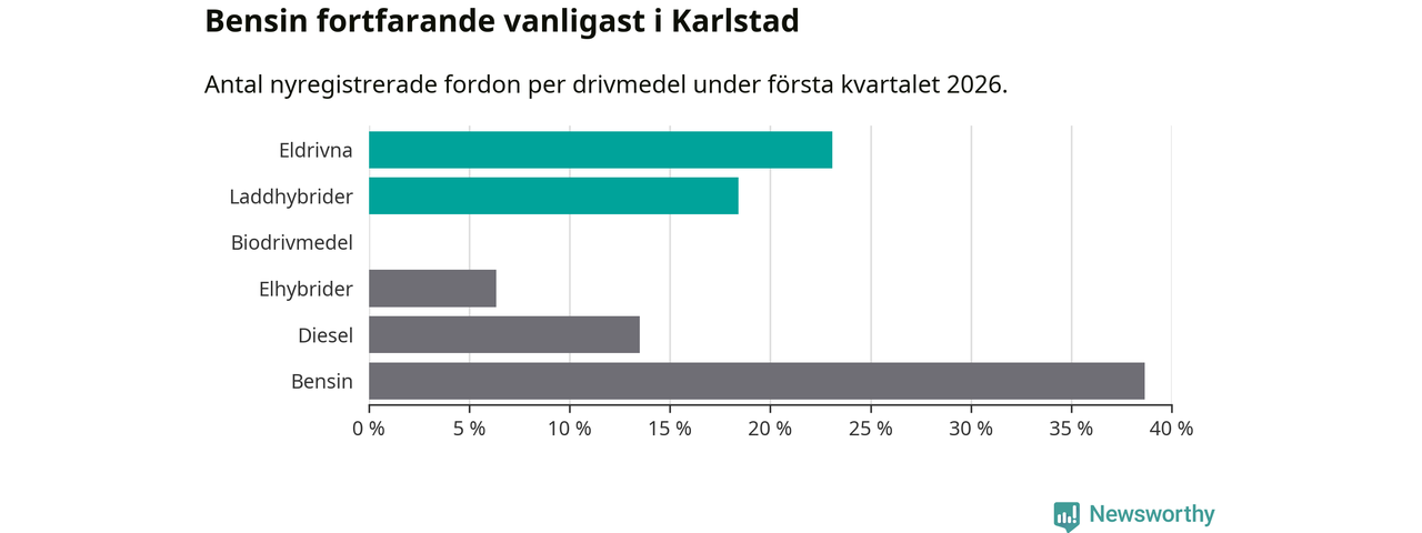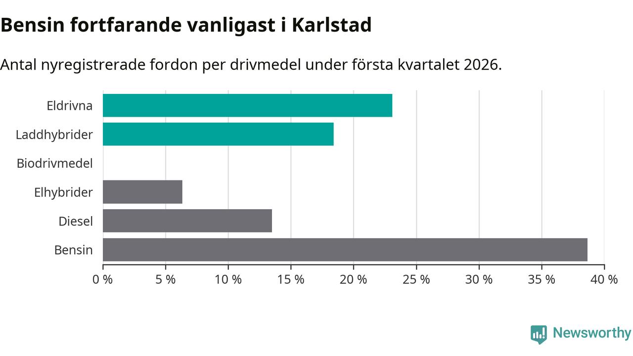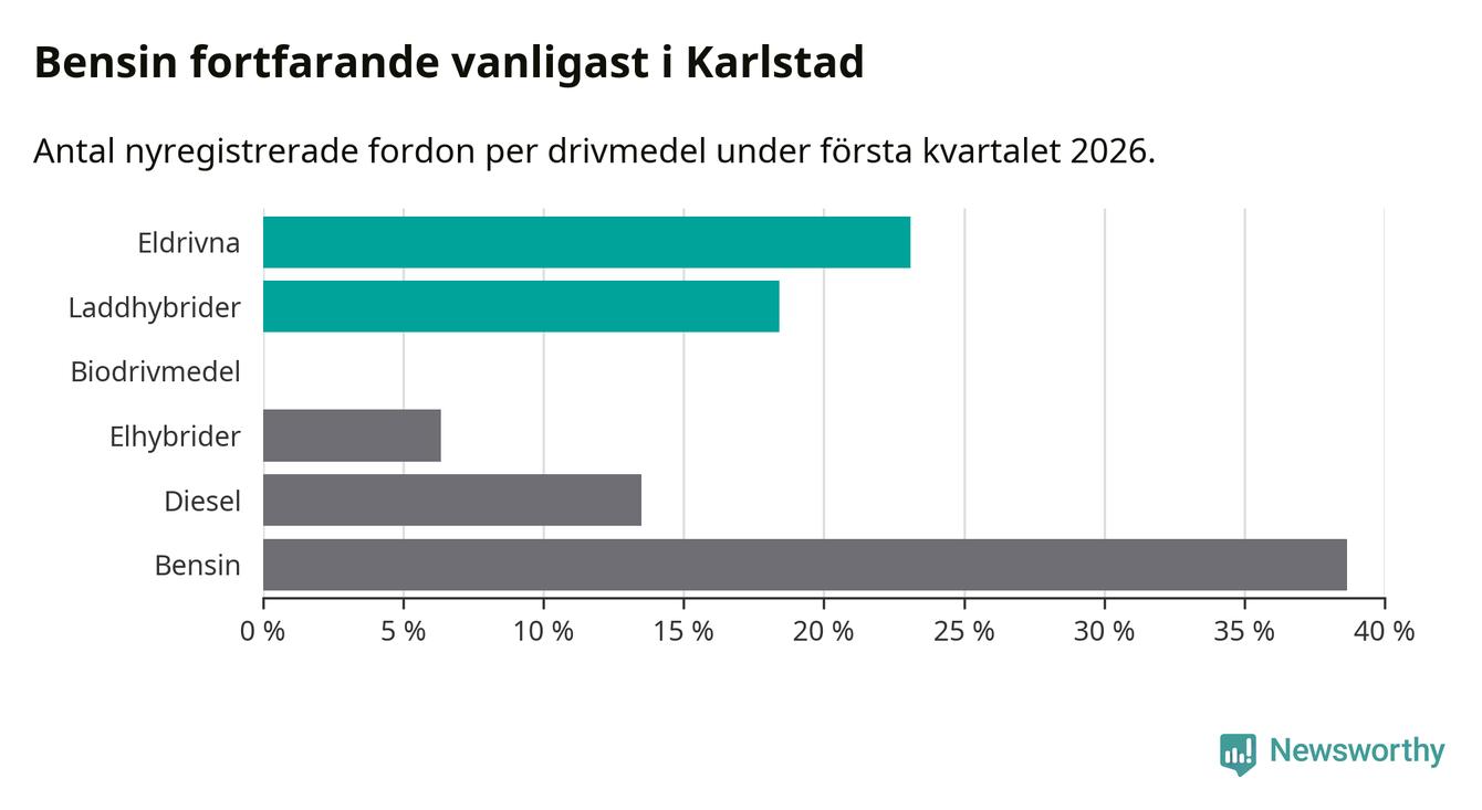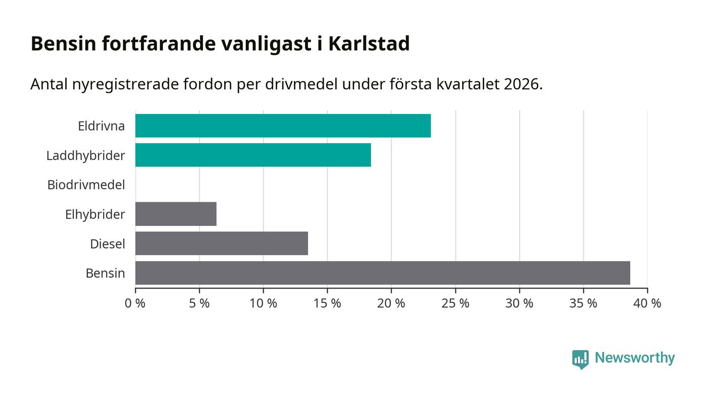 Under första kvartalet 2026 var 42 procent av alla nyregistrerade personbilar i Karlstad laddbara (sammanlagt registrerades 771 nya bilar). Merparten av de laddbara bilarna var rena elbilar (23 procent av alla).