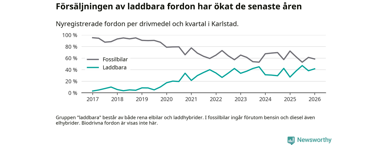 I Karlstad ökade andelen laddbara bilar under första kvartalet jämfört med kvartalet innan (+3,3 procentenheter). Men elbilsregistreringen har legat ännu högre. Nyregistreringen peakade under tredje kvartalet 2025 då 47 procent av de nya bilarna var laddbara.