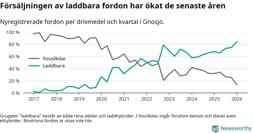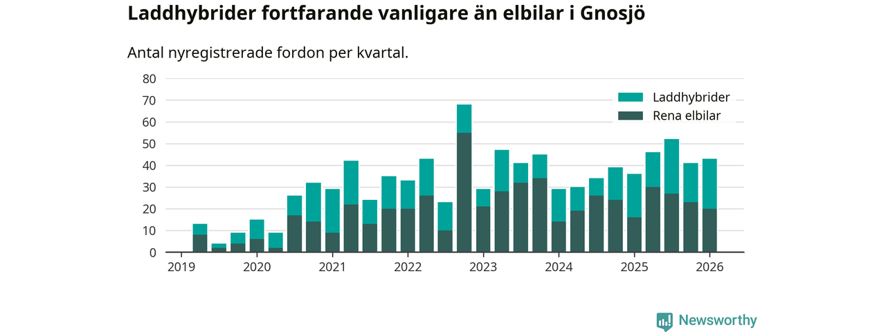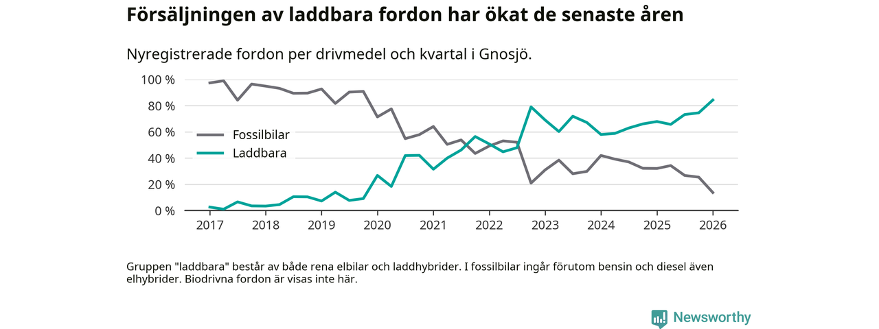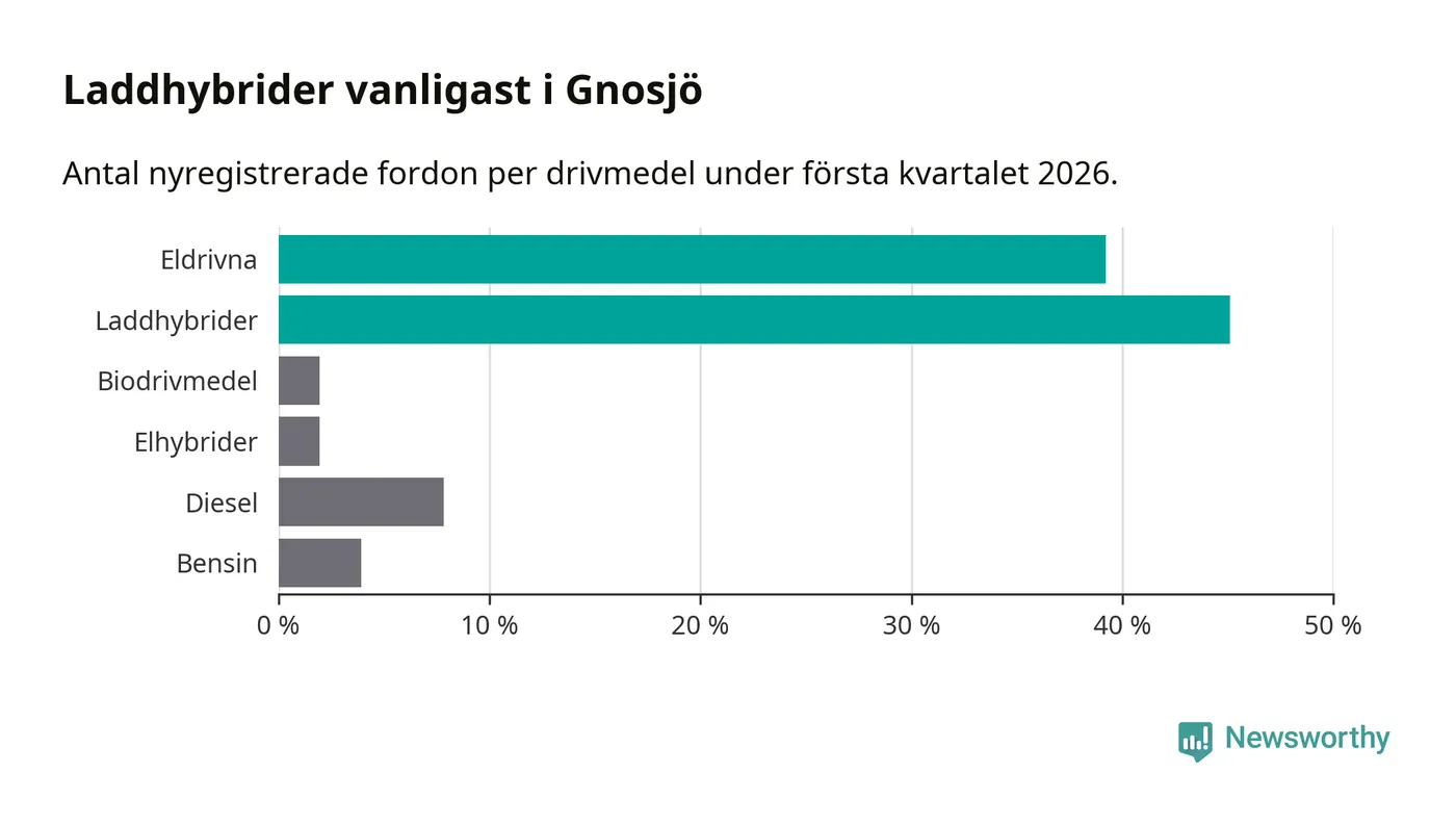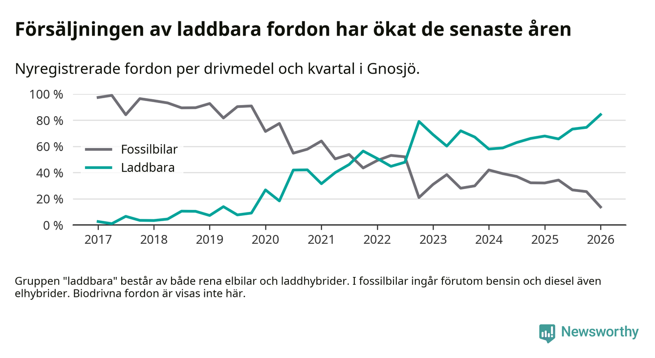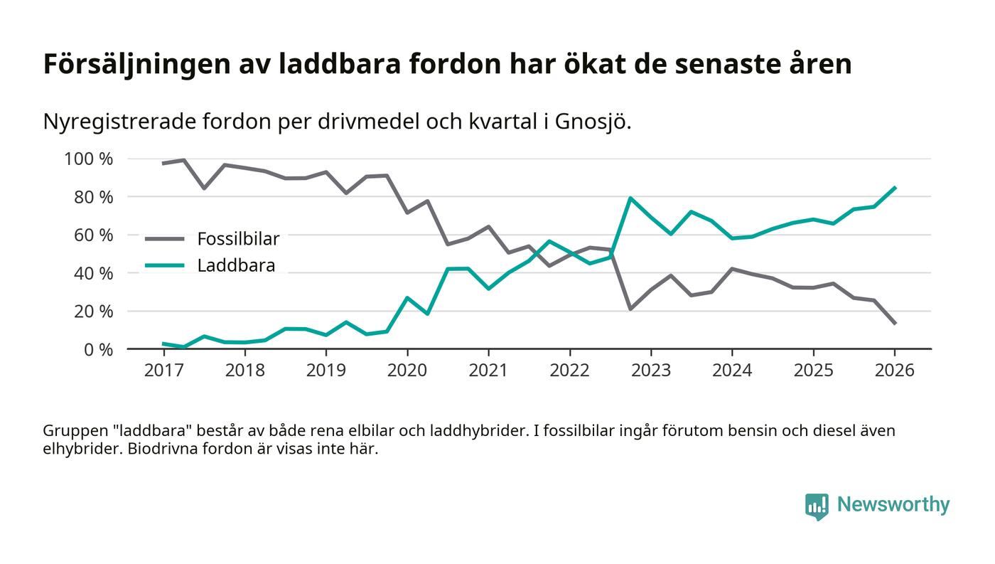 Under första kvartalet 2026 var 84 procent av alla nyregistrerade personbilar i Gnosjö laddbara (sammanlagt registrerades 51 nya bilar). Merparten av de laddbara bilarna var så kallade laddhybrider, det vill säga fordon som går att ladda och köra på el, men som även har en förbränningsmotor. 39 procent av alla nya bilar var rena elbilar.