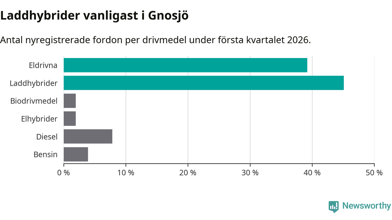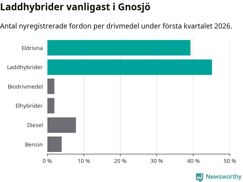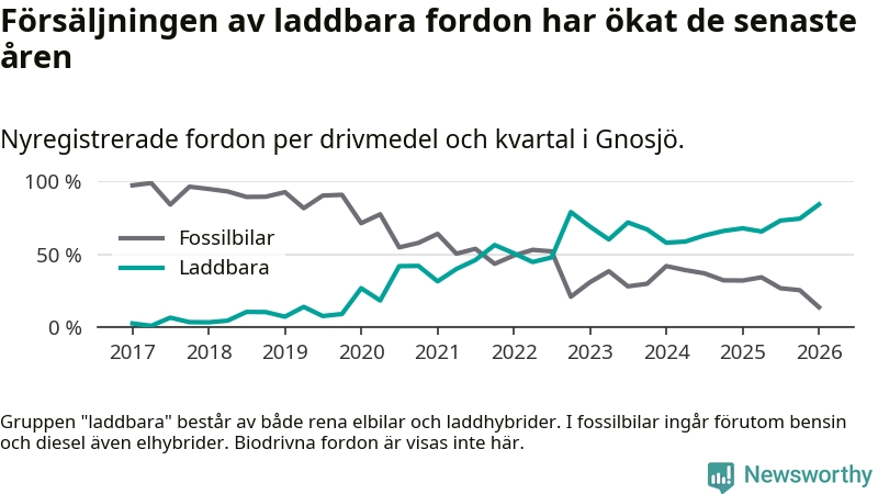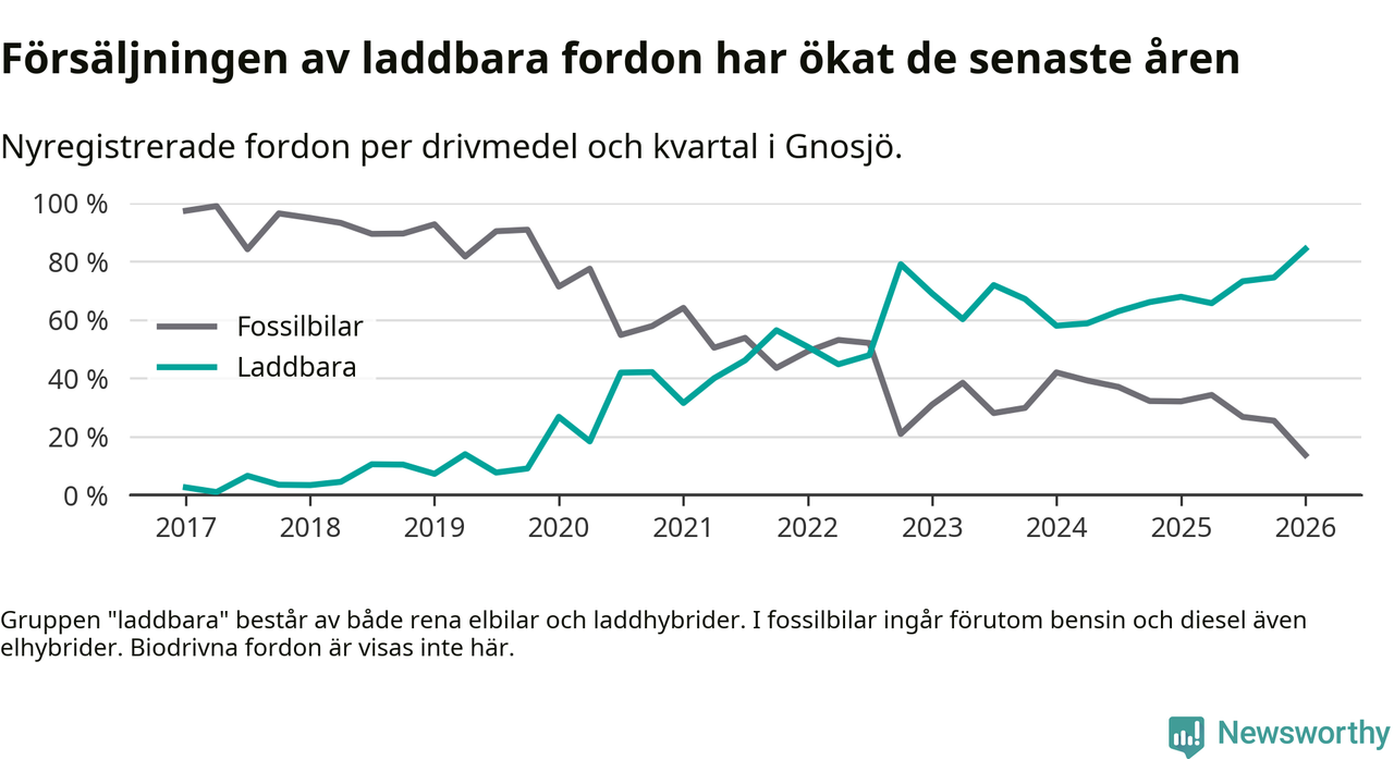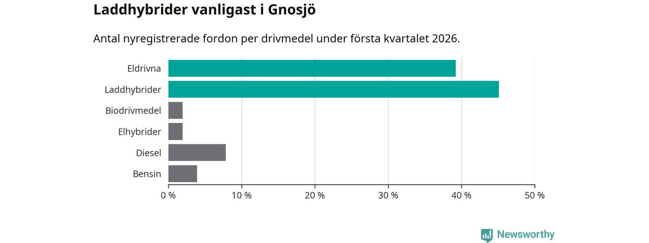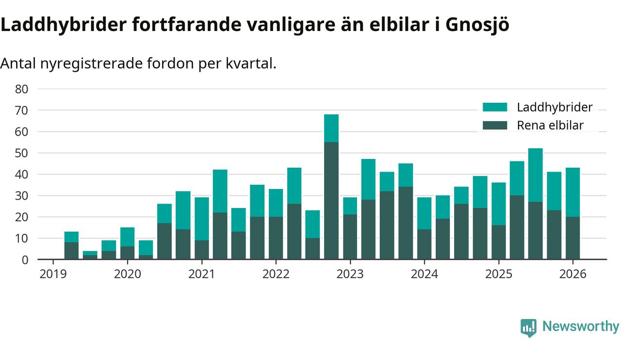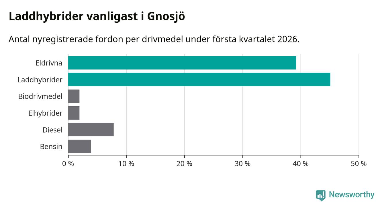 Under första kvartalet 2026 var 84 procent av alla nyregistrerade personbilar i Gnosjö laddbara (sammanlagt registrerades 51 nya bilar). Merparten av de laddbara bilarna var så kallade laddhybrider, det vill säga fordon som går att ladda och köra på el, men som även har en förbränningsmotor. 39 procent av alla nya bilar var rena elbilar.