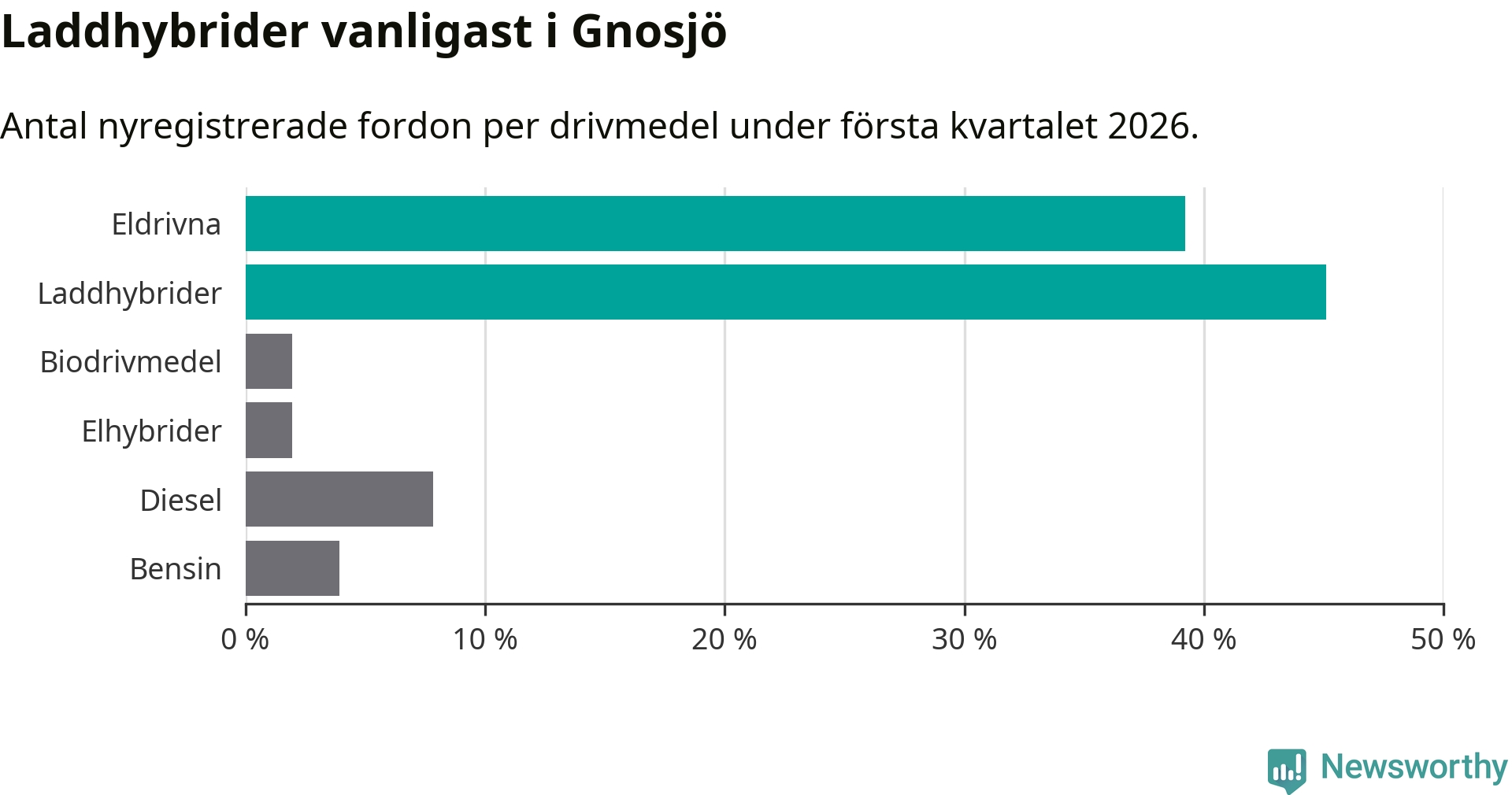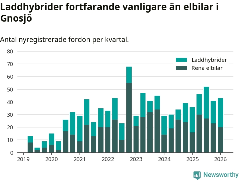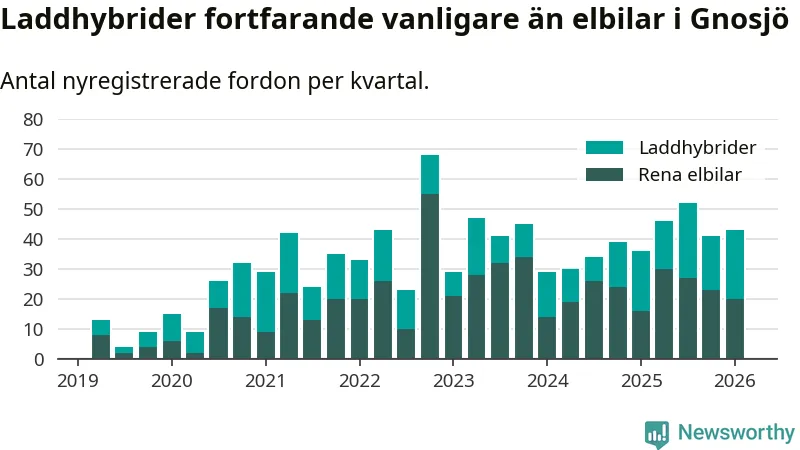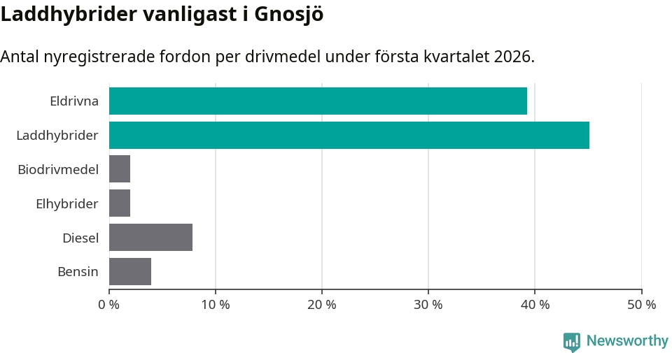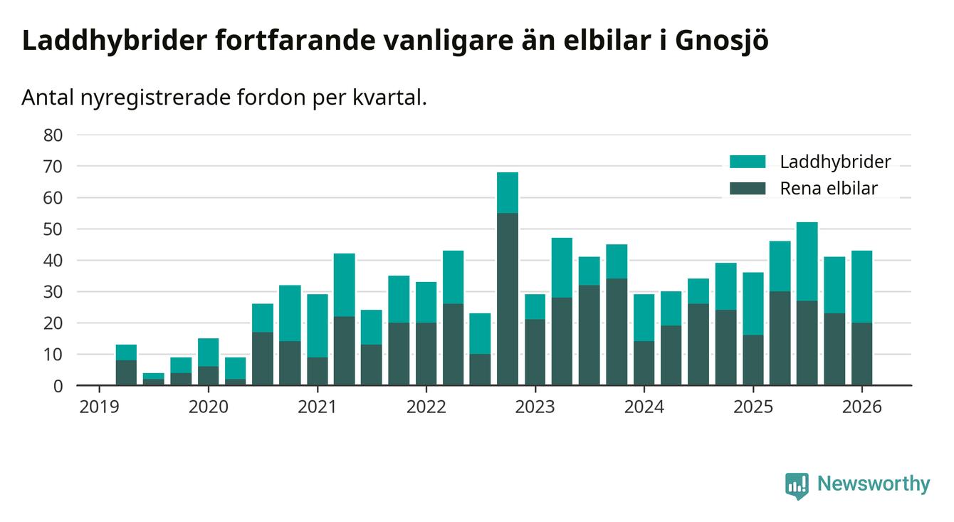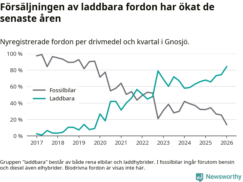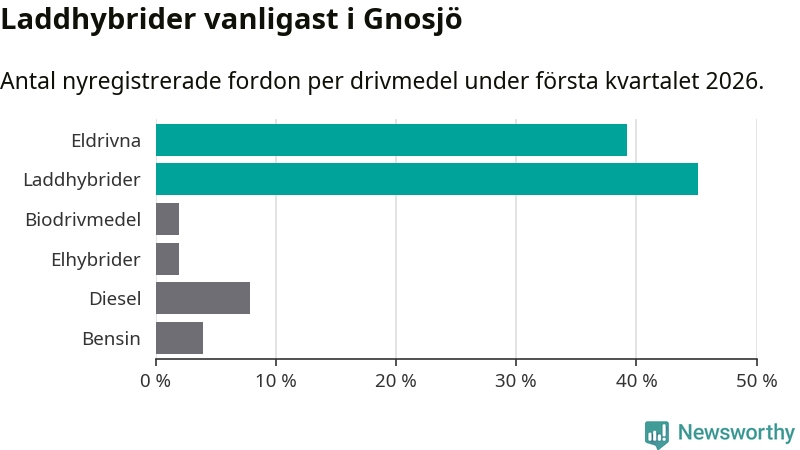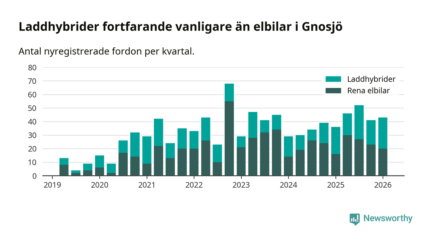Under första kvartalet 2026 var 84 procent av alla nyregistrerade personbilar i Gnosjö laddbara (sammanlagt registrerades 51 nya bilar). Merparten av de laddbara bilarna var så kallade laddhybrider, det vill säga fordon som går att ladda och köra på el, men som även har en förbränningsmotor. 39 procent av alla nya bilar var rena elbilar.