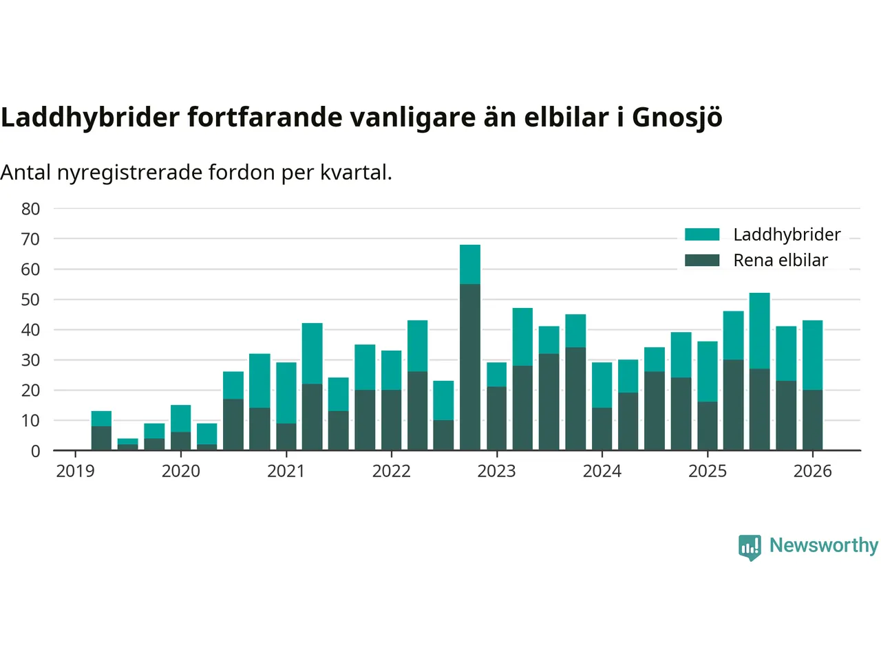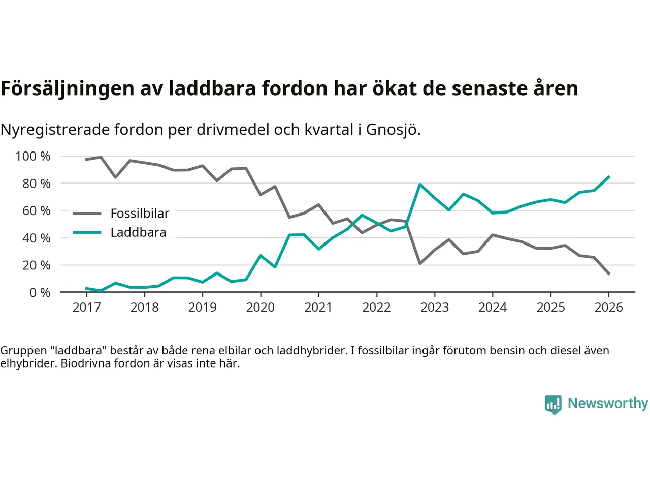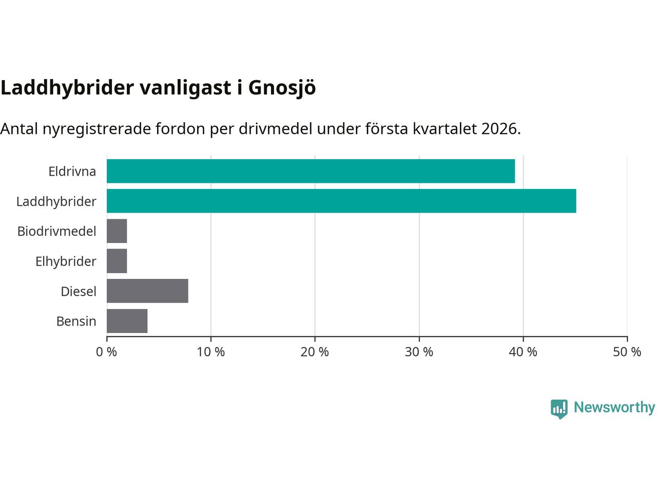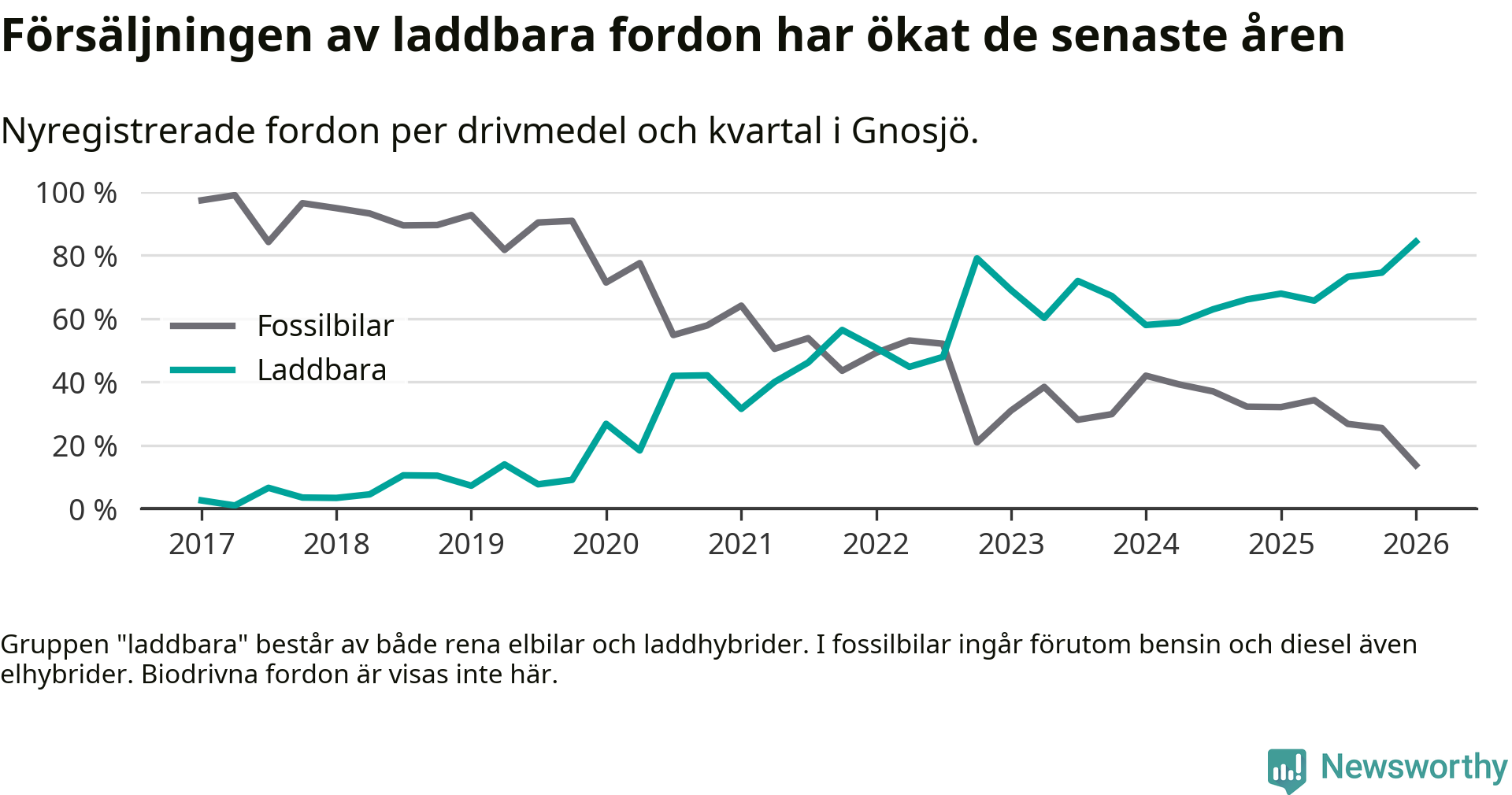 Under första kvartalet 2026 var 84 procent av alla nyregistrerade personbilar i Gnosjö laddbara (sammanlagt registrerades 51 nya bilar). Merparten av de laddbara bilarna var så kallade laddhybrider, det vill säga fordon som går att ladda och köra på el, men som även har en förbränningsmotor. 39 procent av alla nya bilar var rena elbilar.