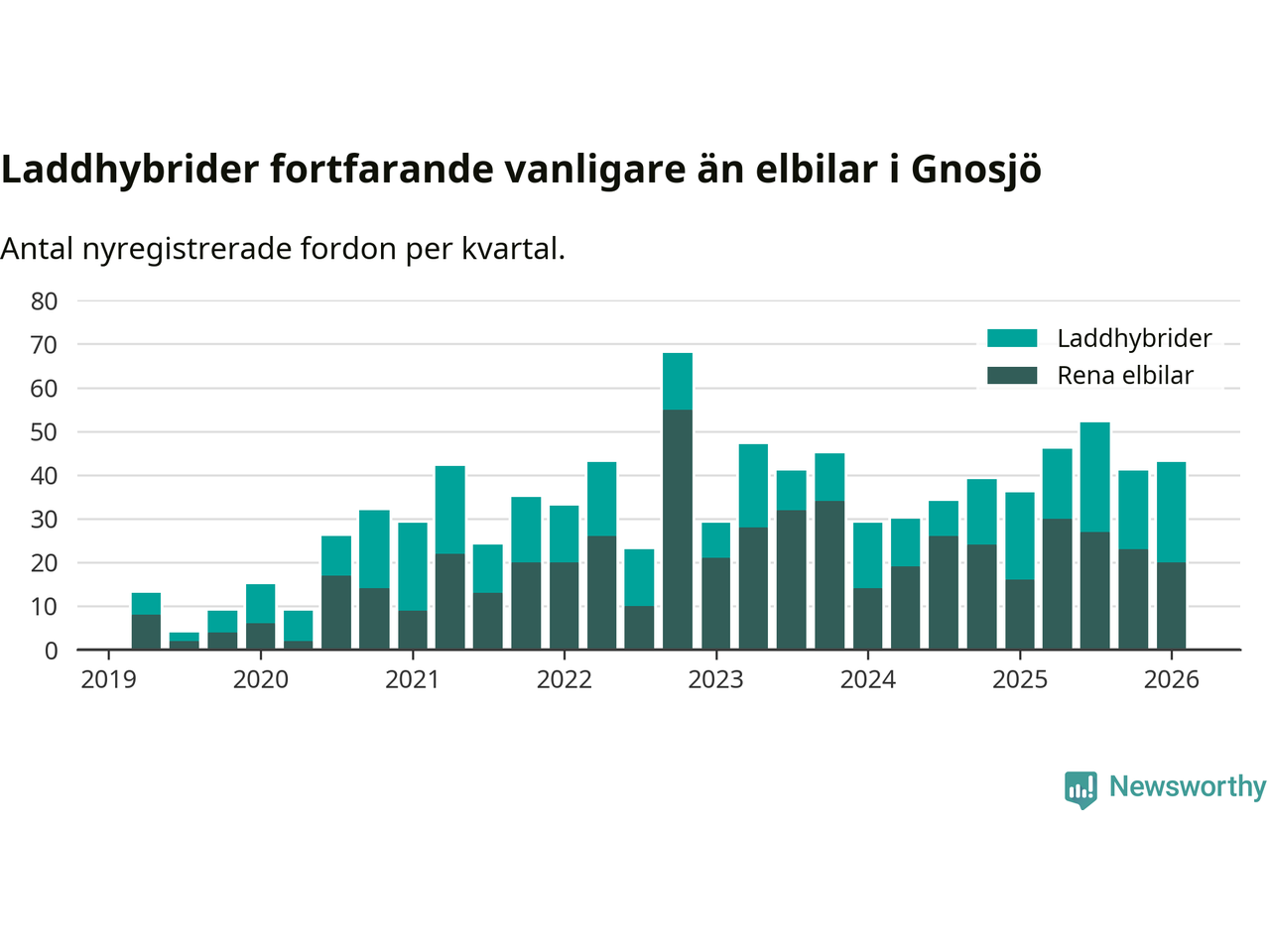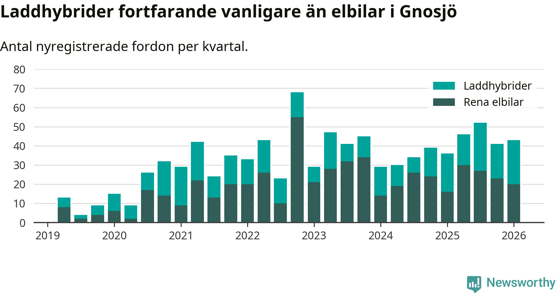 I Gnosjö noterades ett nytt rekord under första kvartalet. Aldrig tidigare har laddbara bilar utgjort en så stor del av alla nya bilar.