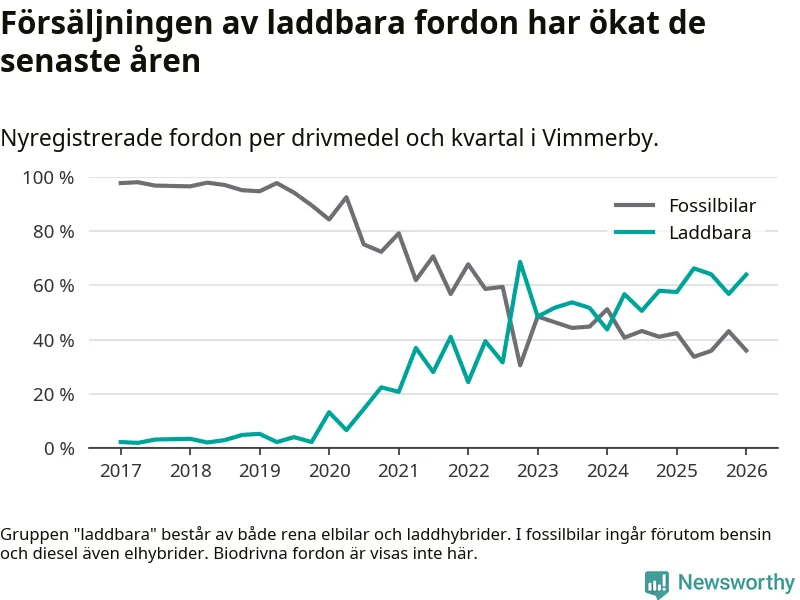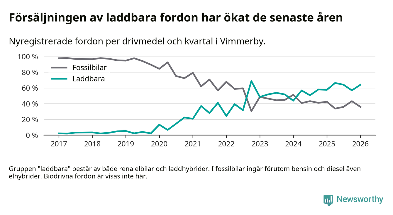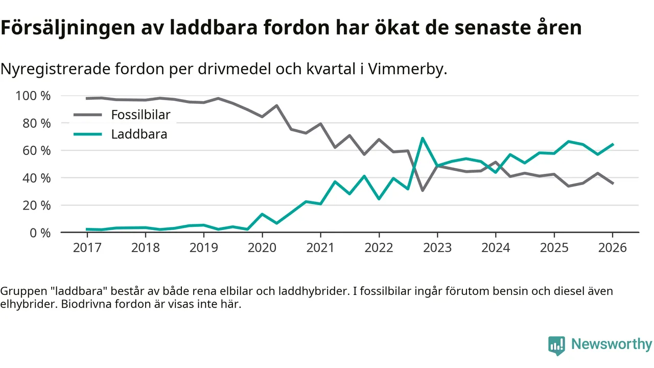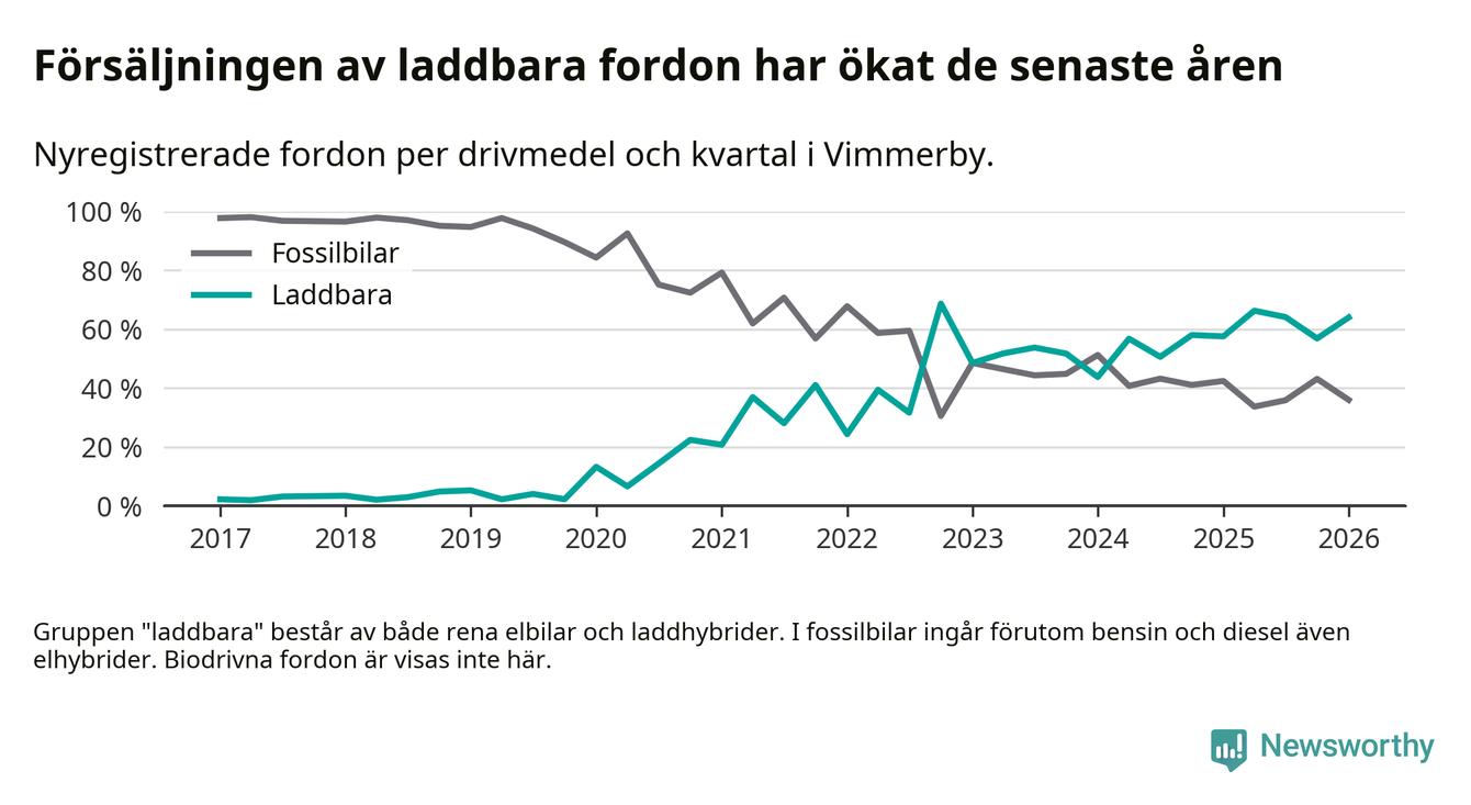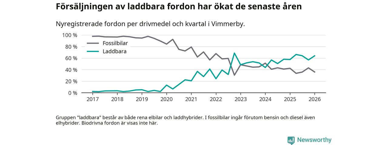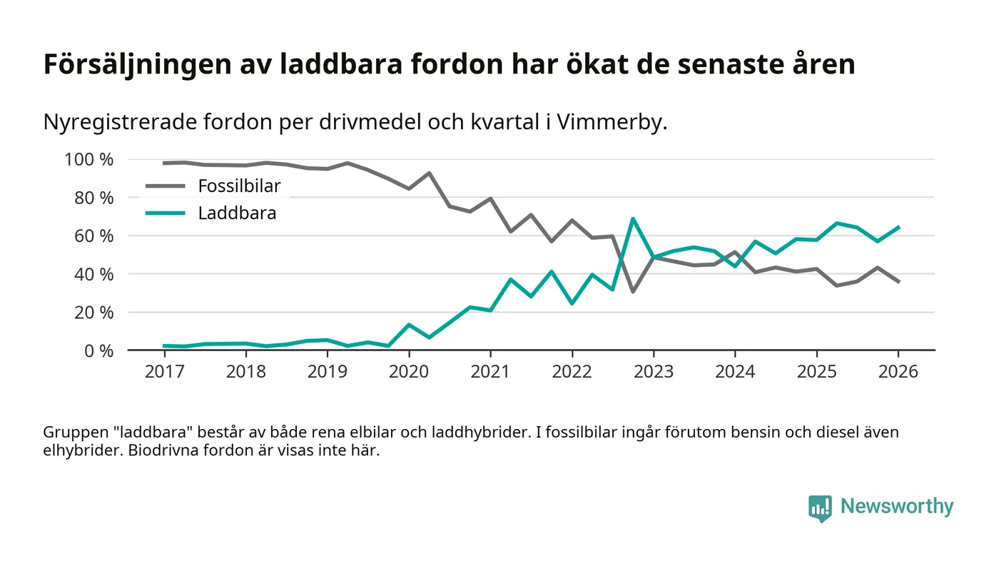 Under första kvartalet 2026 var 64 procent av alla nyregistrerade personbilar i Vimmerby laddbara (sammanlagt registrerades 75 nya bilar). Merparten av de laddbara bilarna var rena elbilar (32 procent av alla).