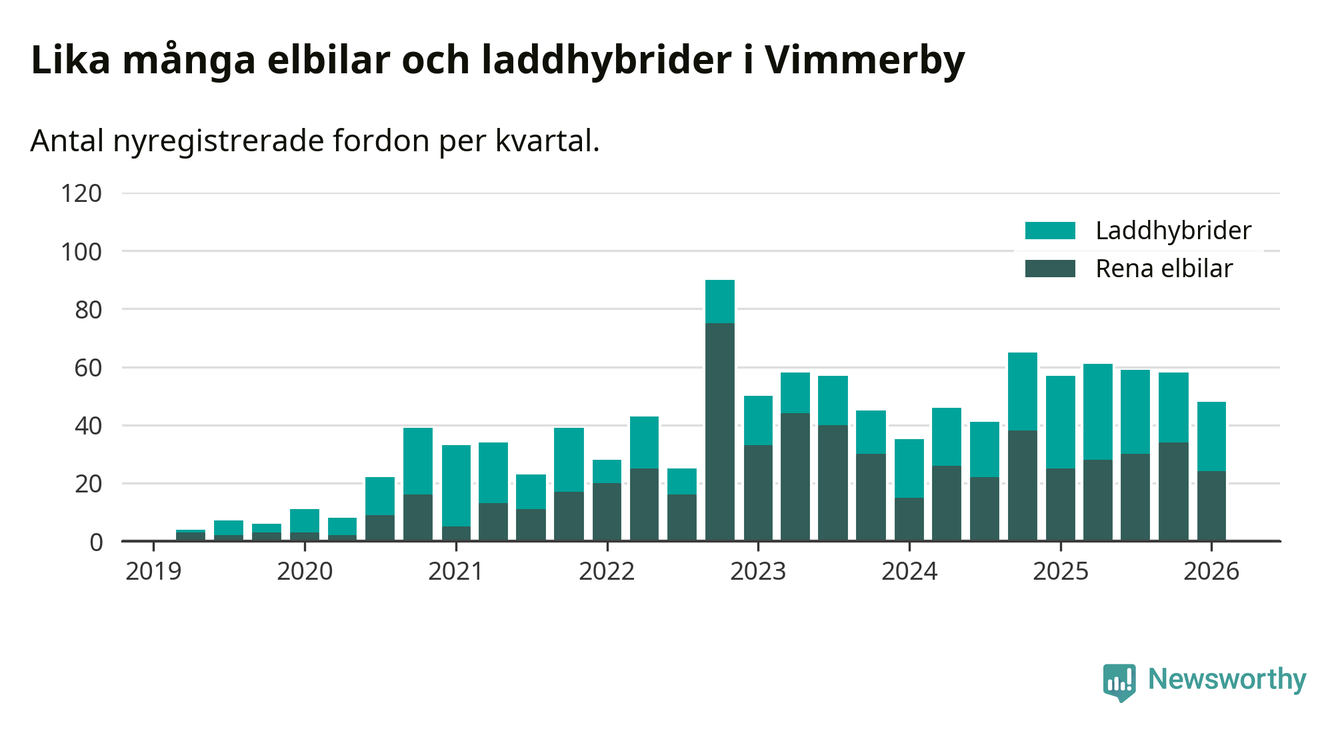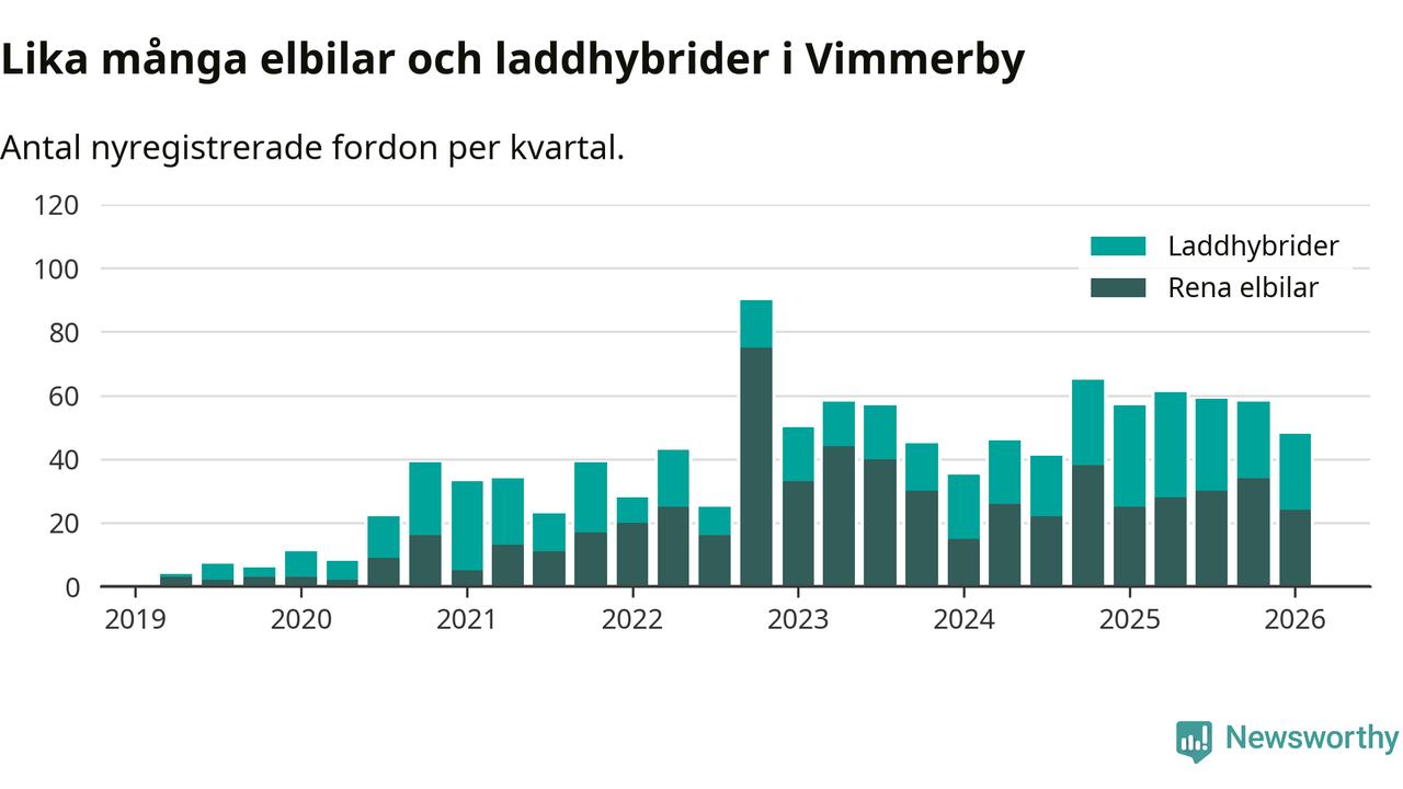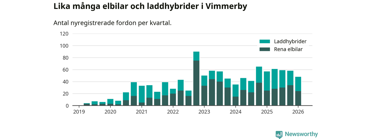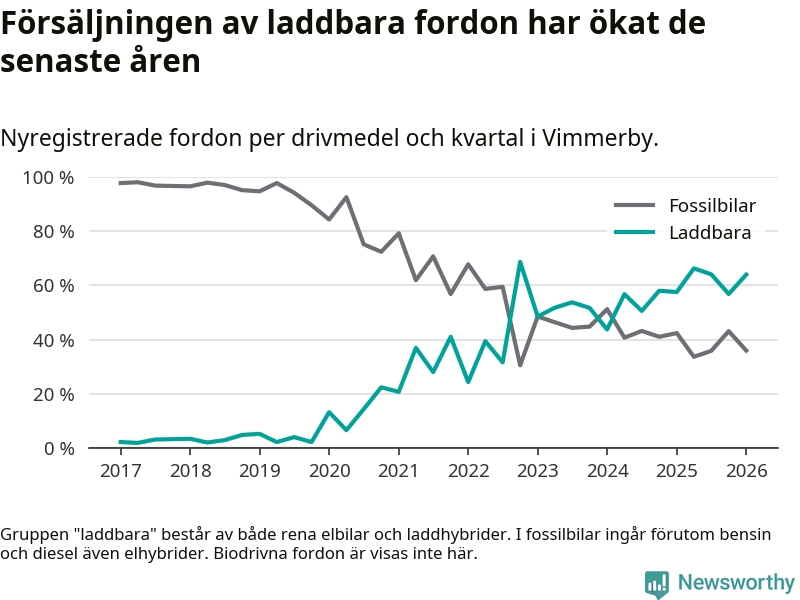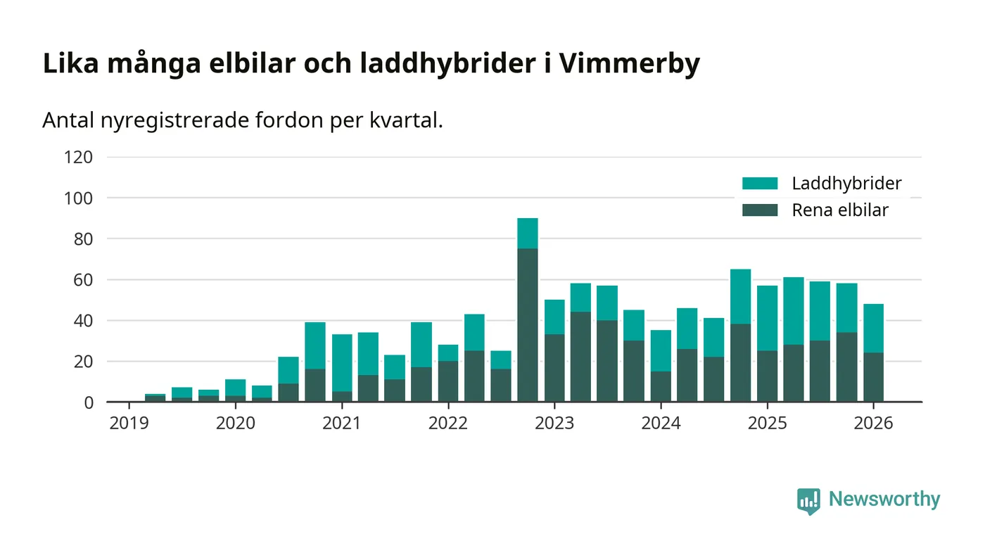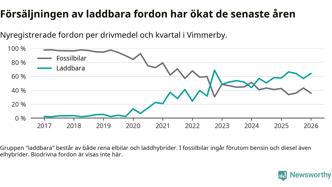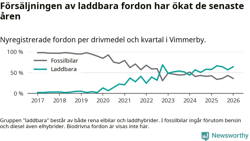 Under första kvartalet 2026 var 64 procent av alla nyregistrerade personbilar i Vimmerby laddbara (sammanlagt registrerades 75 nya bilar). Merparten av de laddbara bilarna var rena elbilar (32 procent av alla).
