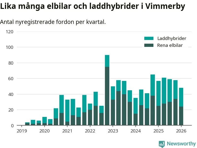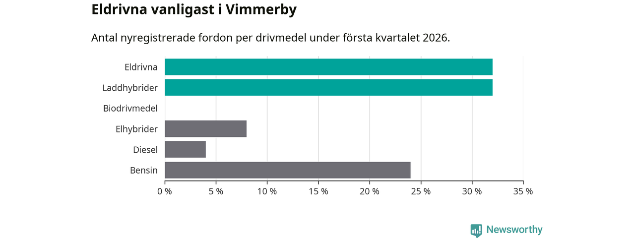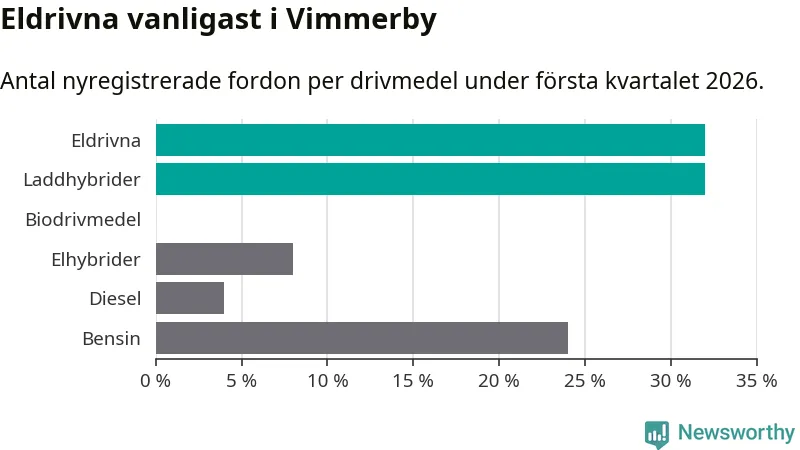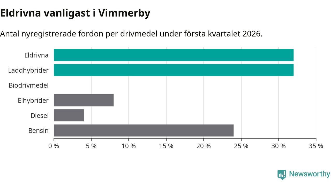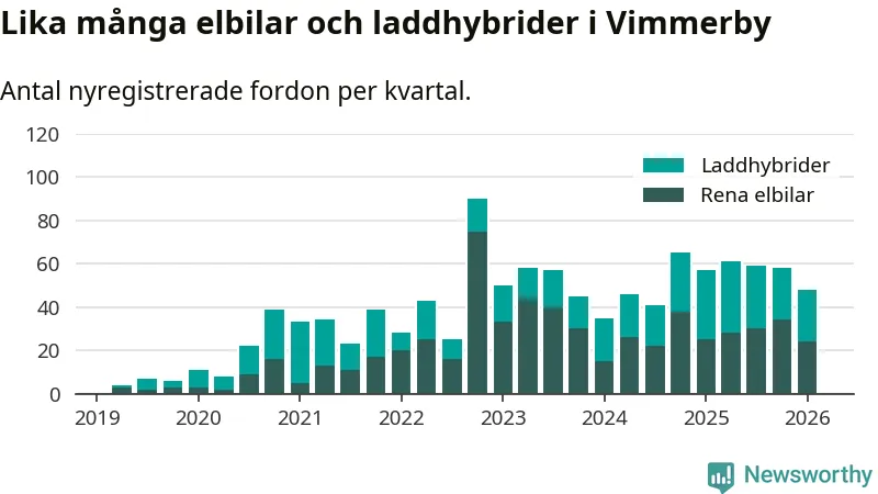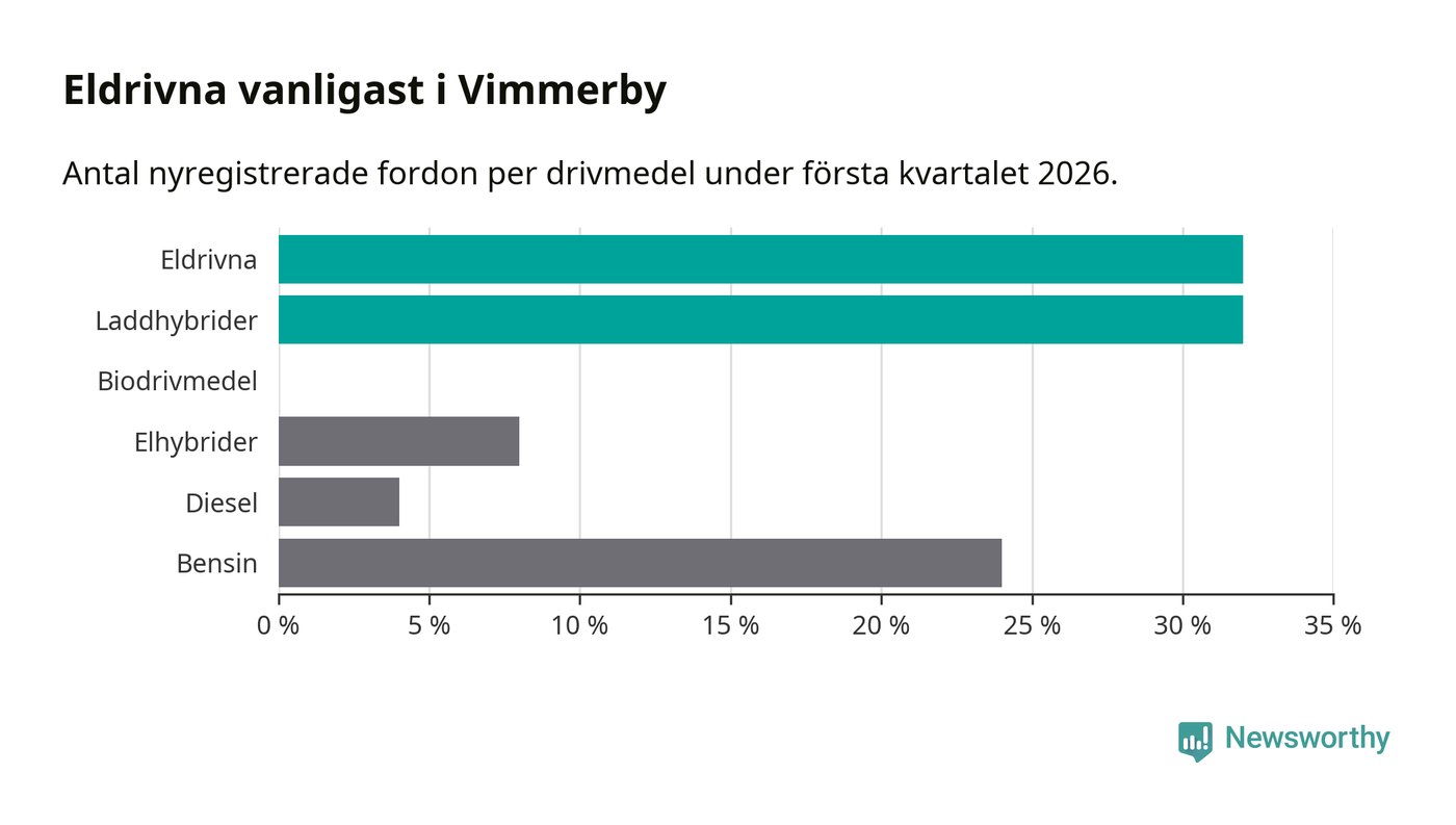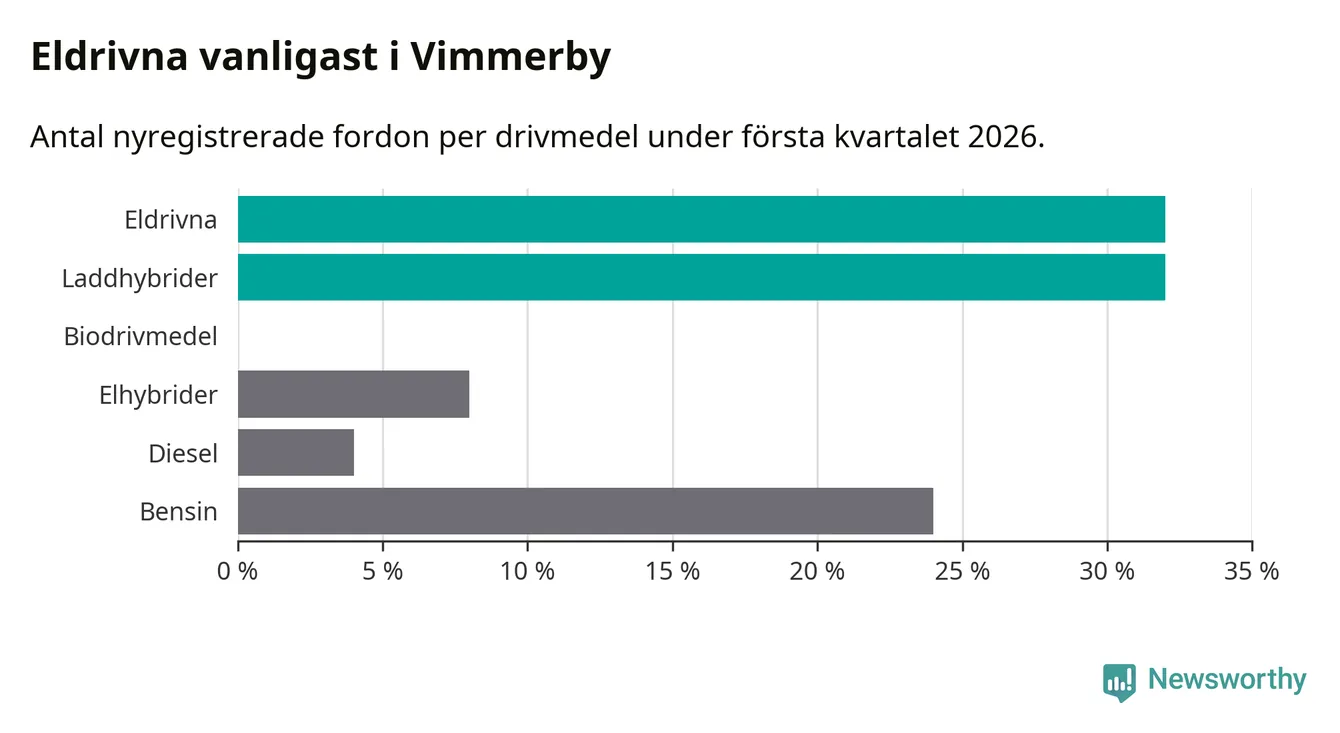 Under första kvartalet 2026 var 64 procent av alla nyregistrerade personbilar i Vimmerby laddbara (sammanlagt registrerades 75 nya bilar). Merparten av de laddbara bilarna var rena elbilar (32 procent av alla).