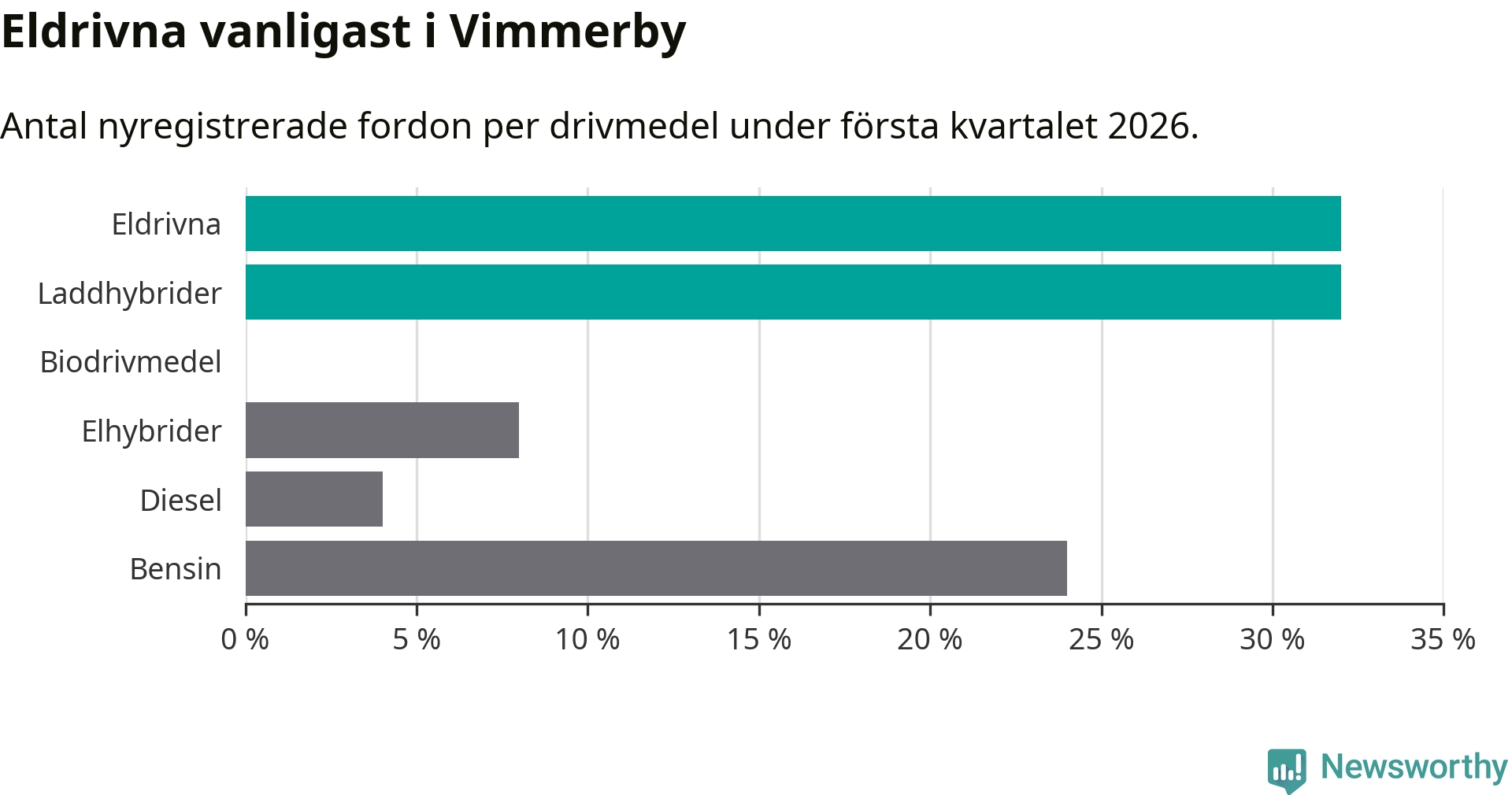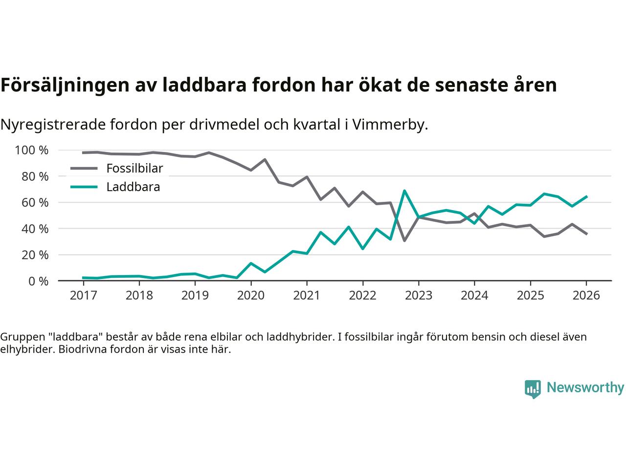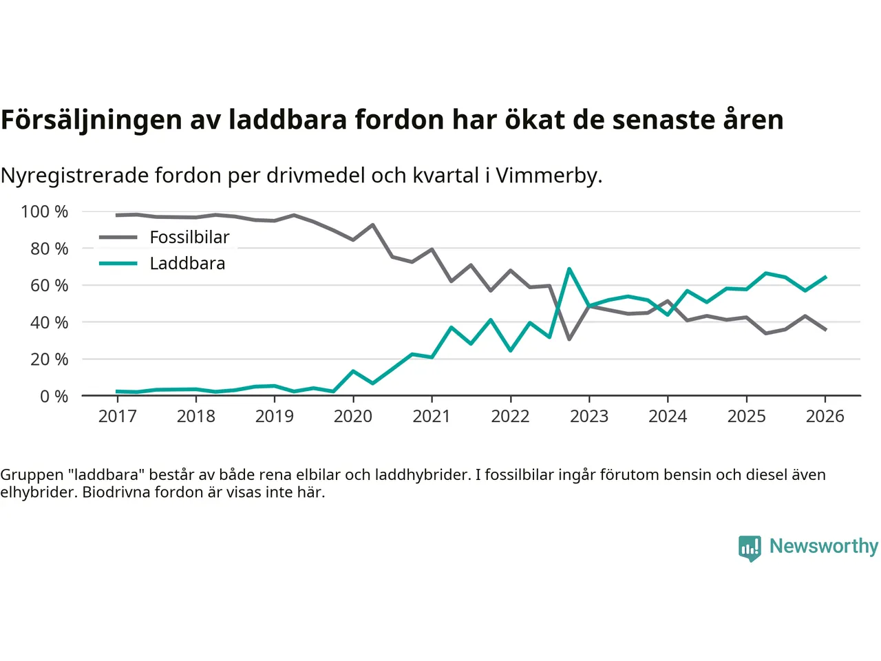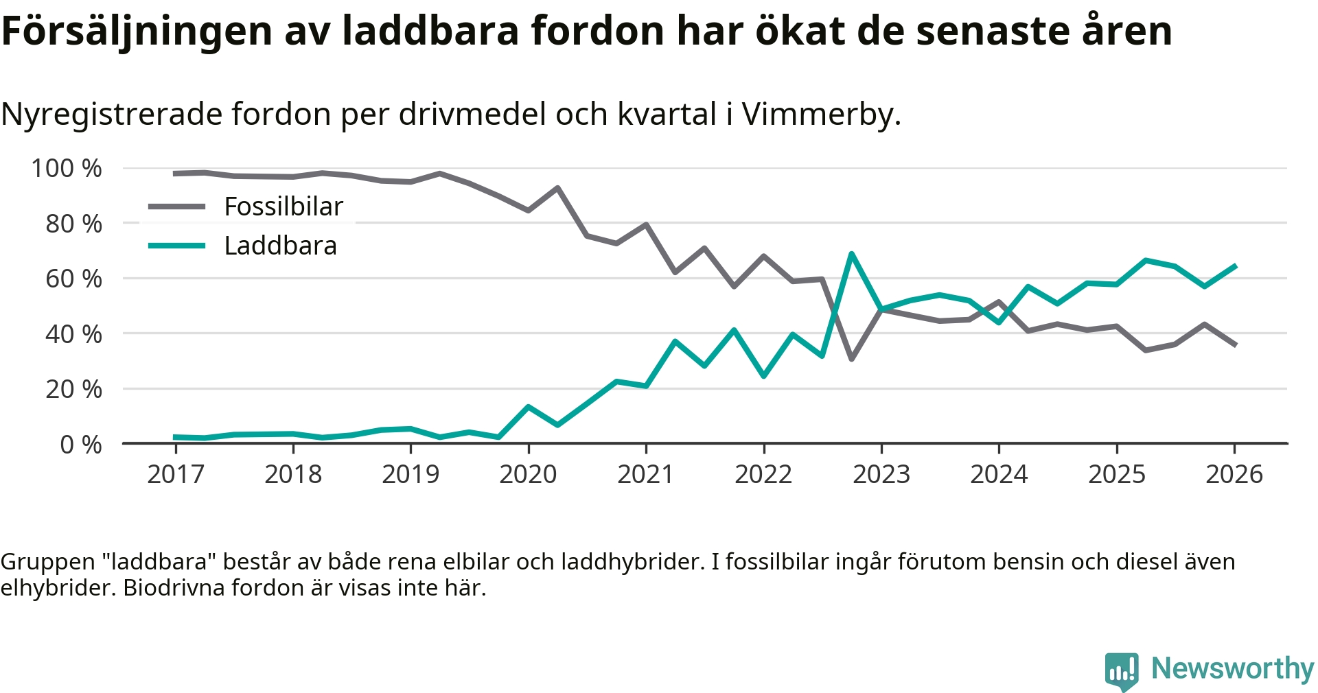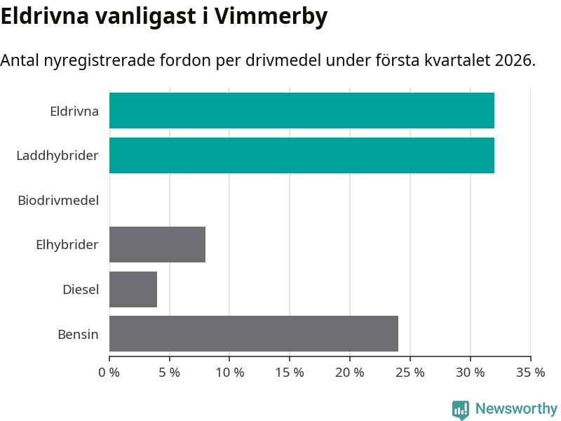 Under första kvartalet 2026 var 64 procent av alla nyregistrerade personbilar i Vimmerby laddbara (sammanlagt registrerades 75 nya bilar). Merparten av de laddbara bilarna var rena elbilar (32 procent av alla).