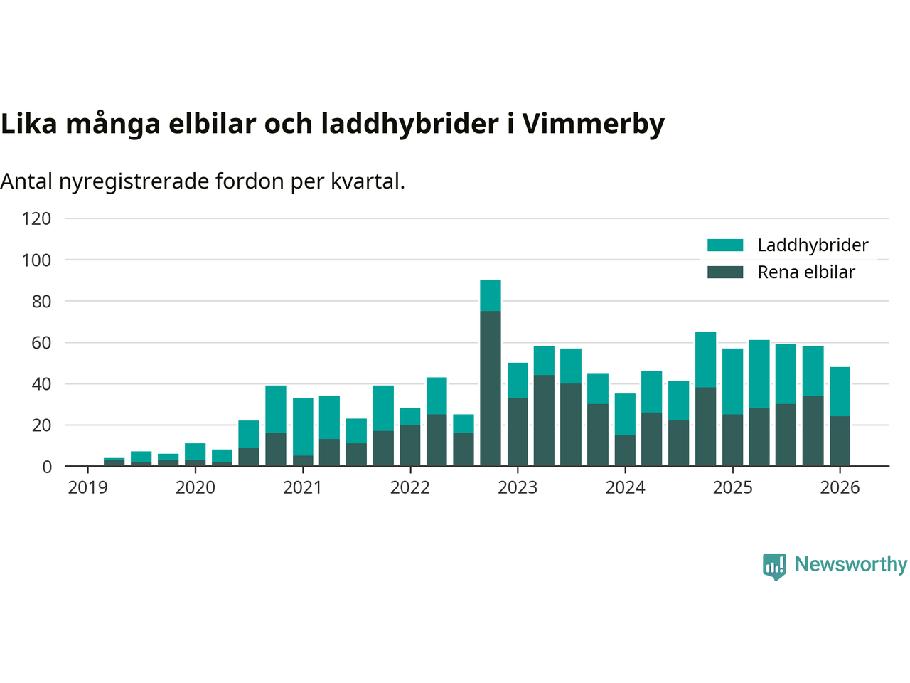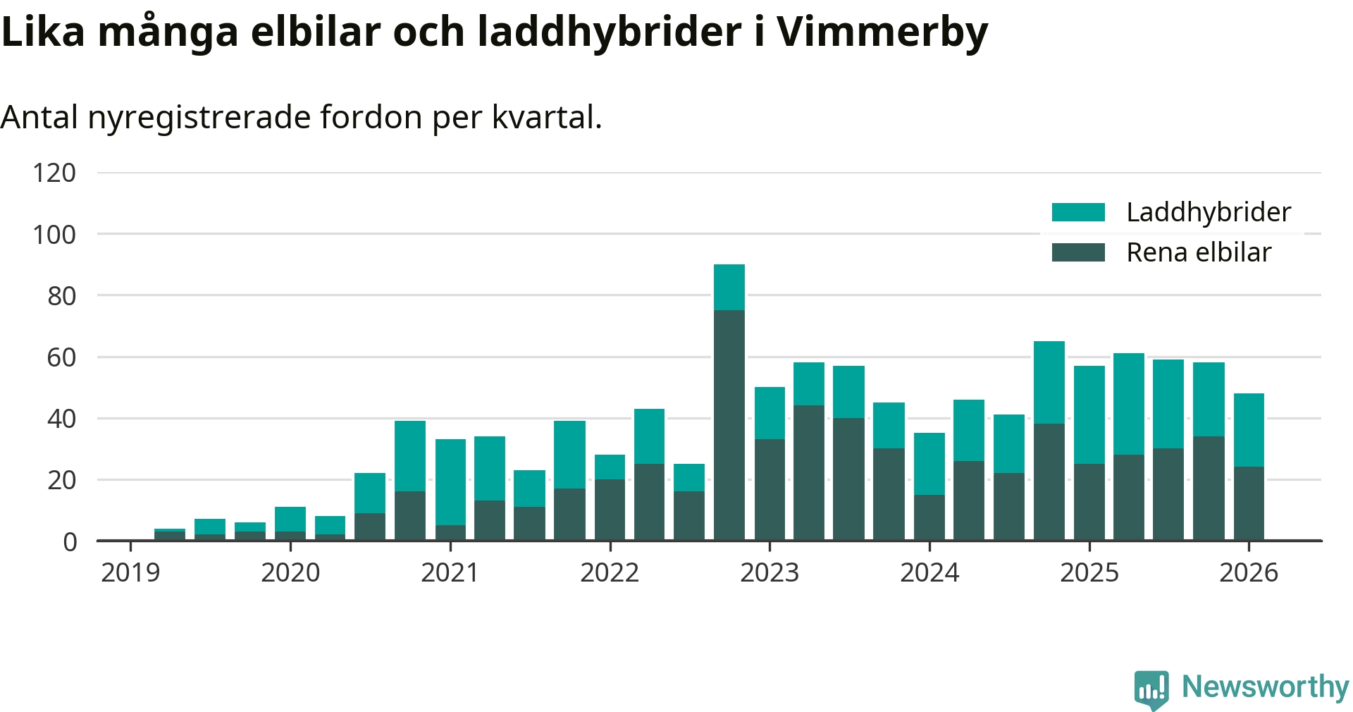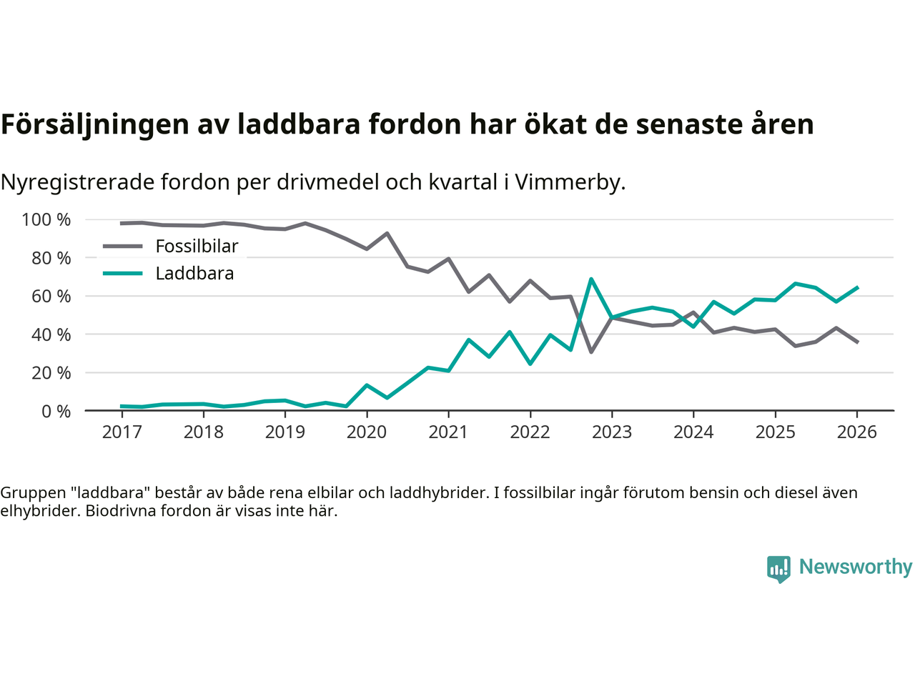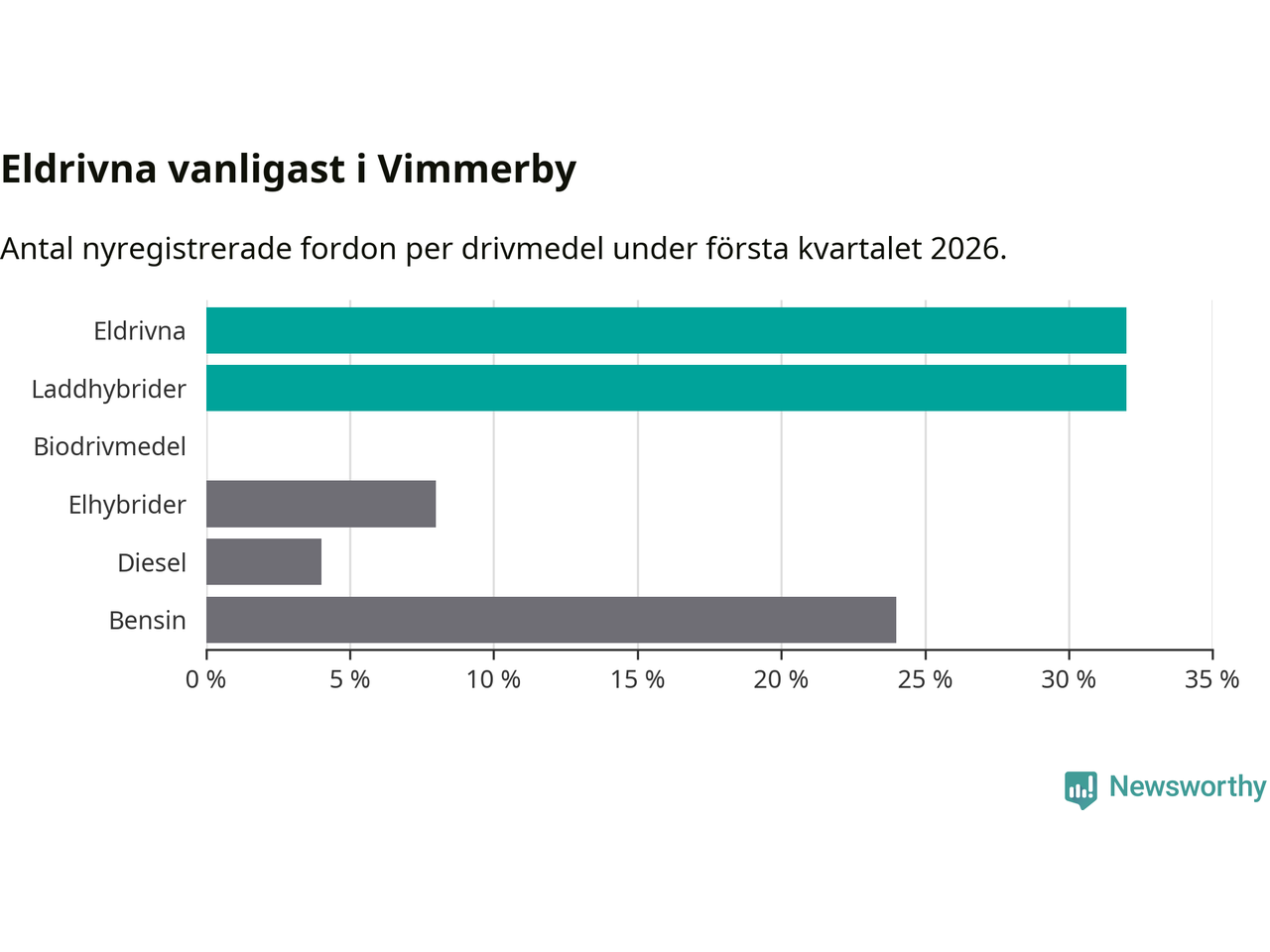 Under första kvartalet 2026 var 64 procent av alla nyregistrerade personbilar i Vimmerby laddbara (sammanlagt registrerades 75 nya bilar). Merparten av de laddbara bilarna var rena elbilar (32 procent av alla).