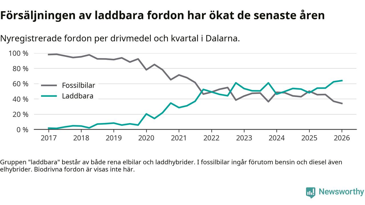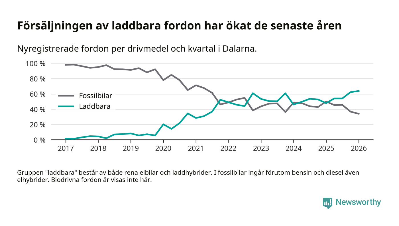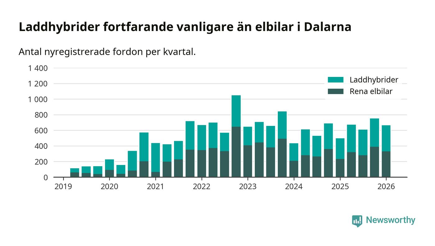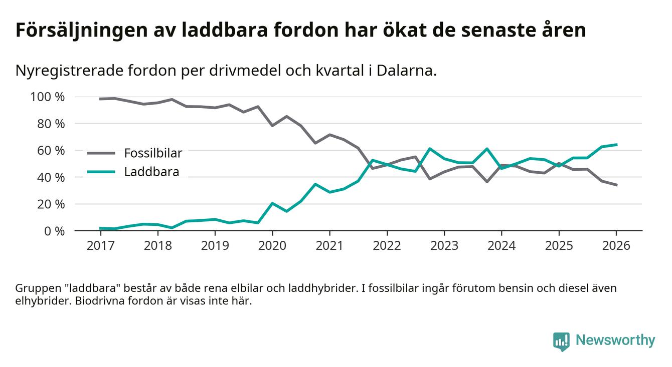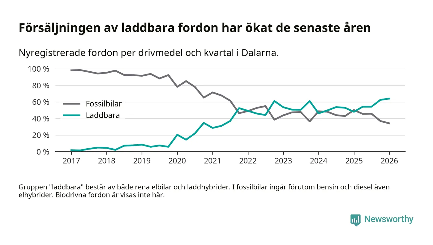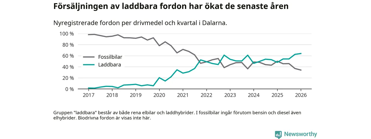 Under första kvartalet 2026 var 64 procent av alla nyregistrerade personbilar i Dalarna laddbara (sammanlagt registrerades 1 041 nya bilar). Merparten av de laddbara bilarna var så kallade laddhybrider, det vill säga fordon som går att ladda och köra på el, men som även har en förbränningsmotor. 32 procent av alla nya bilar var rena elbilar.