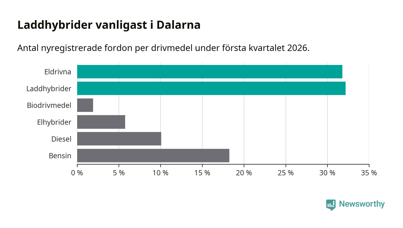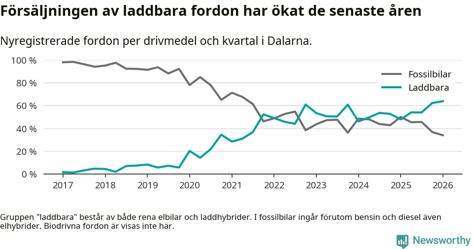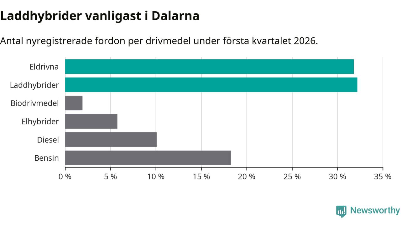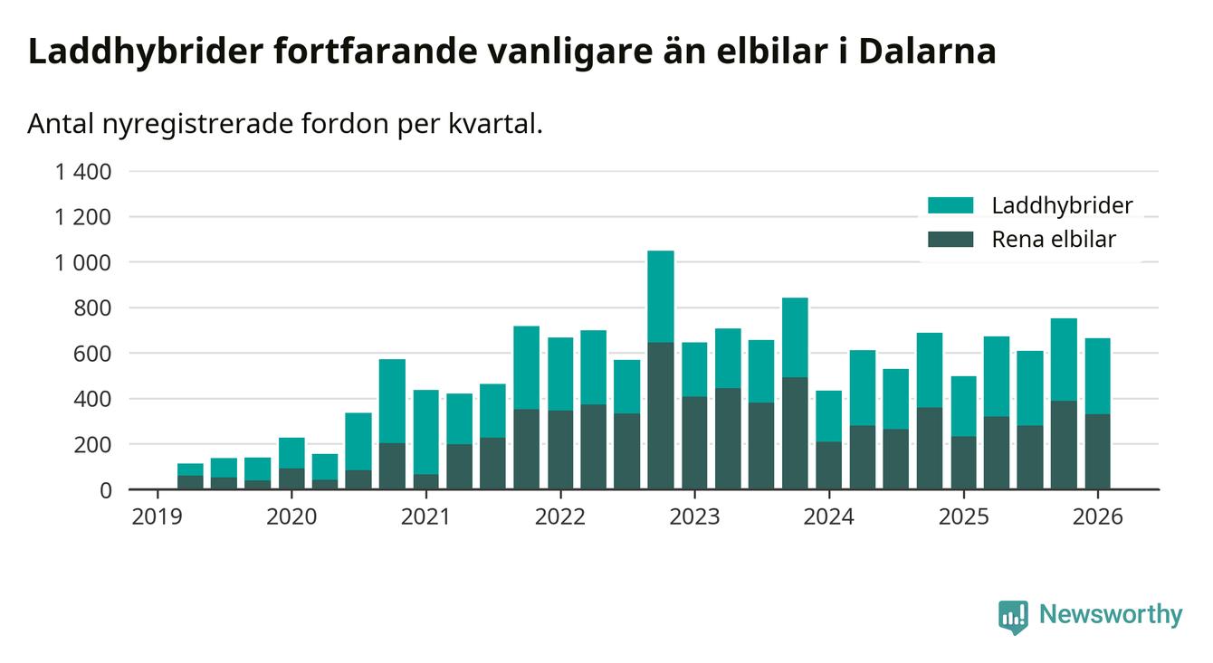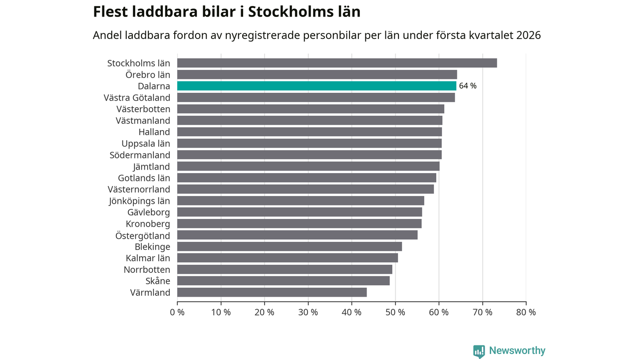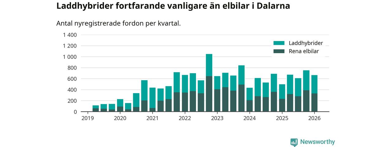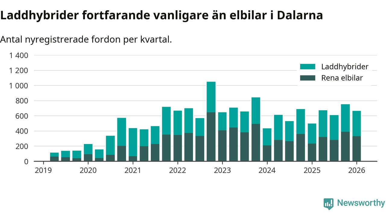 Under första kvartalet 2026 var 64 procent av alla nyregistrerade personbilar i Dalarna laddbara (sammanlagt registrerades 1 041 nya bilar). Merparten av de laddbara bilarna var så kallade laddhybrider, det vill säga fordon som går att ladda och köra på el, men som även har en förbränningsmotor. 32 procent av alla nya bilar var rena elbilar.