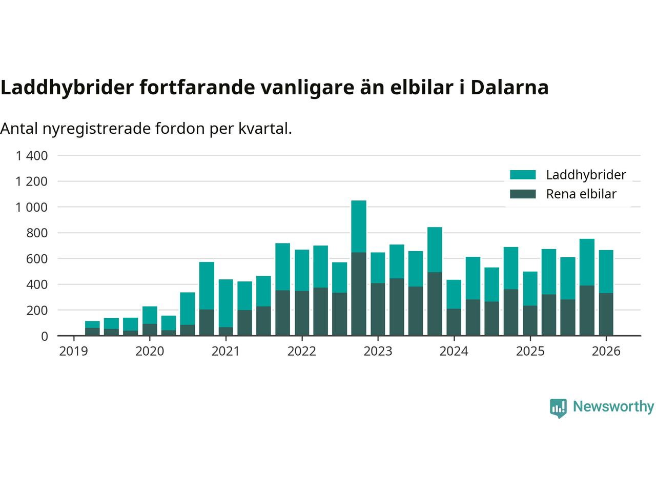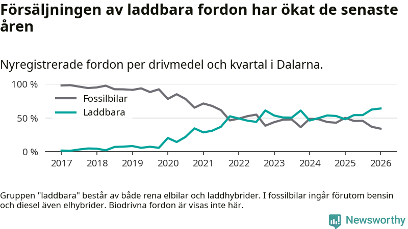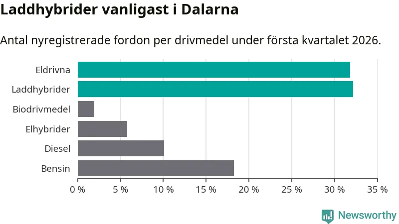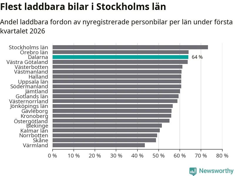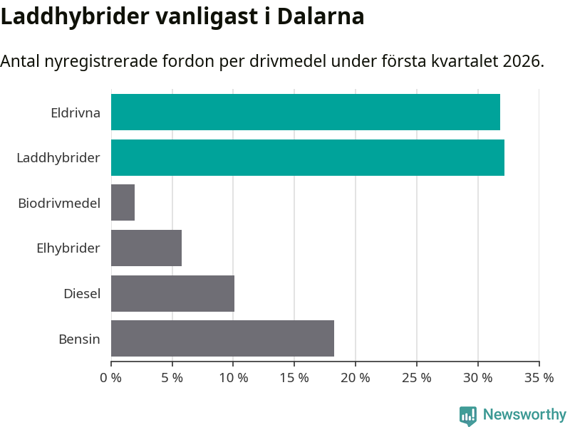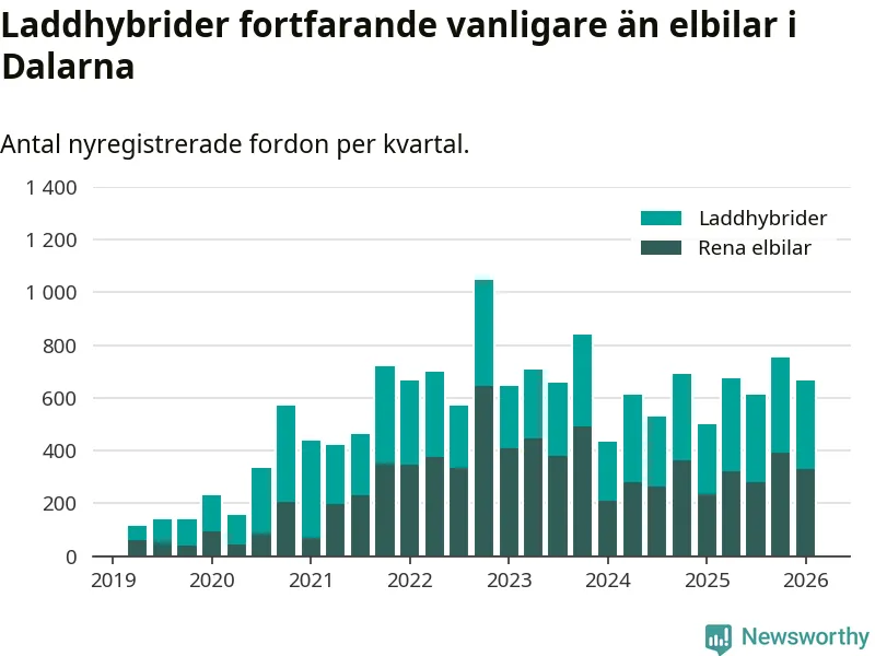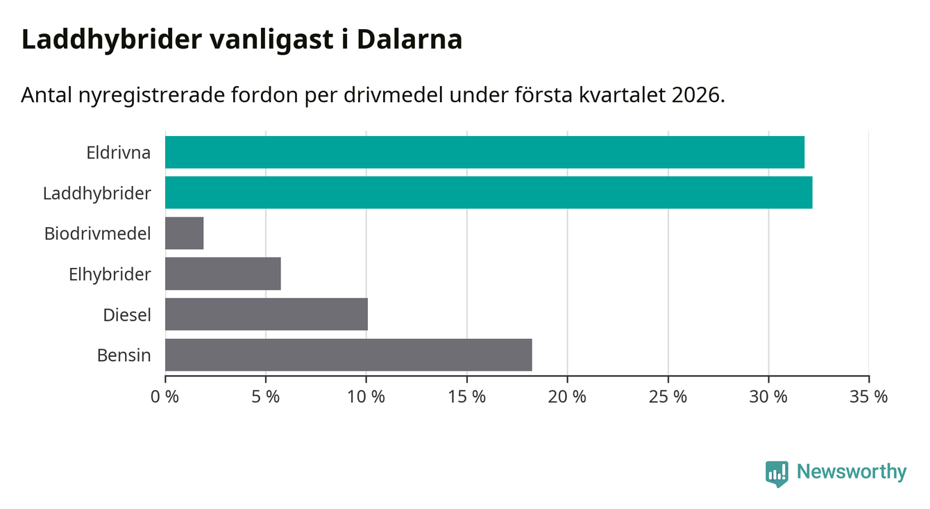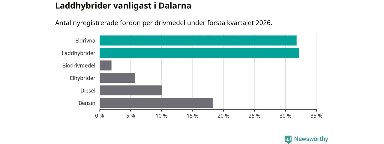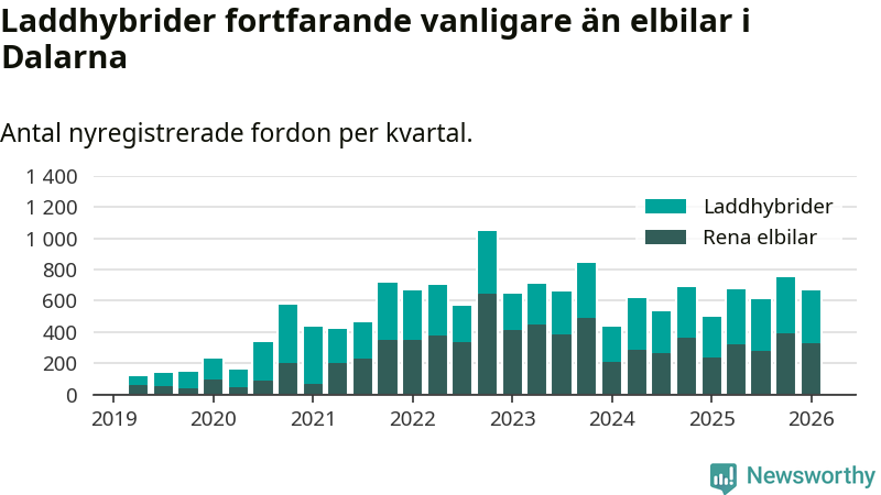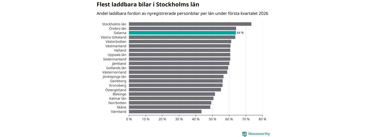 Under första kvartalet 2026 var 64 procent av alla nyregistrerade personbilar i Dalarna laddbara (sammanlagt registrerades 1 041 nya bilar). Merparten av de laddbara bilarna var så kallade laddhybrider, det vill säga fordon som går att ladda och köra på el, men som även har en förbränningsmotor. 32 procent av alla nya bilar var rena elbilar.