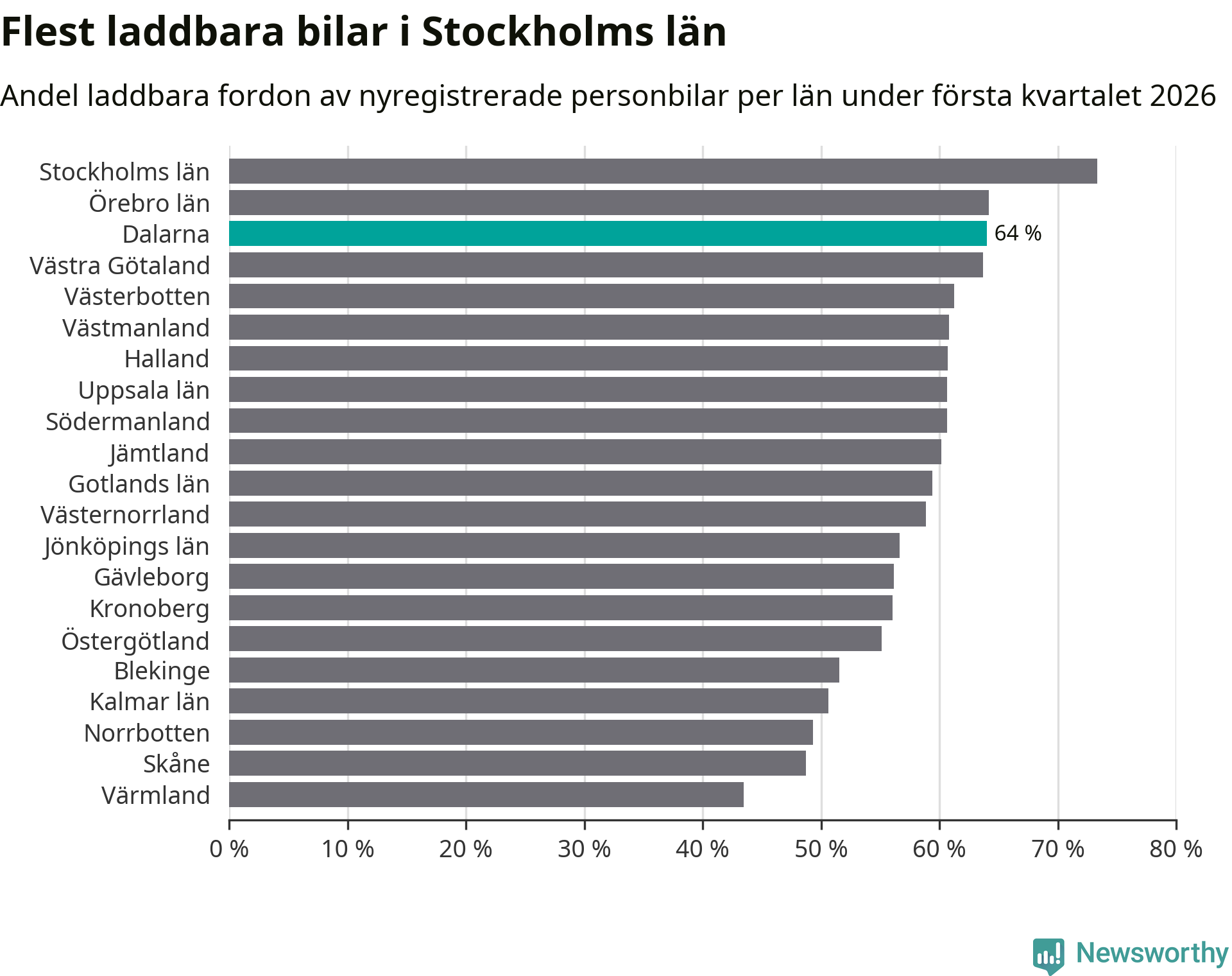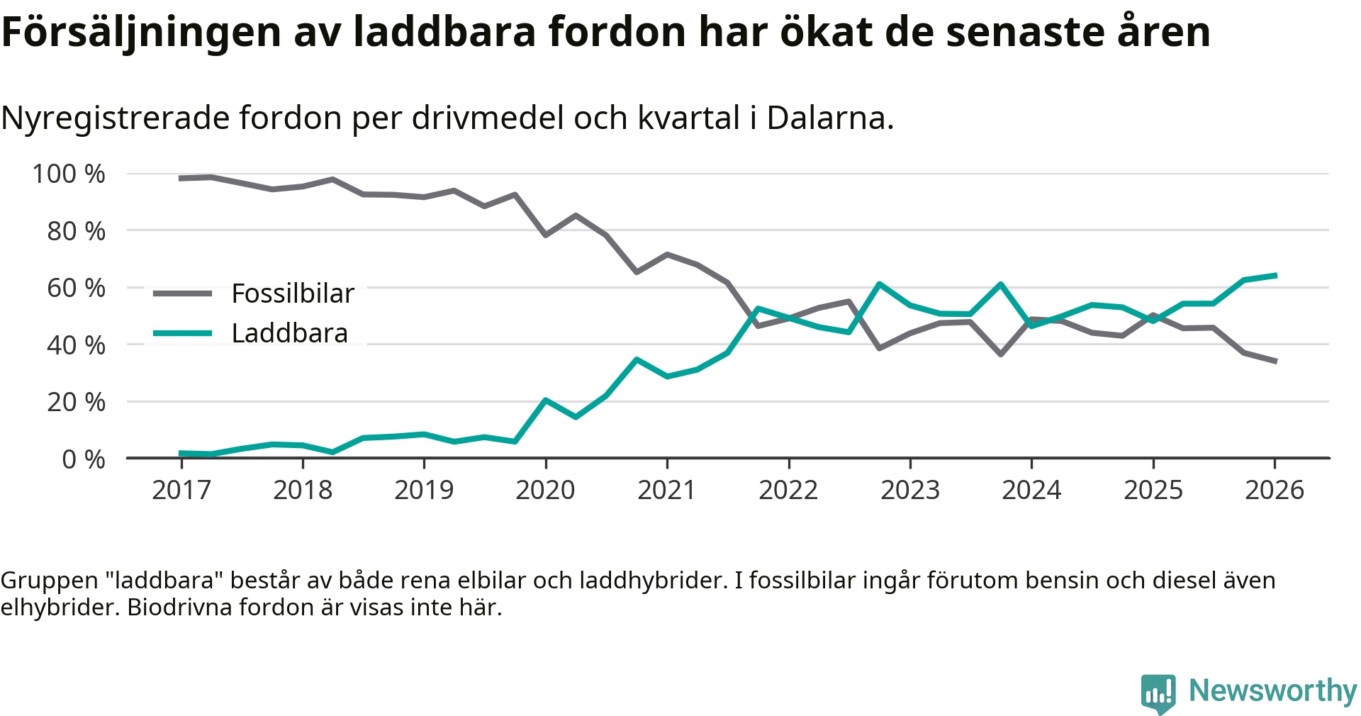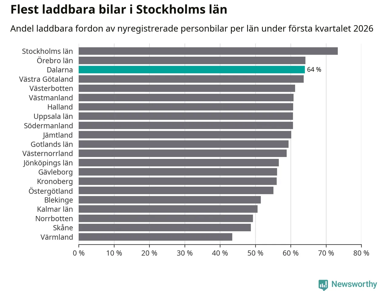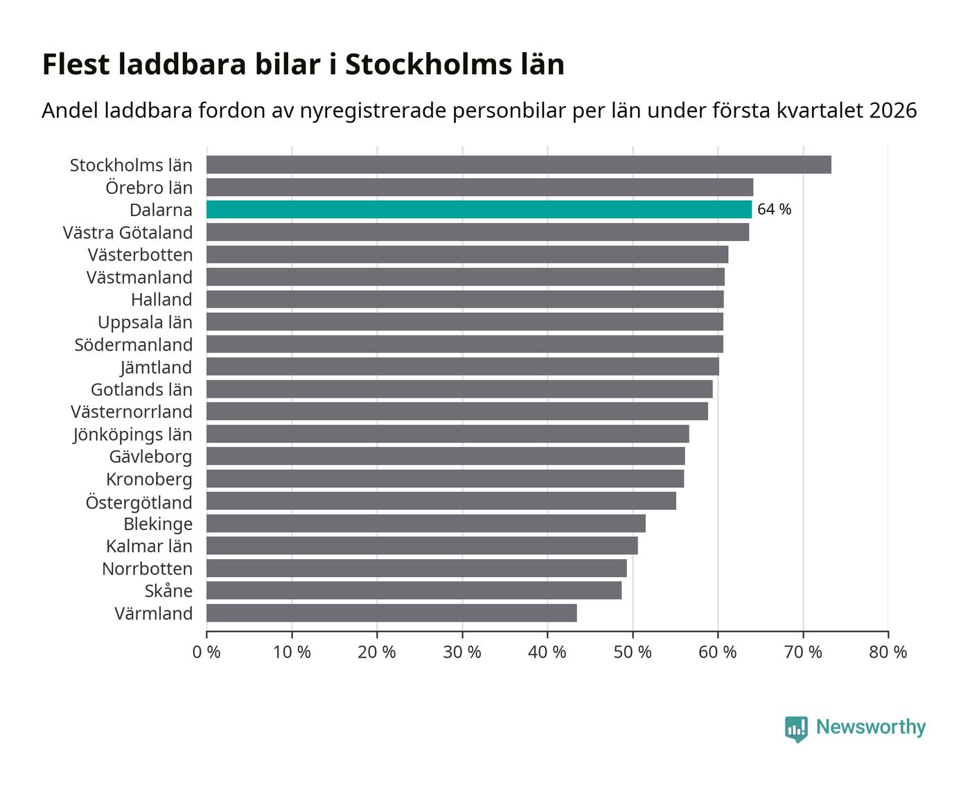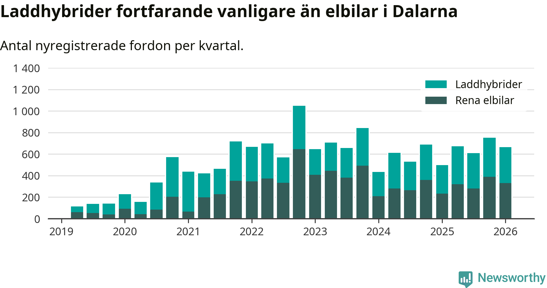 Under första kvartalet 2026 var 64 procent av alla nyregistrerade personbilar i Dalarna laddbara (sammanlagt registrerades 1 041 nya bilar). Merparten av de laddbara bilarna var så kallade laddhybrider, det vill säga fordon som går att ladda och köra på el, men som även har en förbränningsmotor. 32 procent av alla nya bilar var rena elbilar.