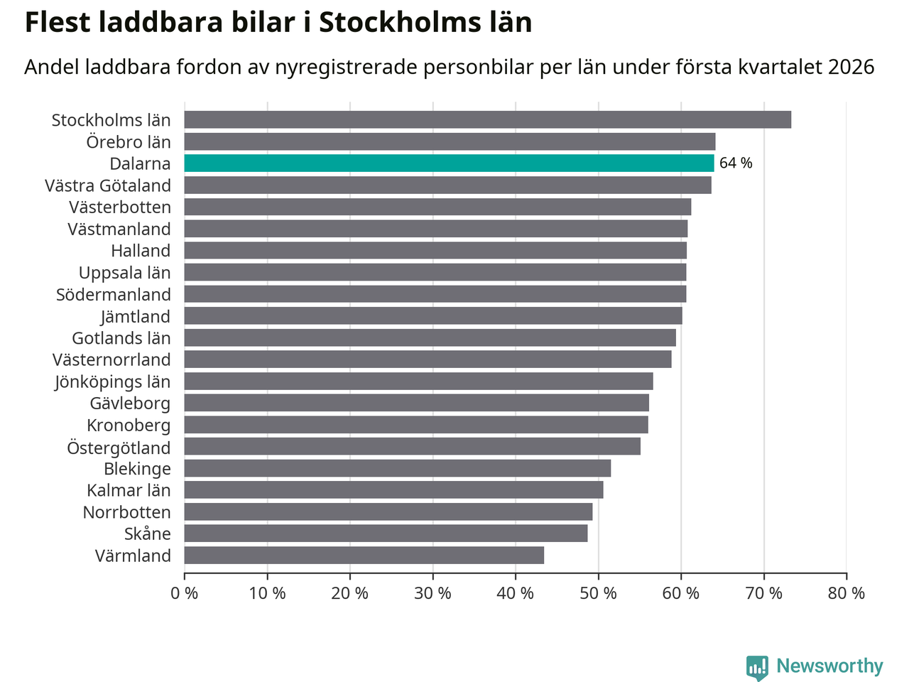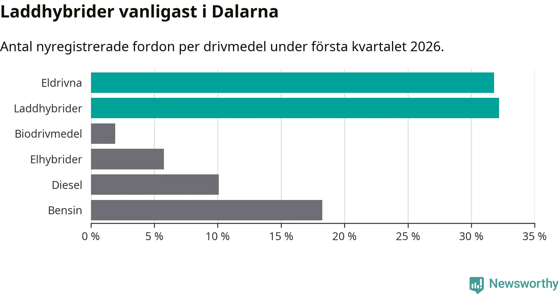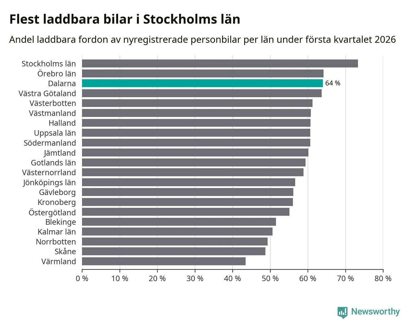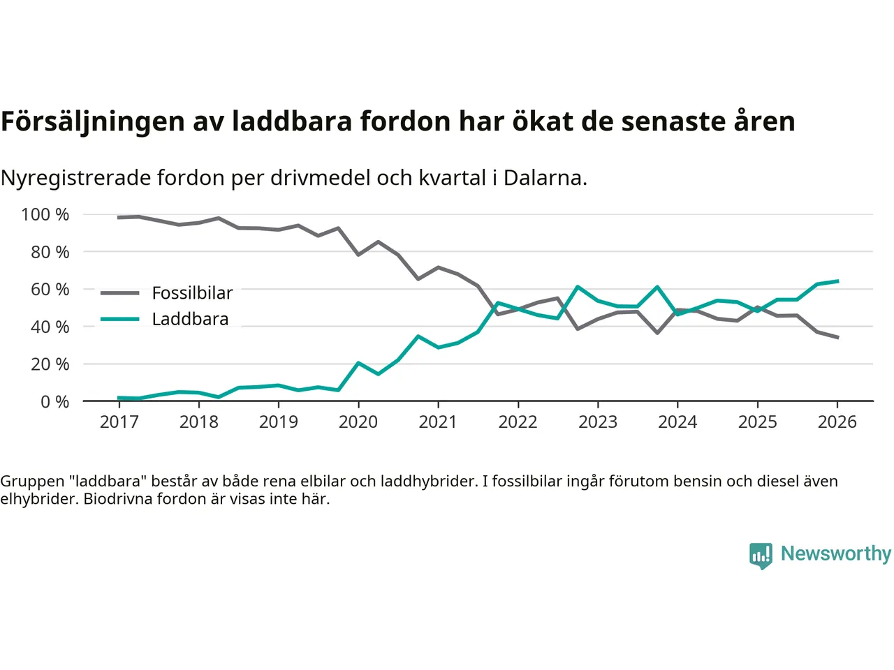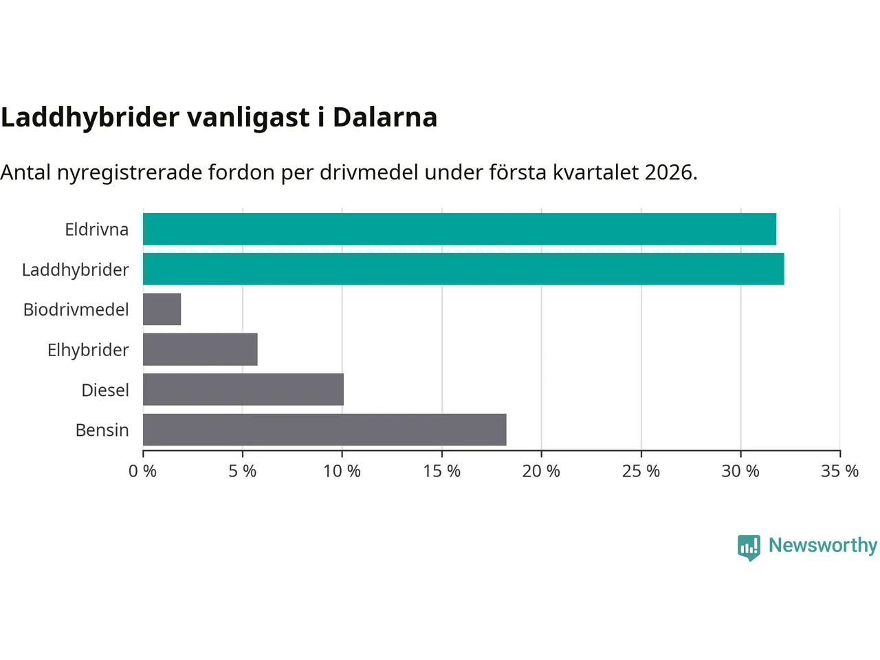 Under första kvartalet 2026 var 64 procent av alla nyregistrerade personbilar i Dalarna laddbara (sammanlagt registrerades 1 041 nya bilar). Merparten av de laddbara bilarna var så kallade laddhybrider, det vill säga fordon som går att ladda och köra på el, men som även har en förbränningsmotor. 32 procent av alla nya bilar var rena elbilar.