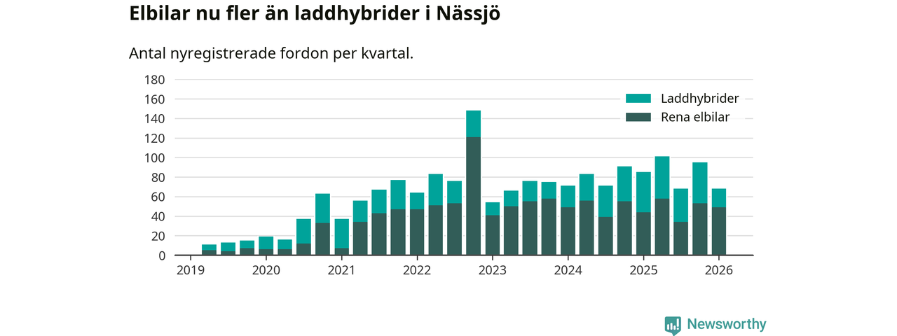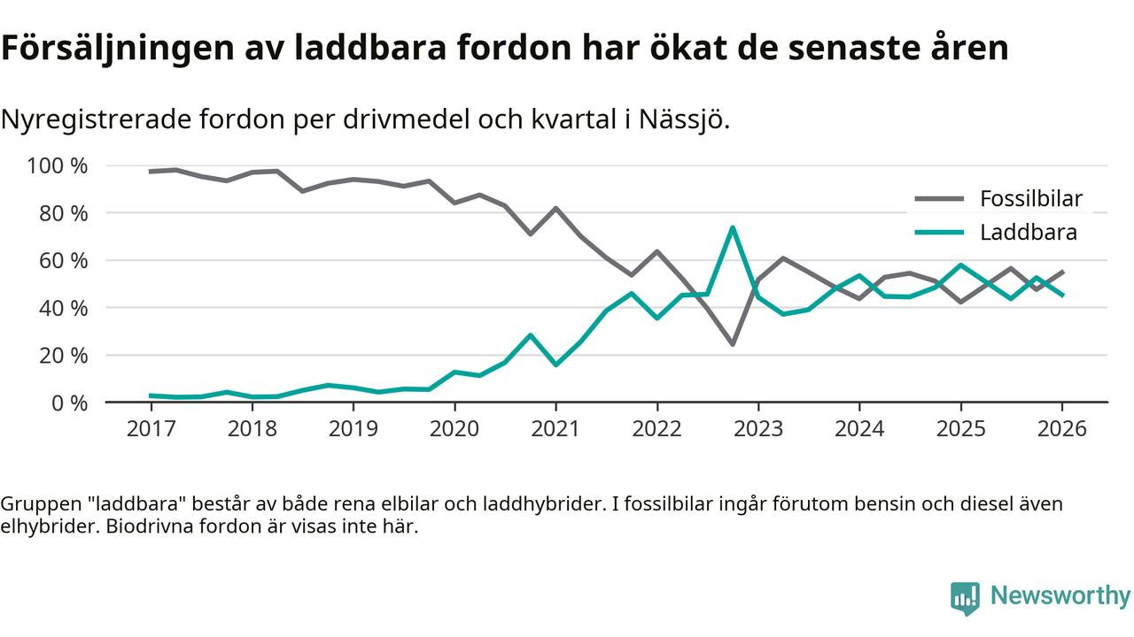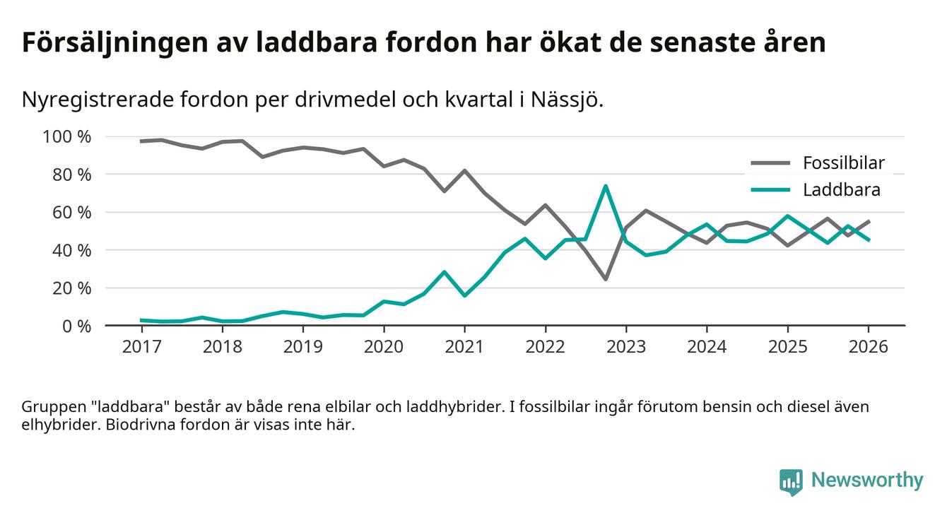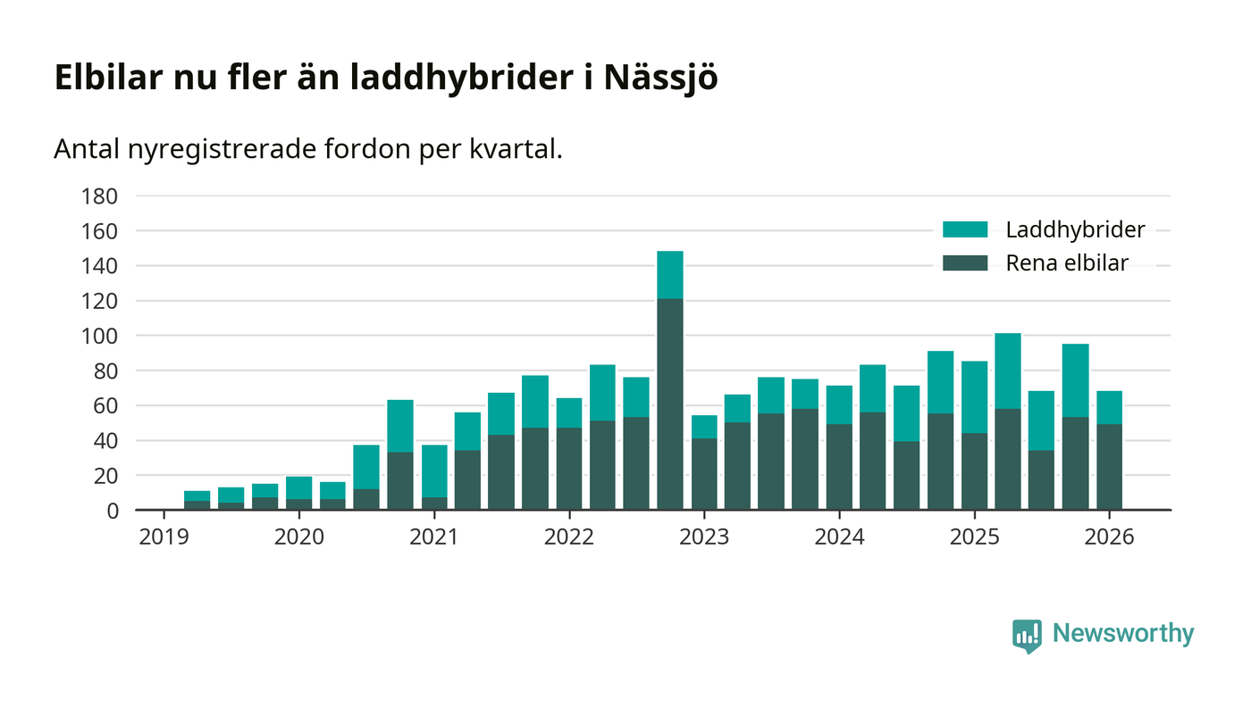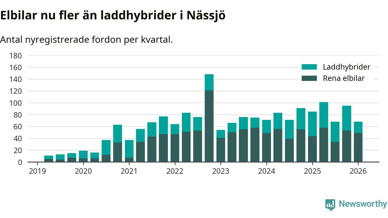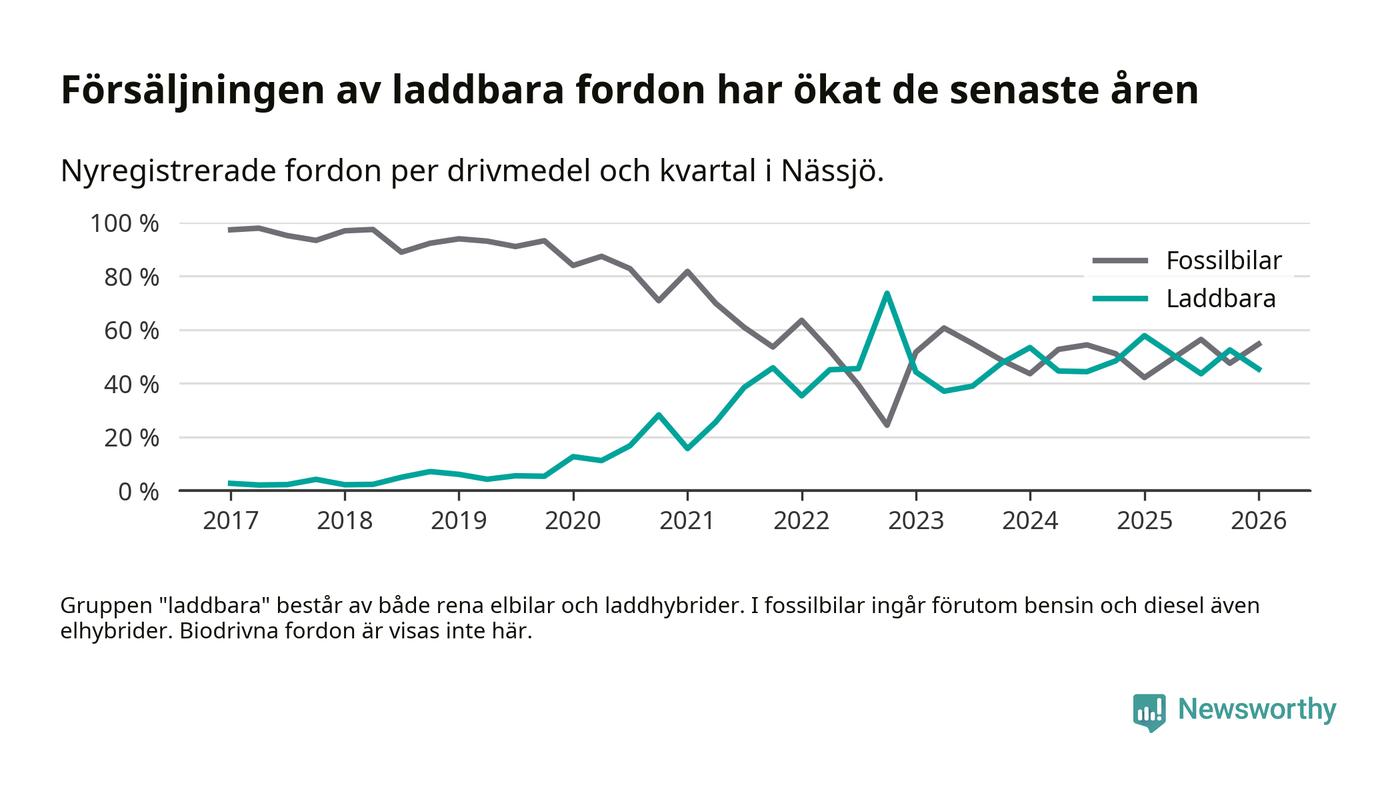 Under första kvartalet 2026 var 45 procent av alla nyregistrerade personbilar i Nässjö laddbara (sammanlagt registrerades 150 nya bilar). Merparten av de laddbara bilarna var rena elbilar (33 procent av alla).