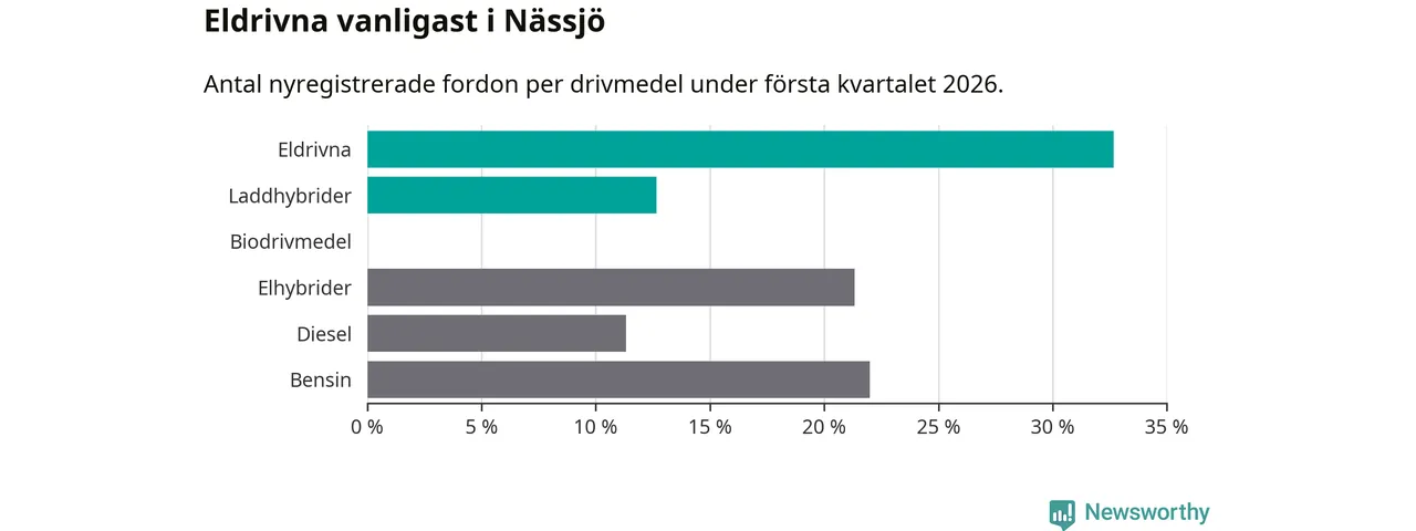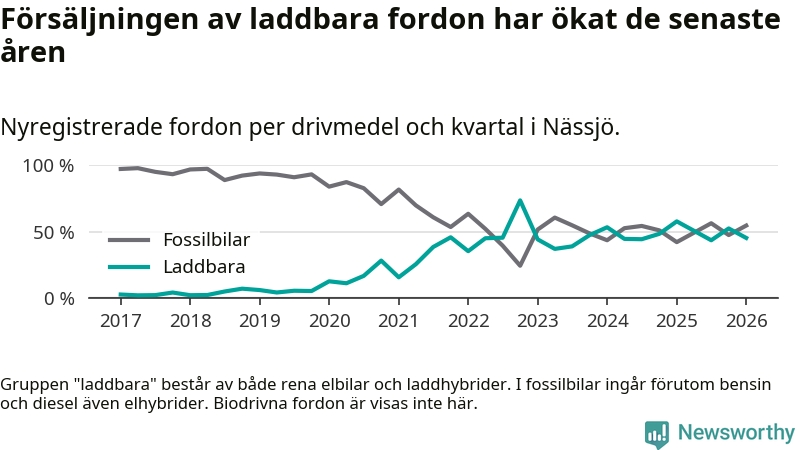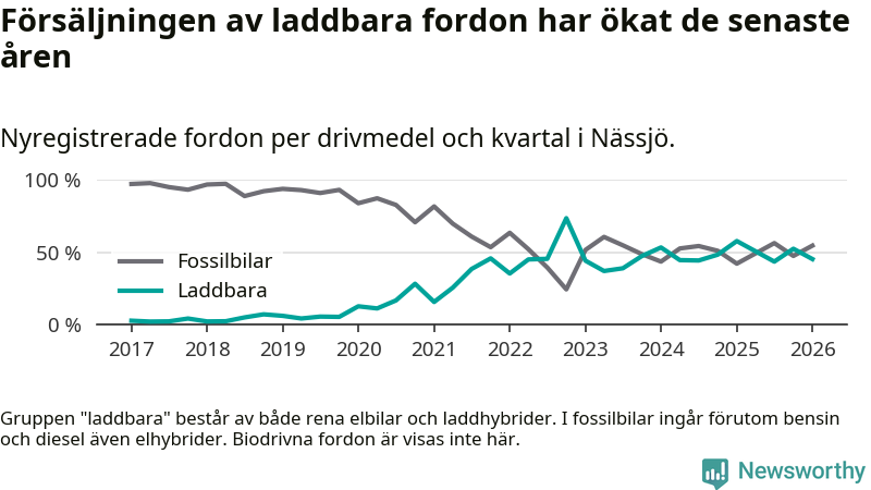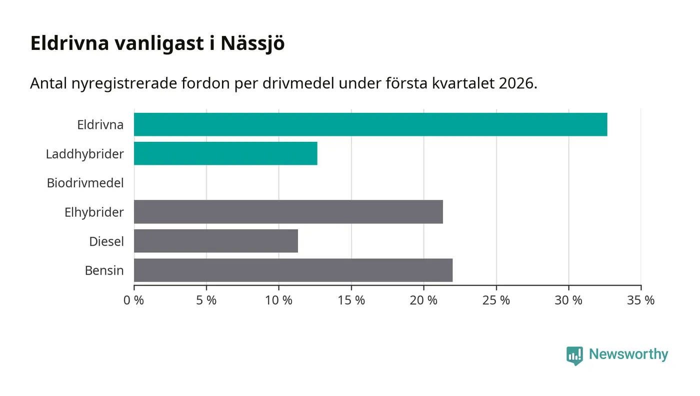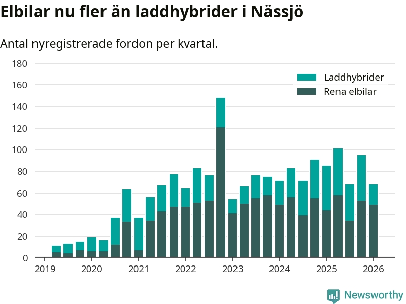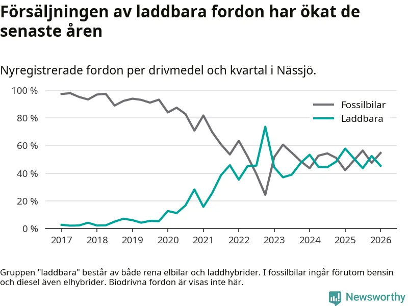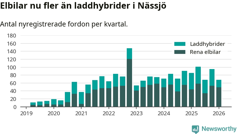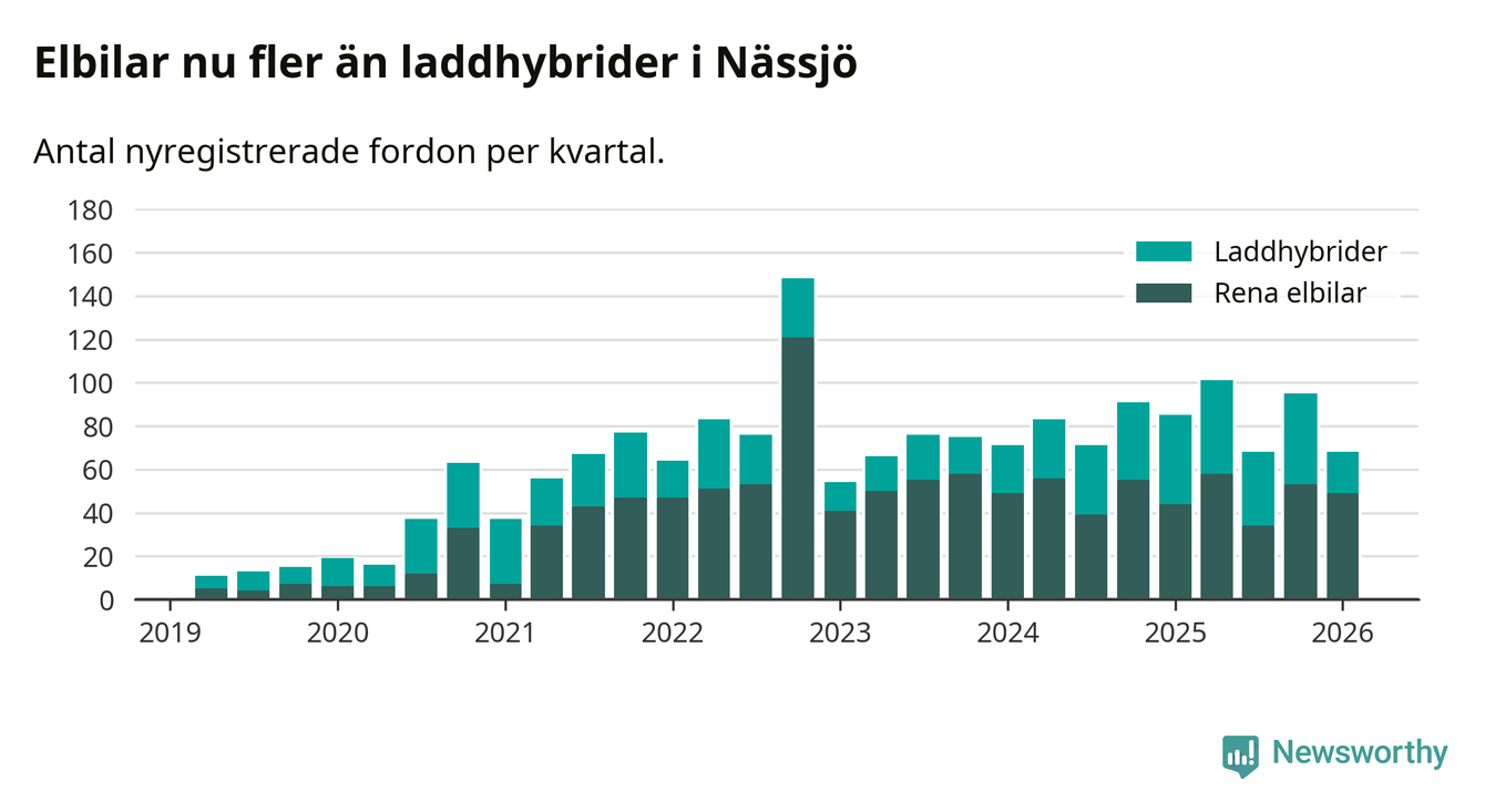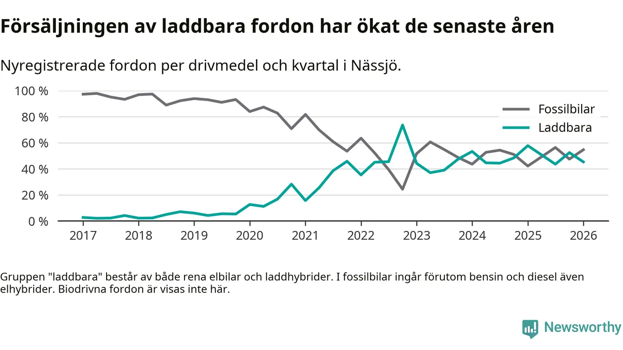 Under första kvartalet 2026 var 45 procent av alla nyregistrerade personbilar i Nässjö laddbara (sammanlagt registrerades 150 nya bilar). Merparten av de laddbara bilarna var rena elbilar (33 procent av alla).