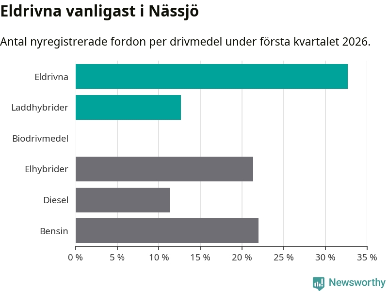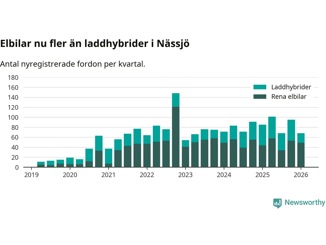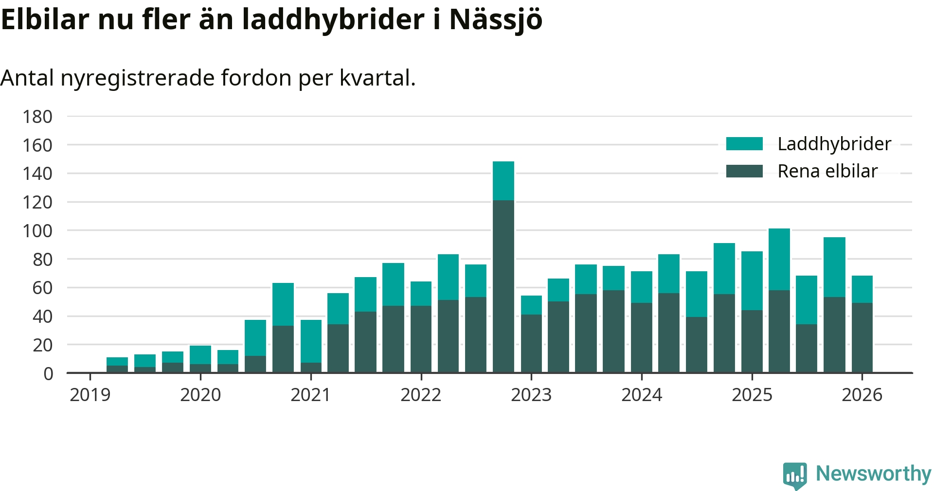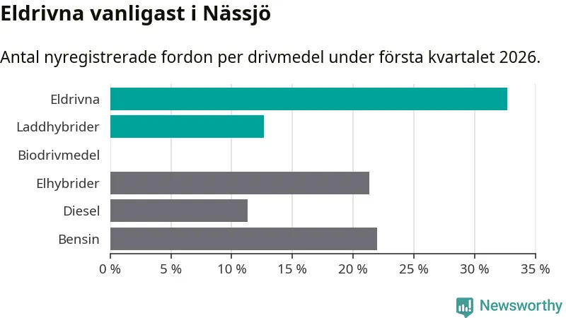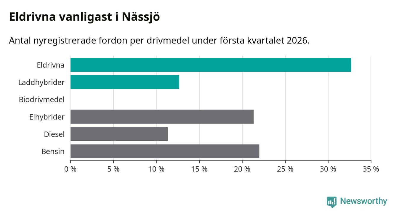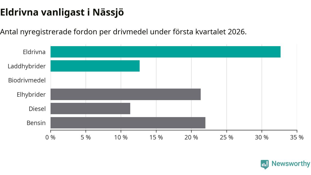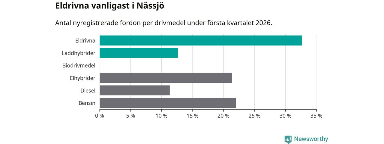 Under första kvartalet 2026 var 45 procent av alla nyregistrerade personbilar i Nässjö laddbara (sammanlagt registrerades 150 nya bilar). Merparten av de laddbara bilarna var rena elbilar (33 procent av alla).