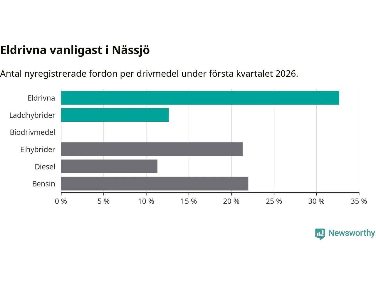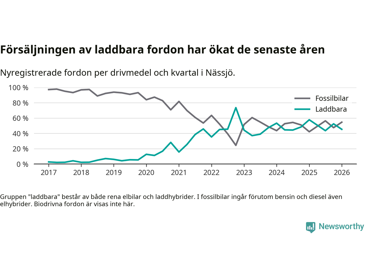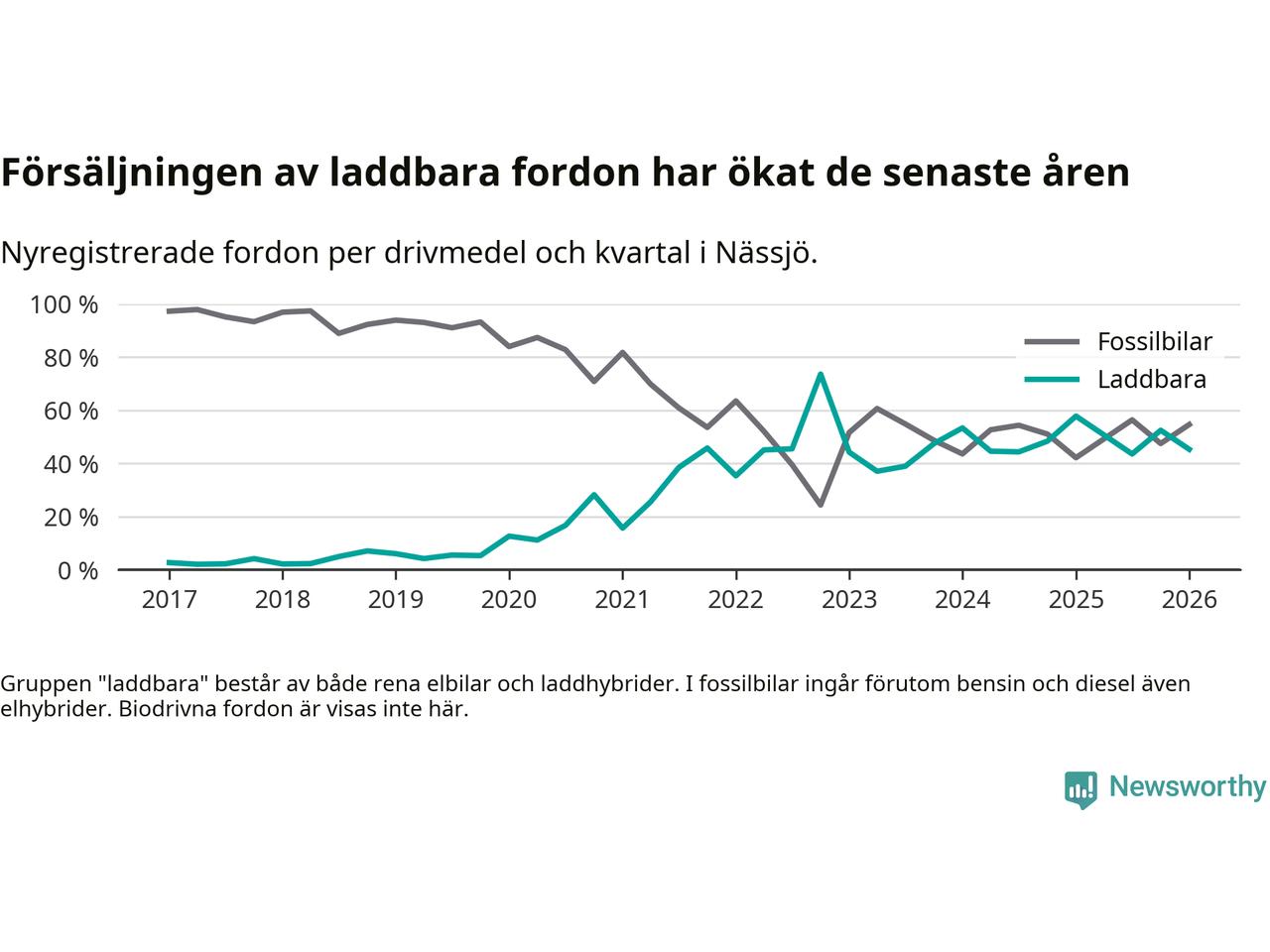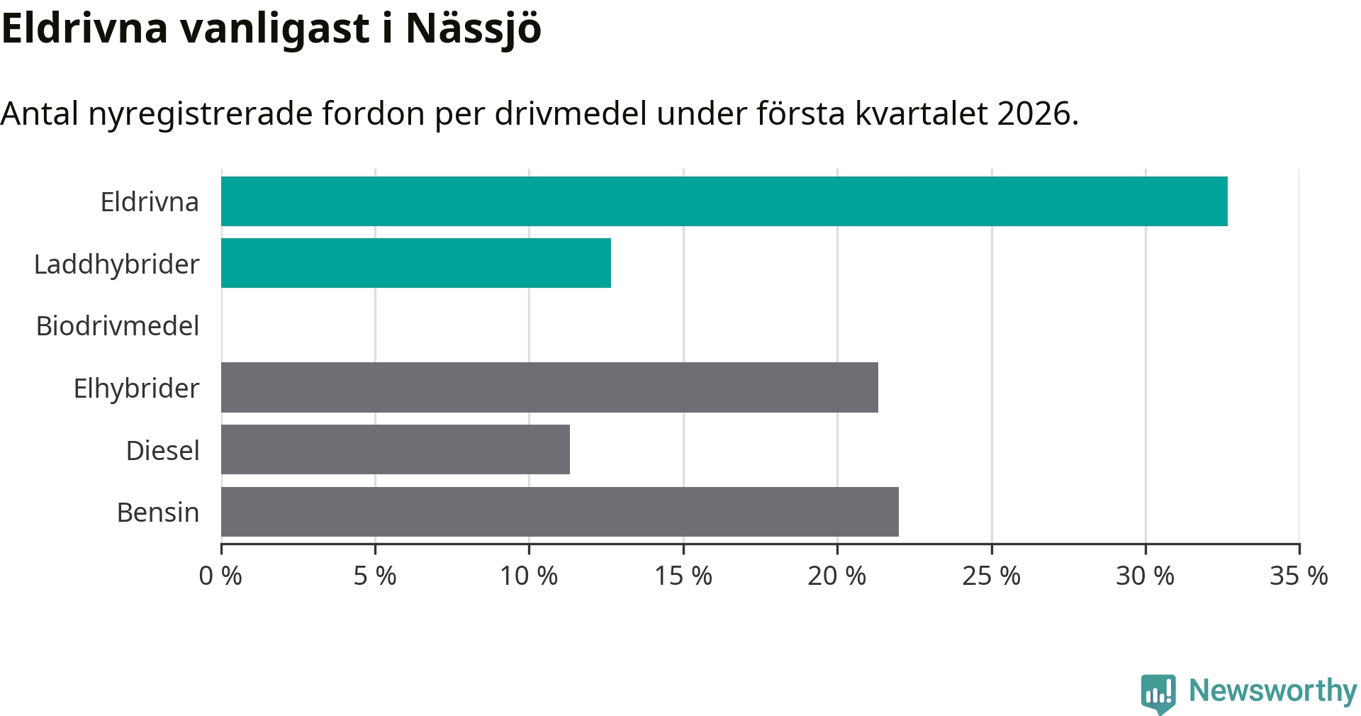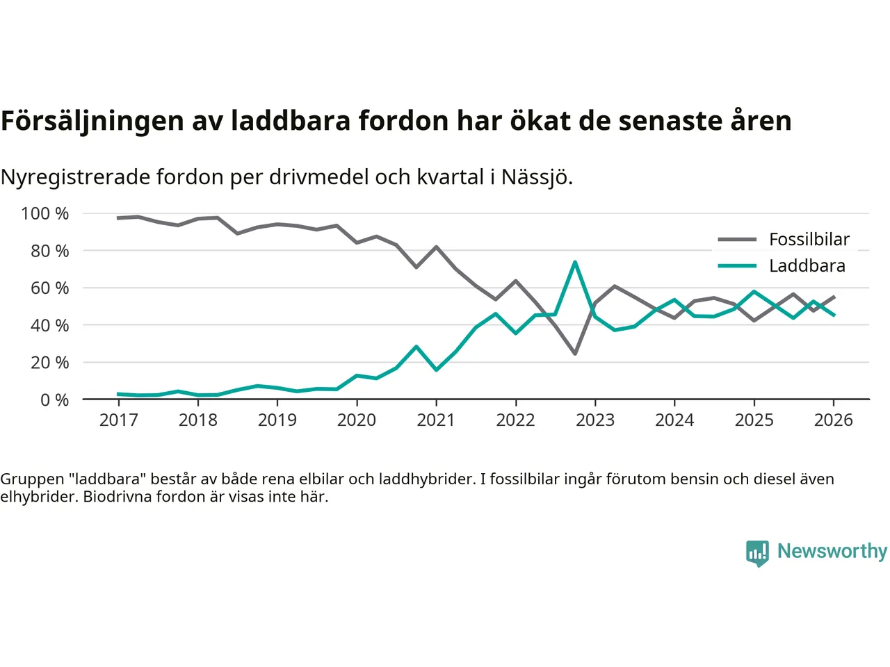 Under första kvartalet 2026 var 45 procent av alla nyregistrerade personbilar i Nässjö laddbara (sammanlagt registrerades 150 nya bilar). Merparten av de laddbara bilarna var rena elbilar (33 procent av alla).