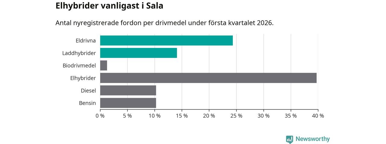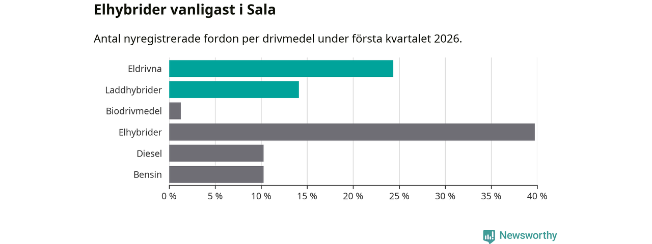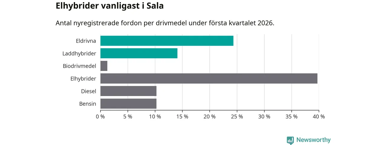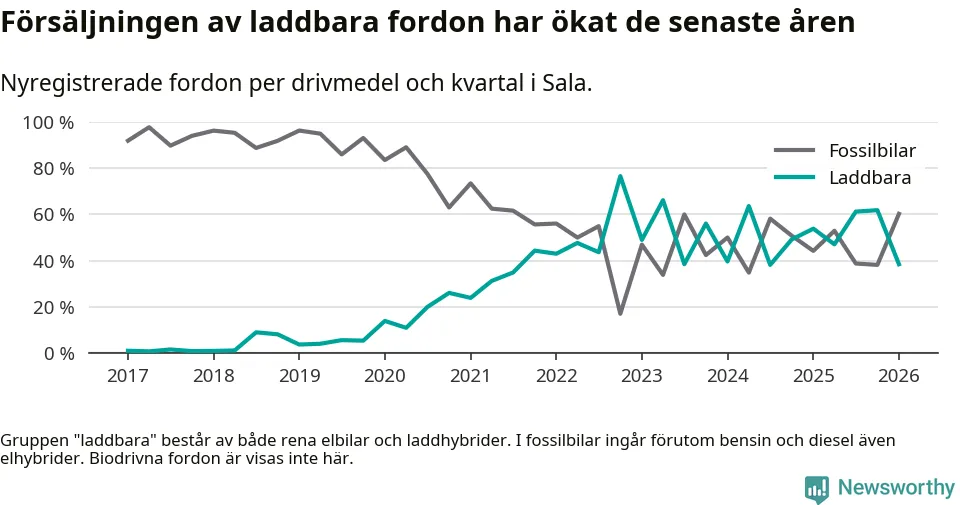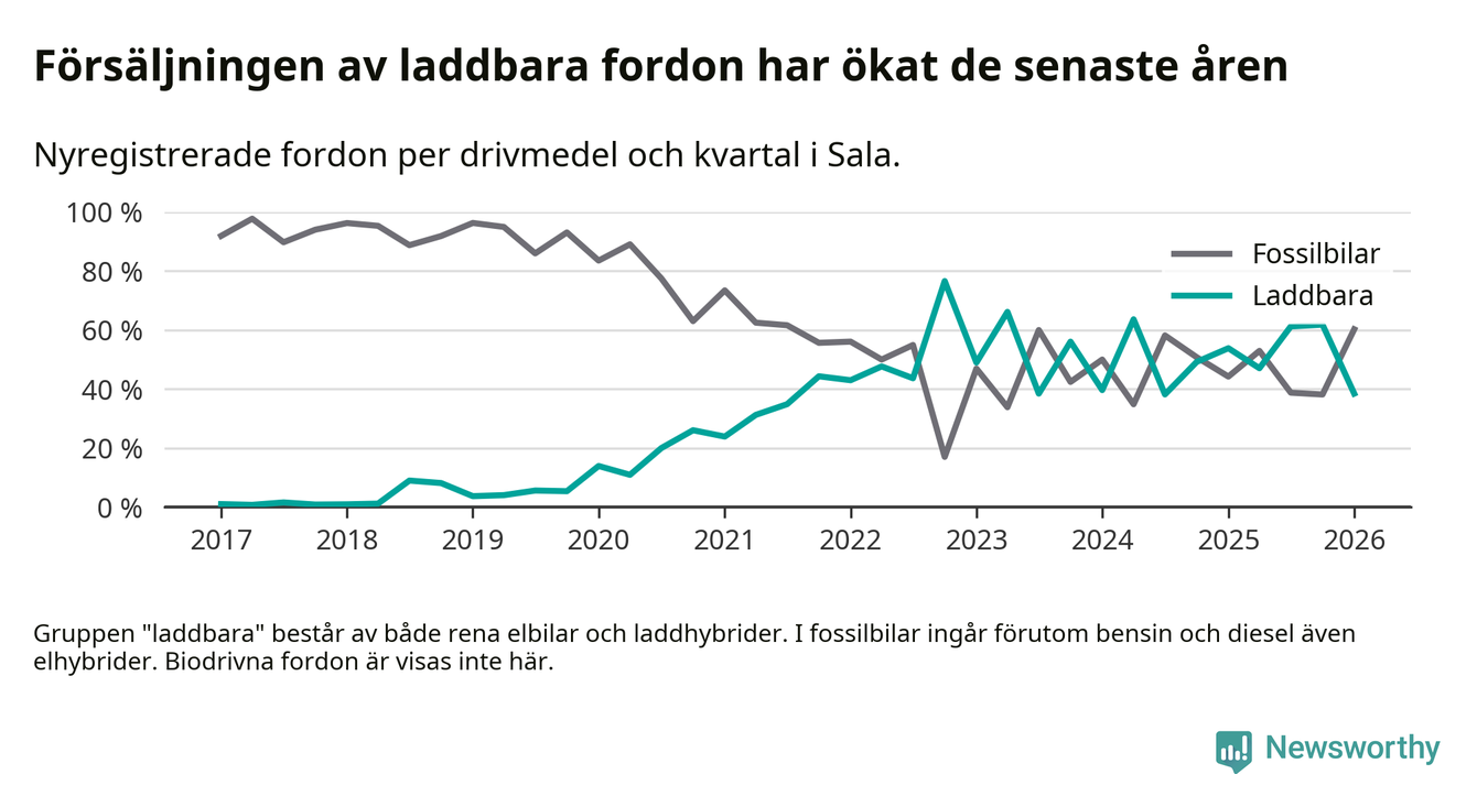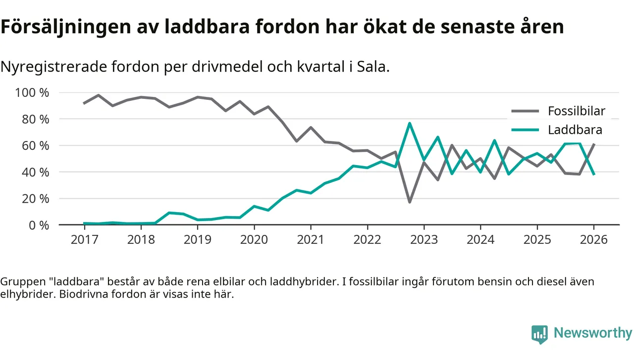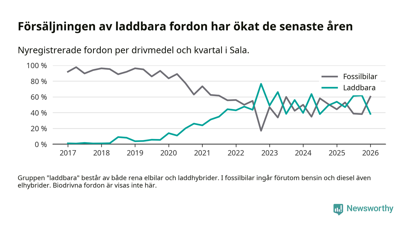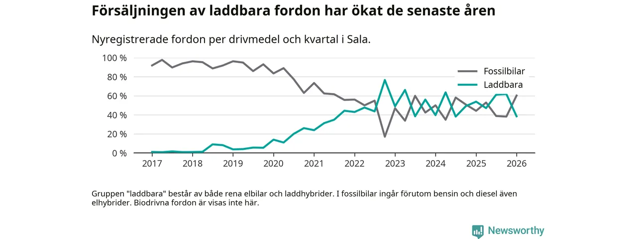 Under första kvartalet 2026 var 38 procent av alla nyregistrerade personbilar i Sala laddbara (sammanlagt registrerades 78 nya bilar). Merparten av de laddbara bilarna var rena elbilar (24 procent av alla).