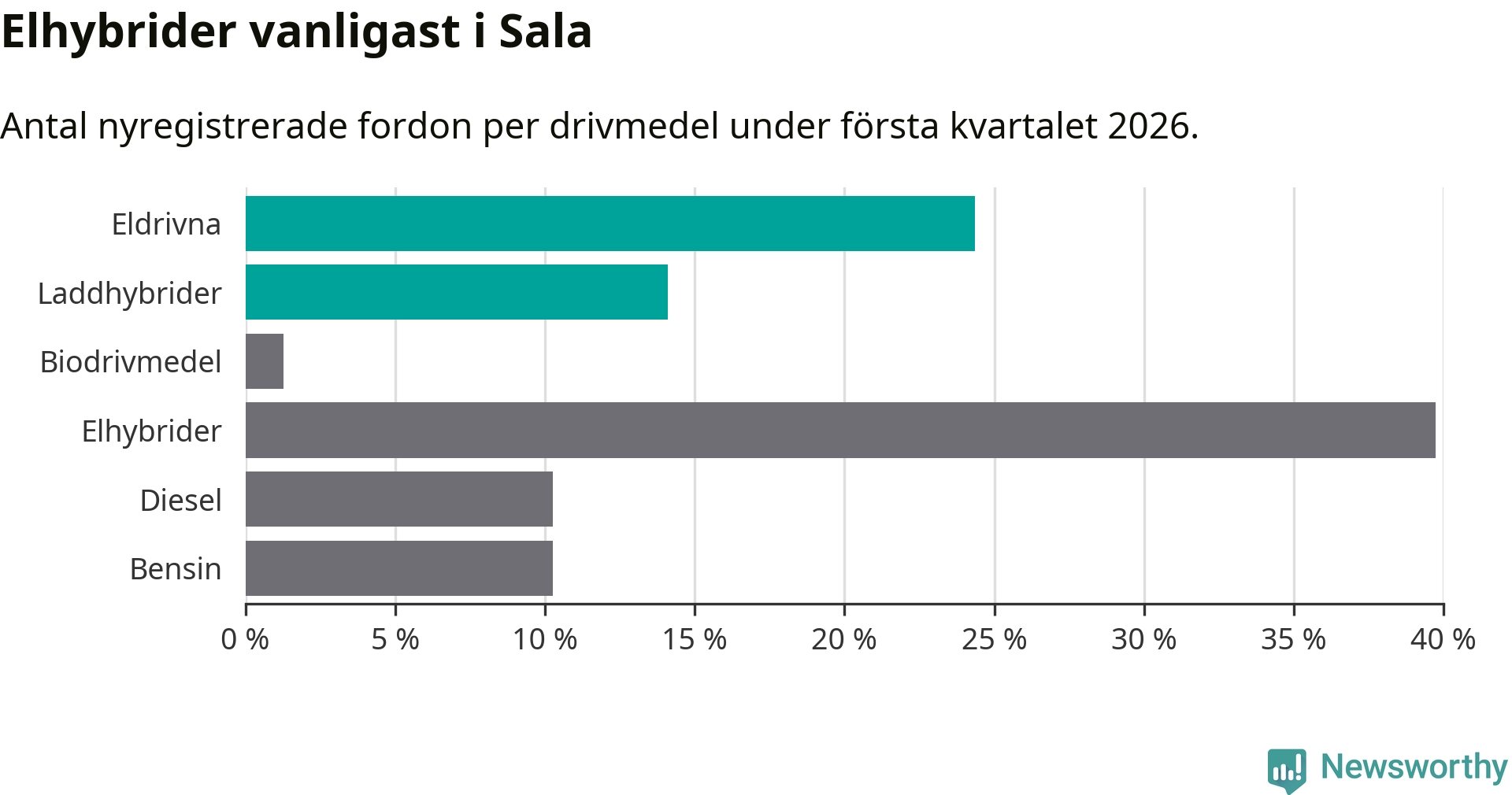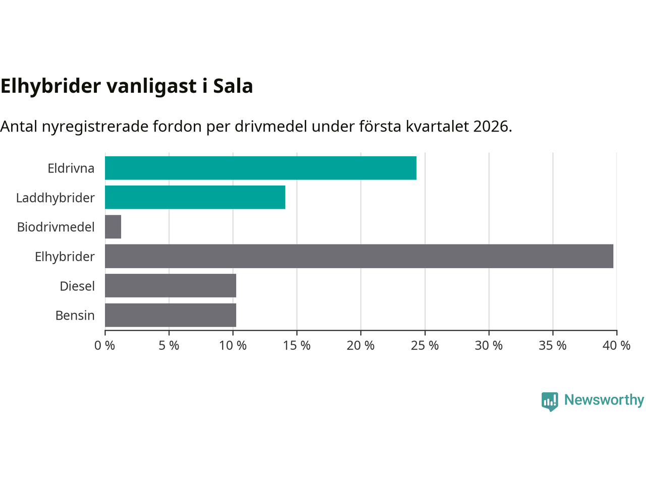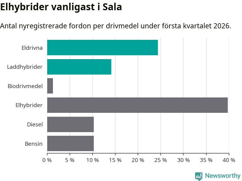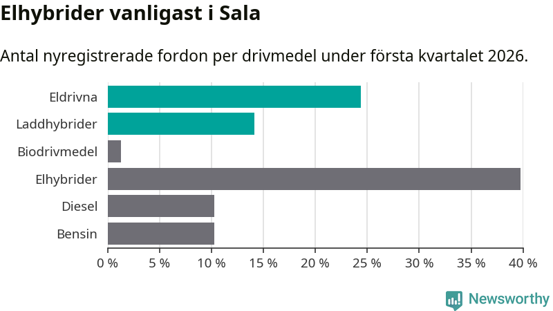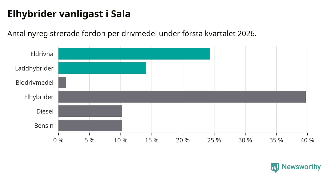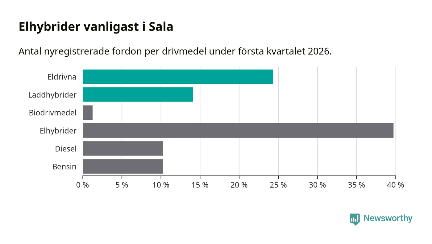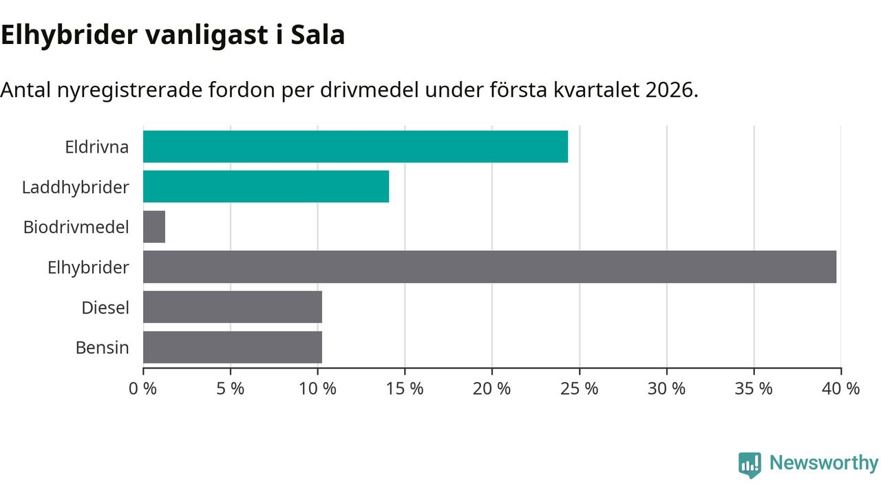 Under första kvartalet 2026 var 38 procent av alla nyregistrerade personbilar i Sala laddbara (sammanlagt registrerades 78 nya bilar). Merparten av de laddbara bilarna var rena elbilar (24 procent av alla).