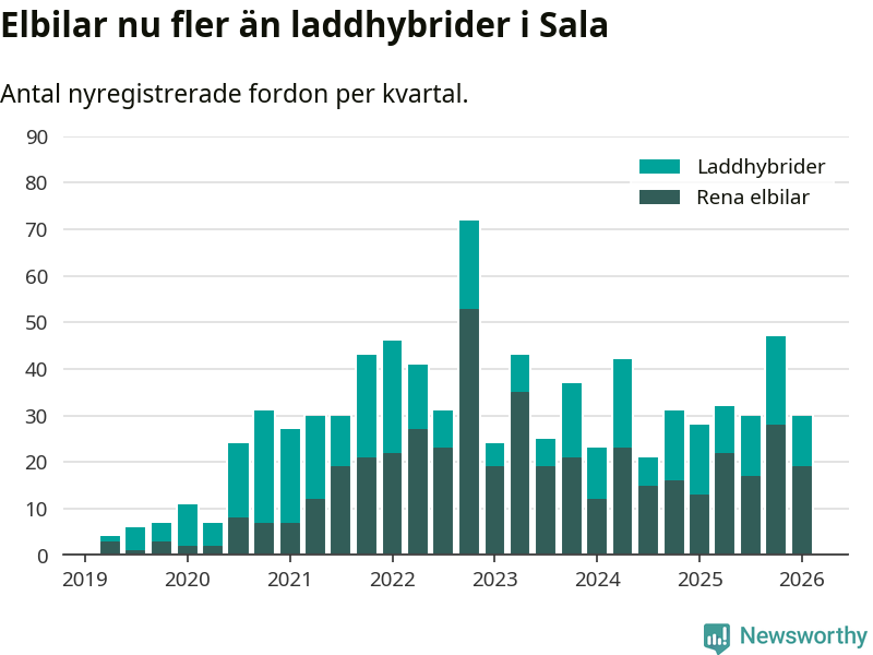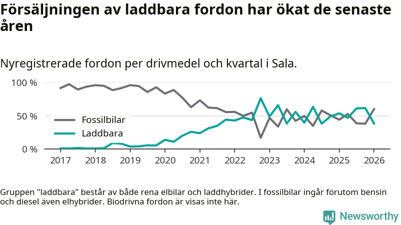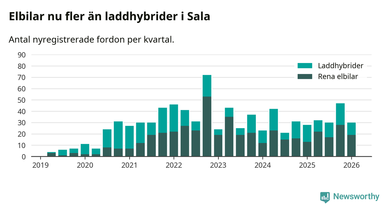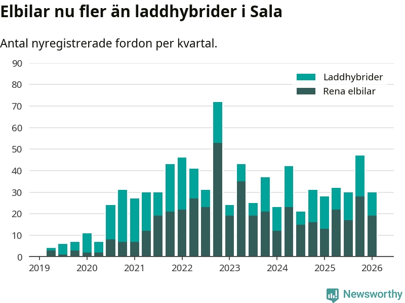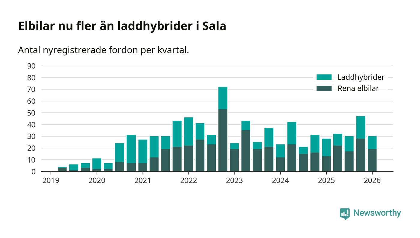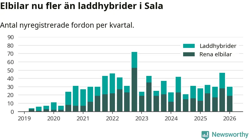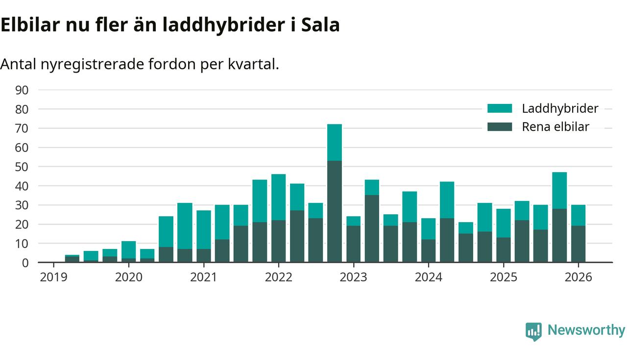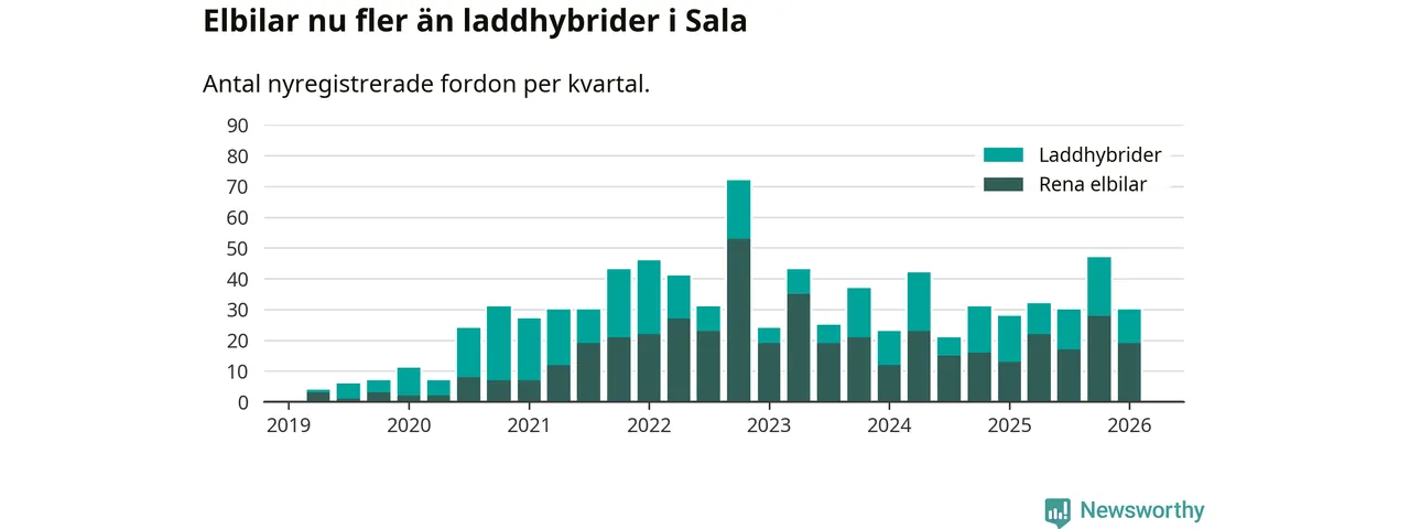 I Sala minskade andelen laddbara bilar under första kvartalet jämfört med kvartalet innan (−23,4 procentenheter). Nyregistreringen peakade under fjärde kvartalet 2022 då 77 procent av de nya bilarna var laddbara.