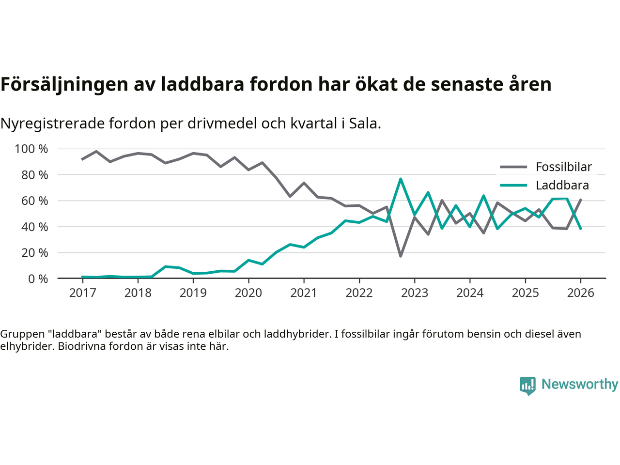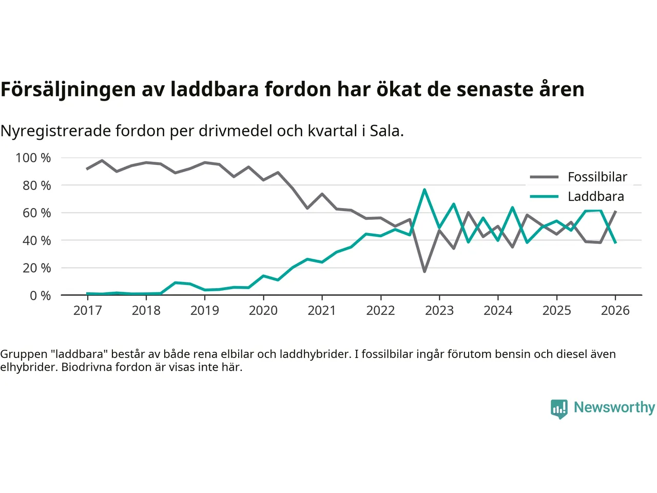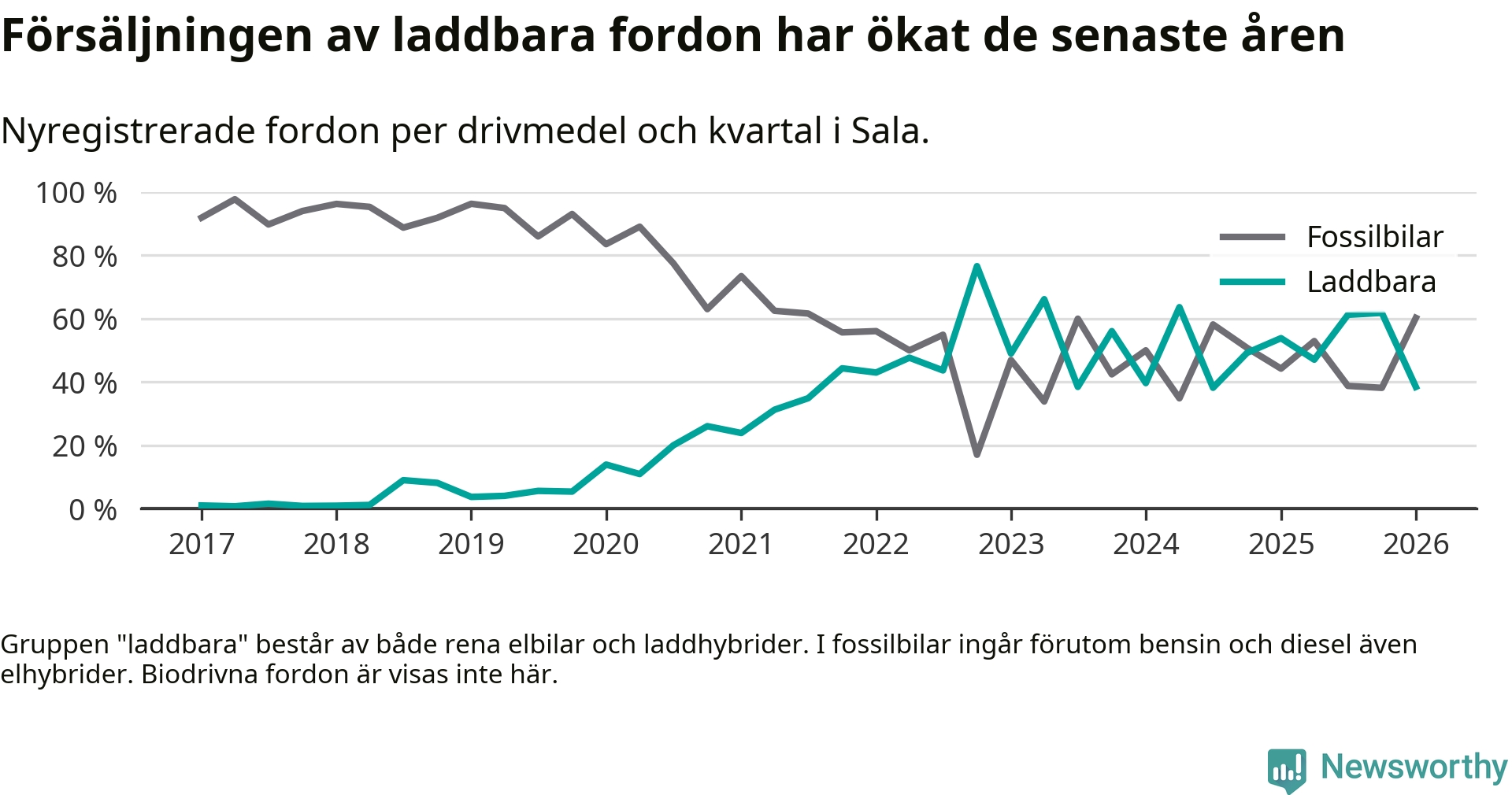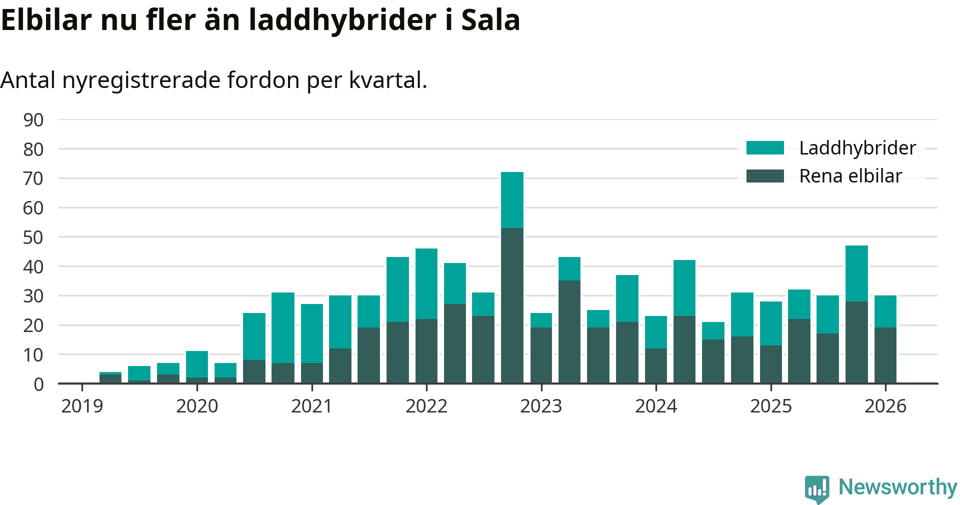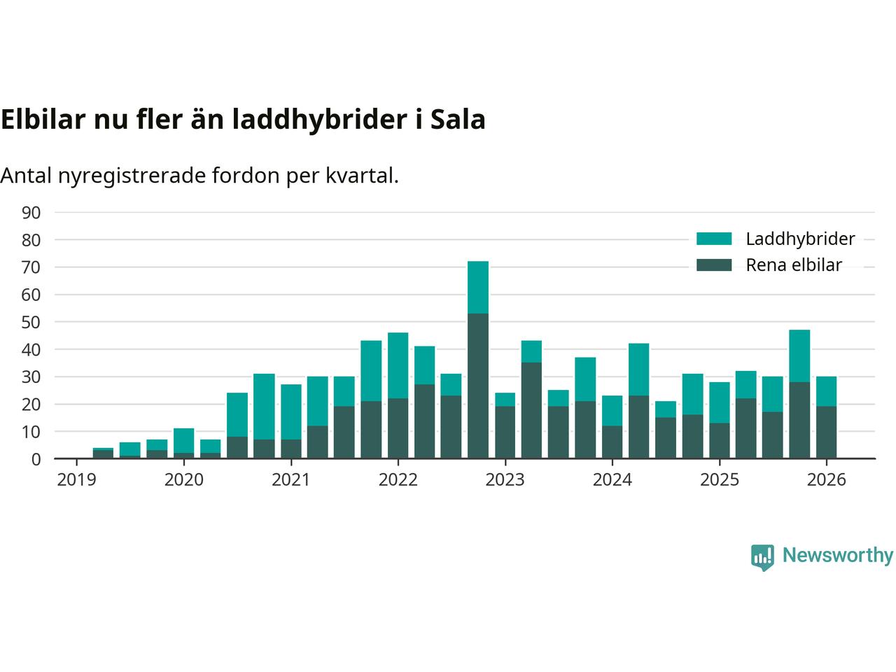 I Sala minskade andelen laddbara bilar under första kvartalet jämfört med kvartalet innan (−23,4 procentenheter). Nyregistreringen peakade under fjärde kvartalet 2022 då 77 procent av de nya bilarna var laddbara.