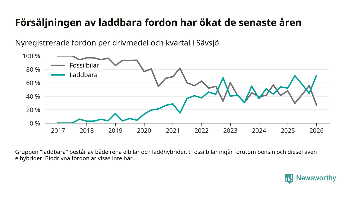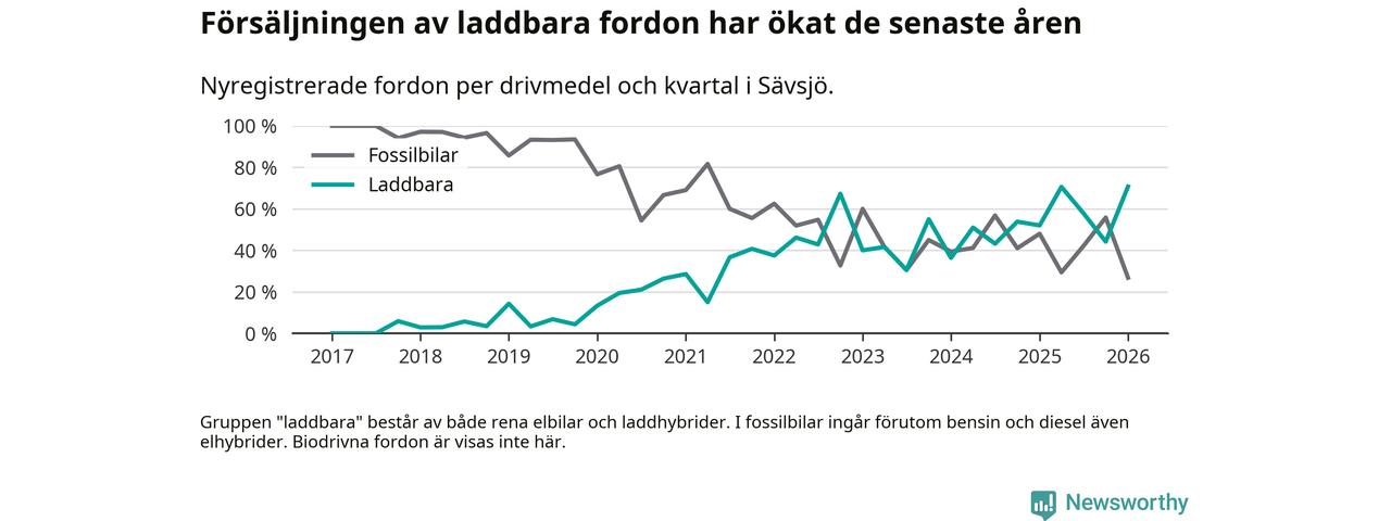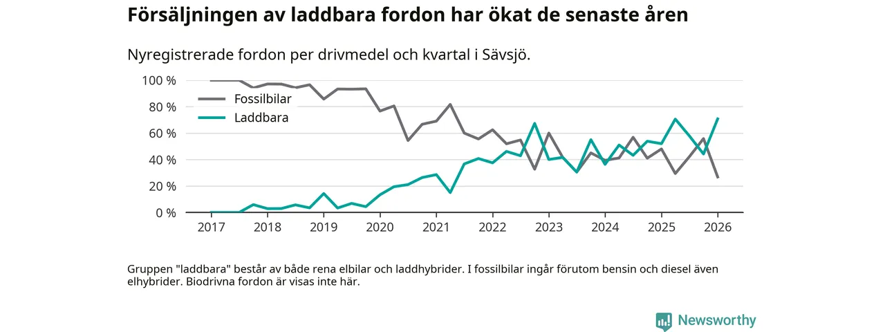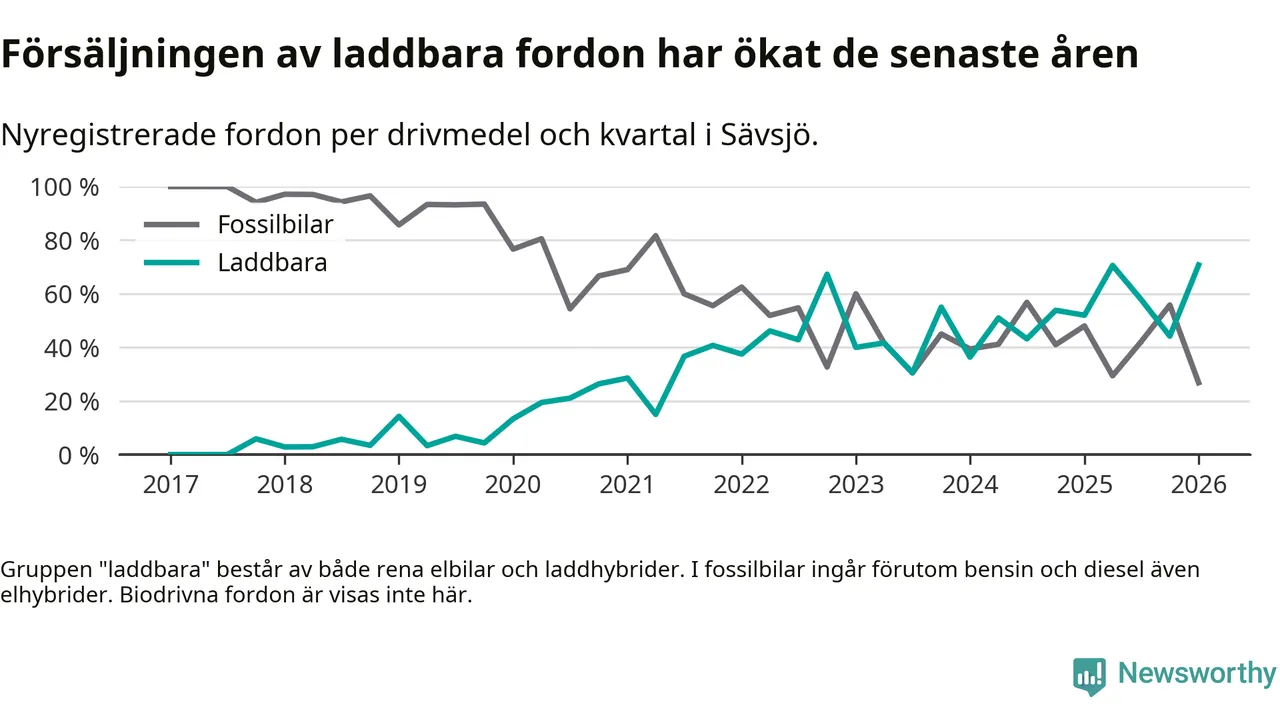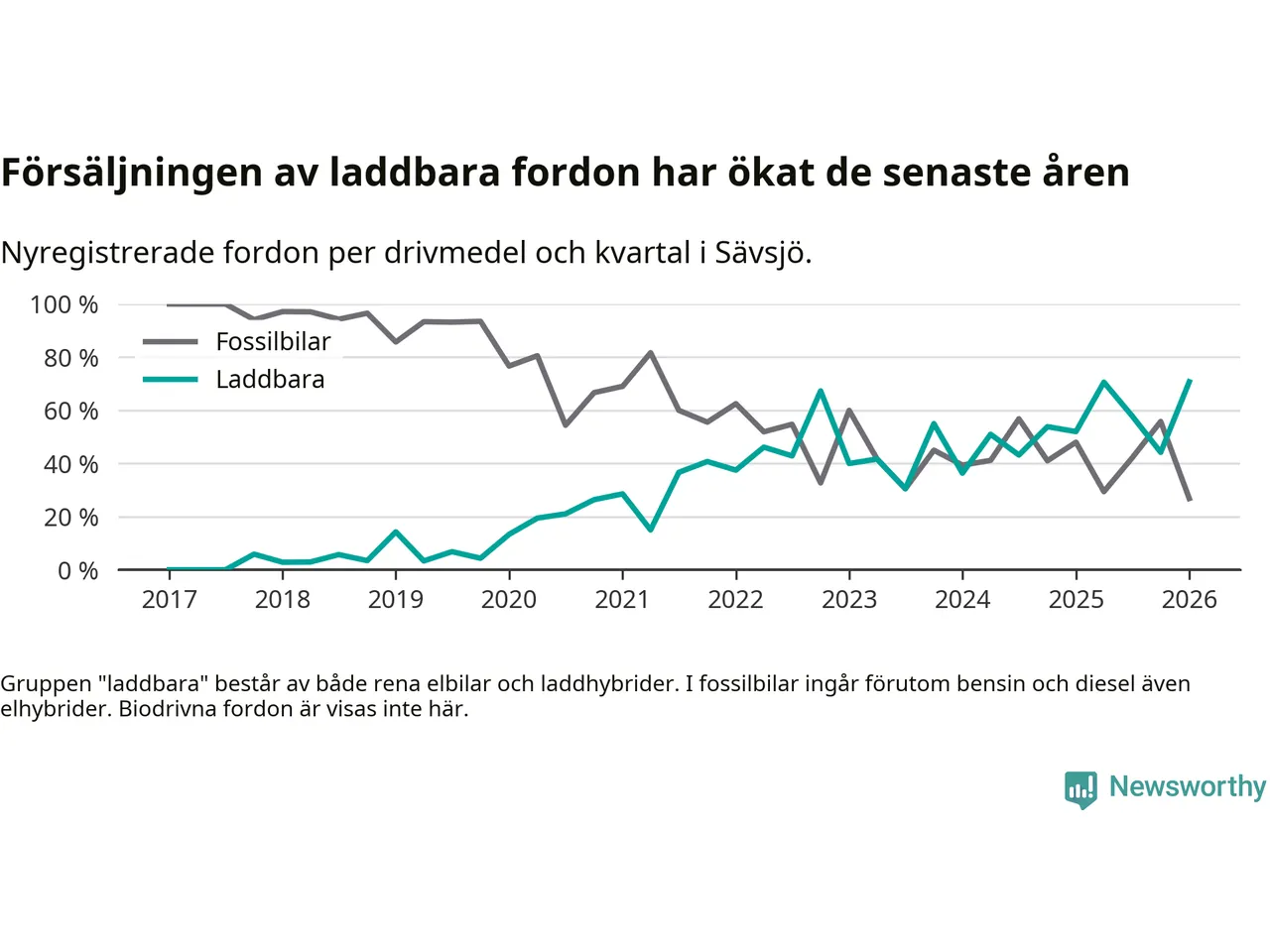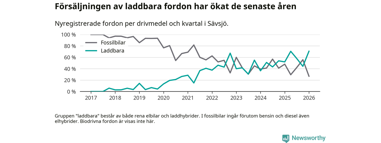 Under första kvartalet 2026 var 71 procent av alla nyregistrerade personbilar i Sävsjö laddbara (sammanlagt registrerades 41 nya bilar). Merparten av de laddbara bilarna var rena elbilar (44 procent av alla).