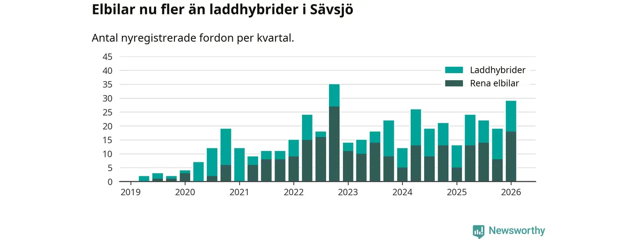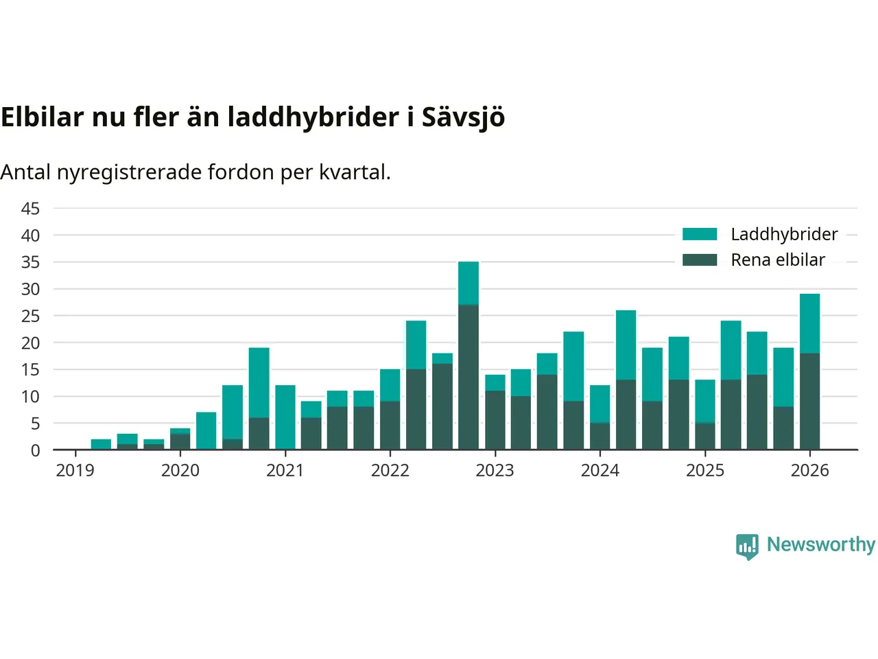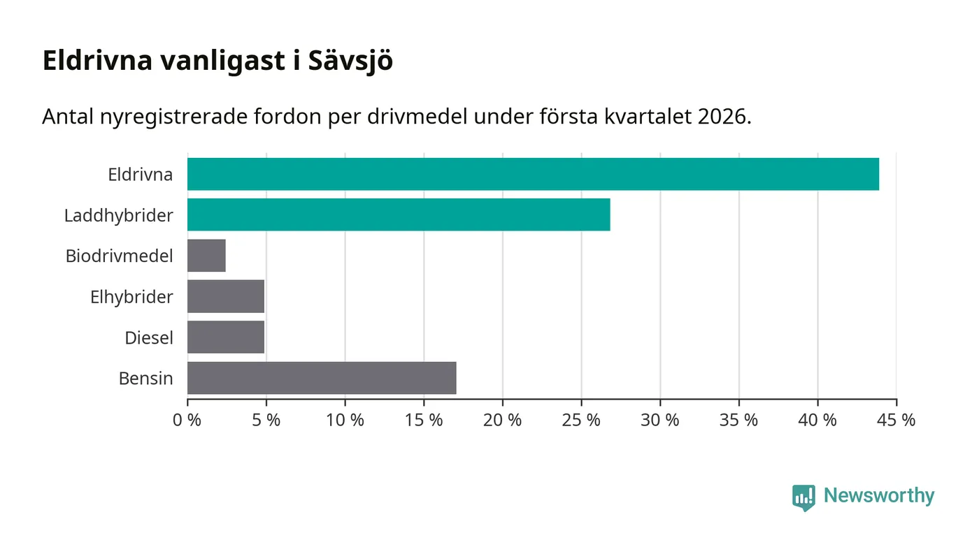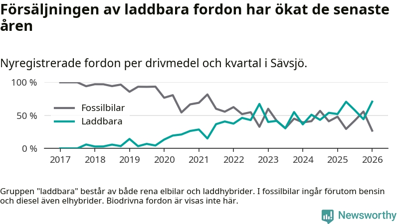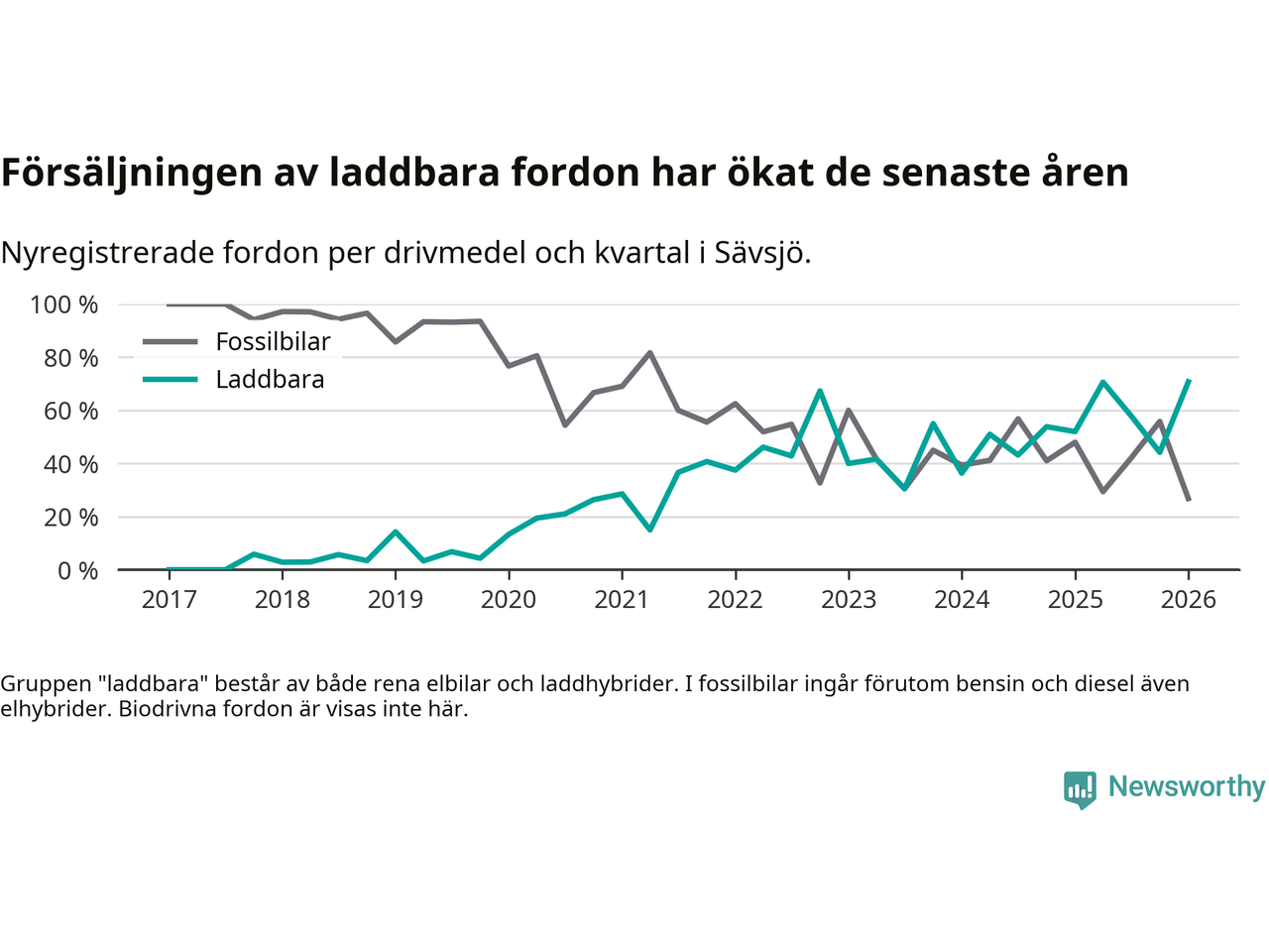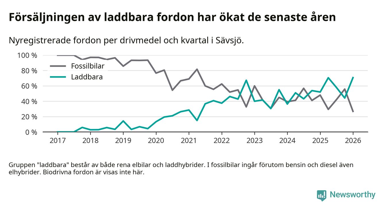 Under första kvartalet 2026 var 71 procent av alla nyregistrerade personbilar i Sävsjö laddbara (sammanlagt registrerades 41 nya bilar). Merparten av de laddbara bilarna var rena elbilar (44 procent av alla).