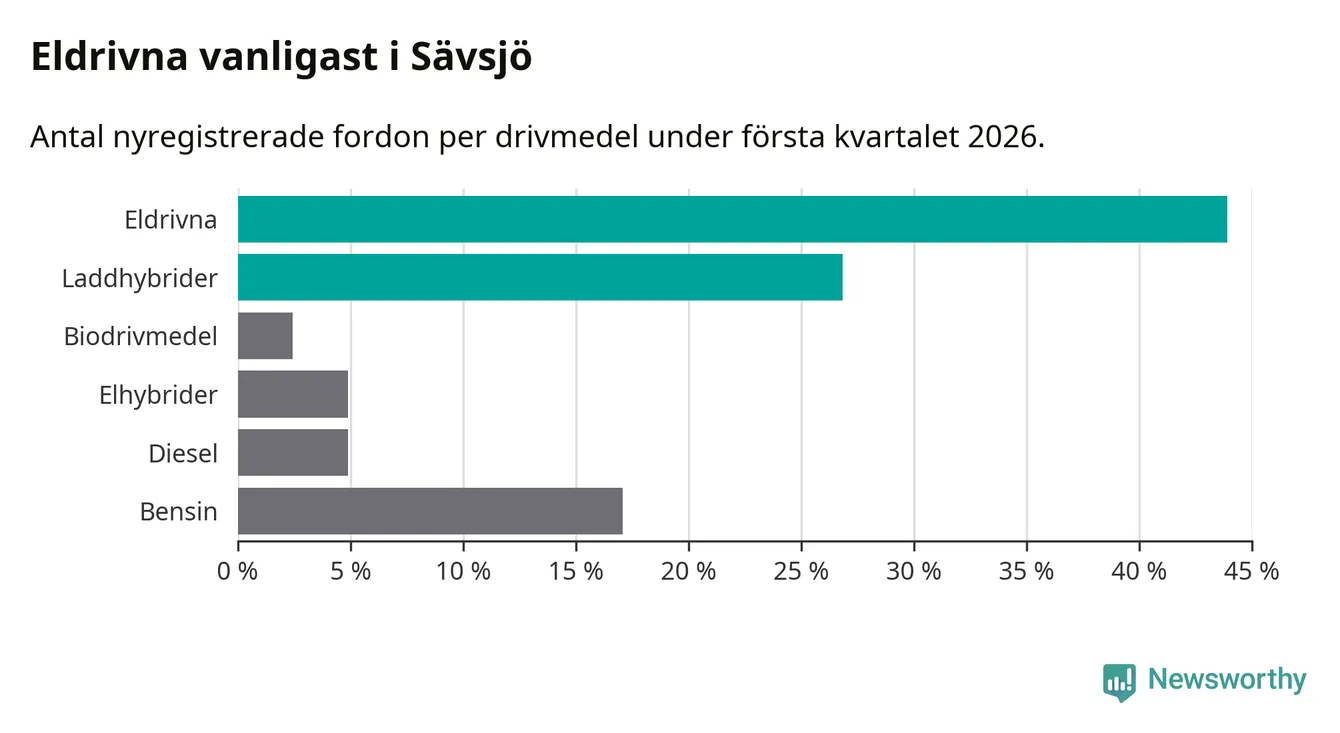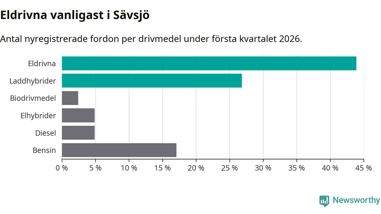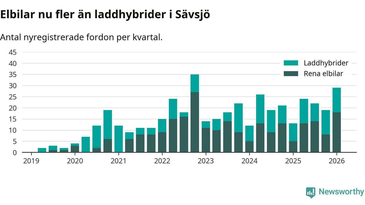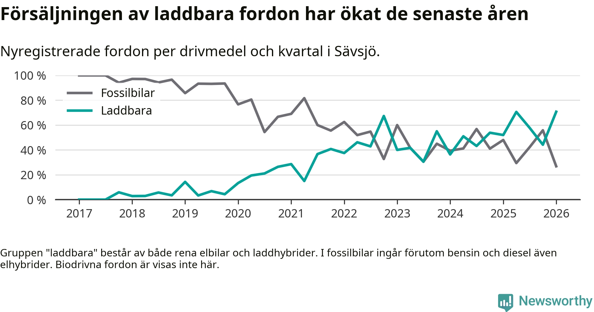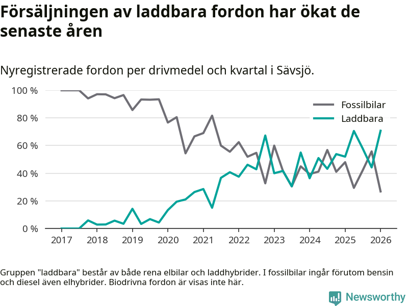 Under första kvartalet 2026 var 71 procent av alla nyregistrerade personbilar i Sävsjö laddbara (sammanlagt registrerades 41 nya bilar). Merparten av de laddbara bilarna var rena elbilar (44 procent av alla).