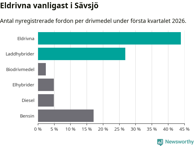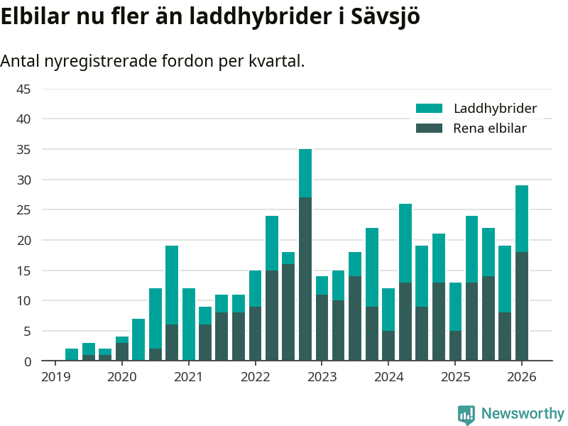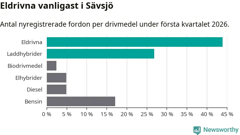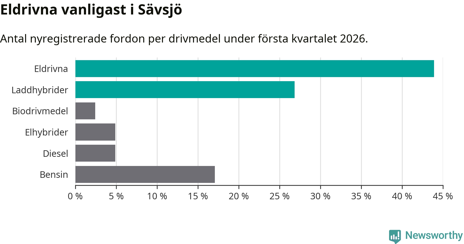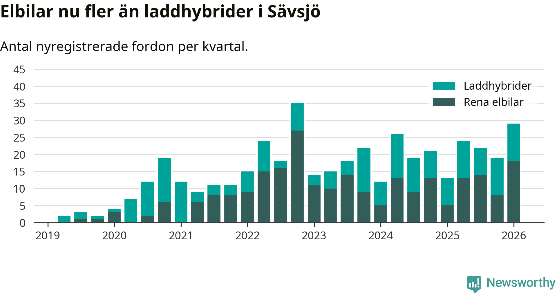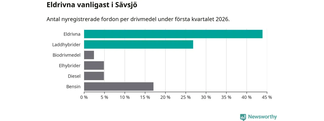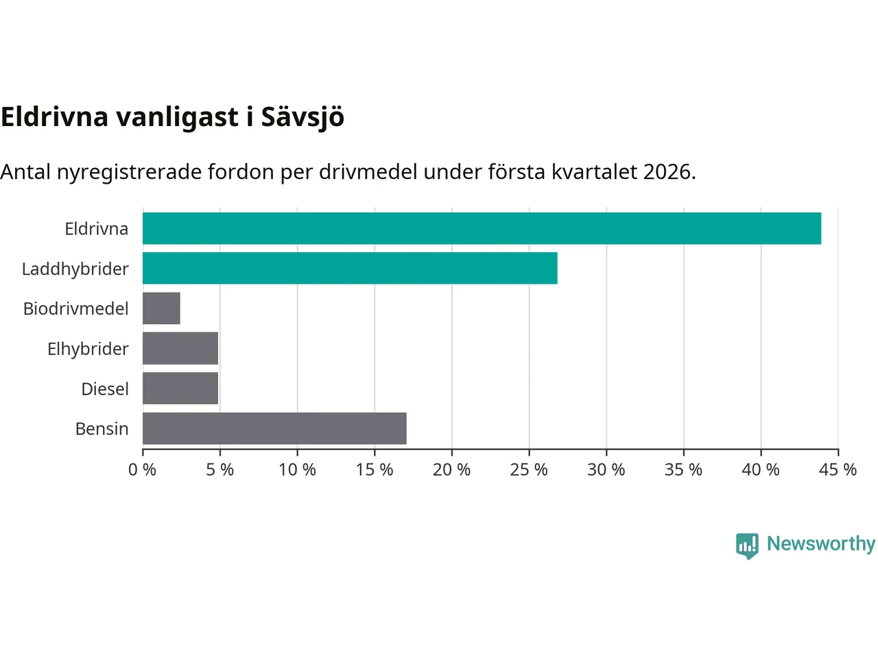 Under första kvartalet 2026 var 71 procent av alla nyregistrerade personbilar i Sävsjö laddbara (sammanlagt registrerades 41 nya bilar). Merparten av de laddbara bilarna var rena elbilar (44 procent av alla).